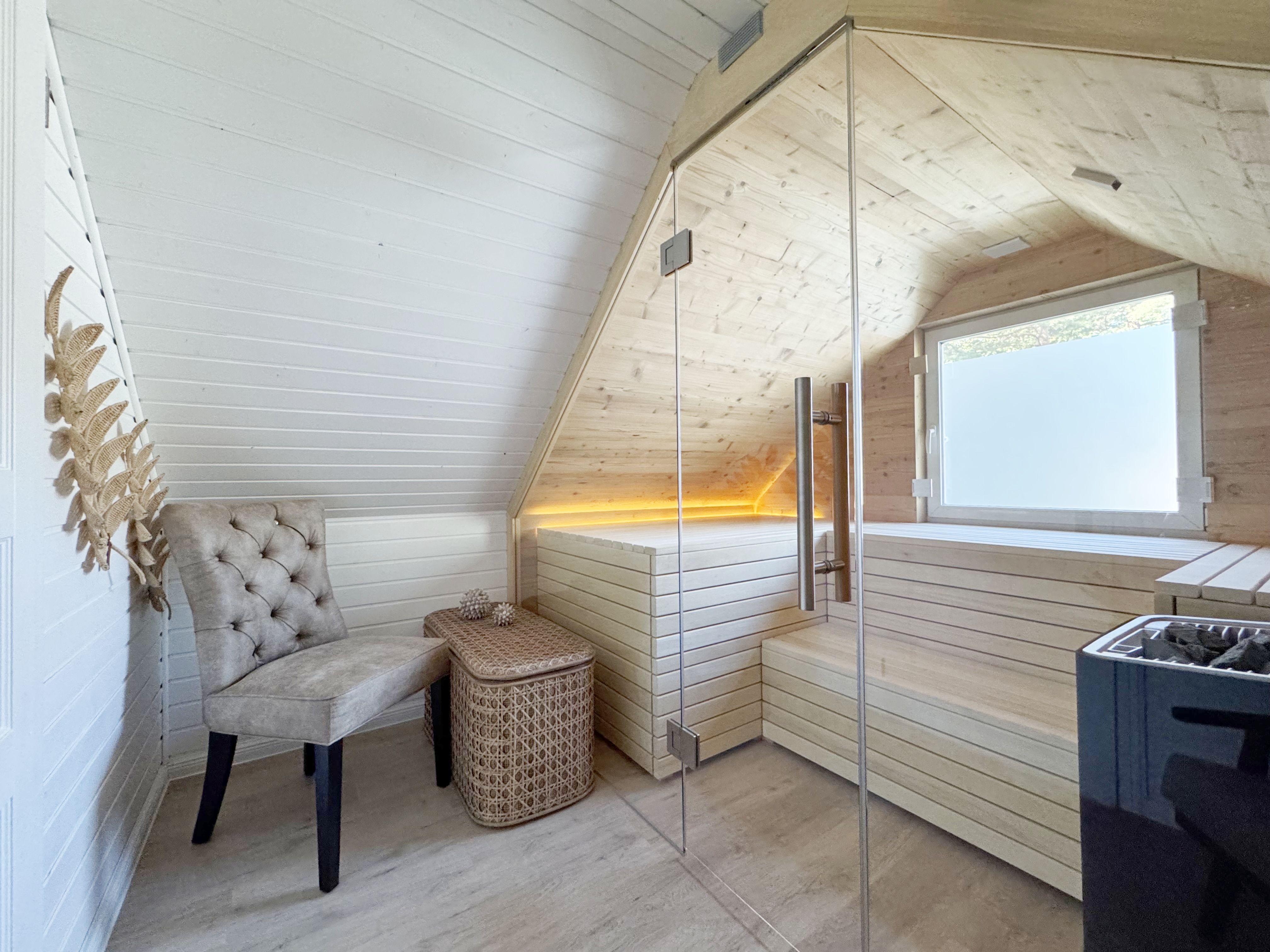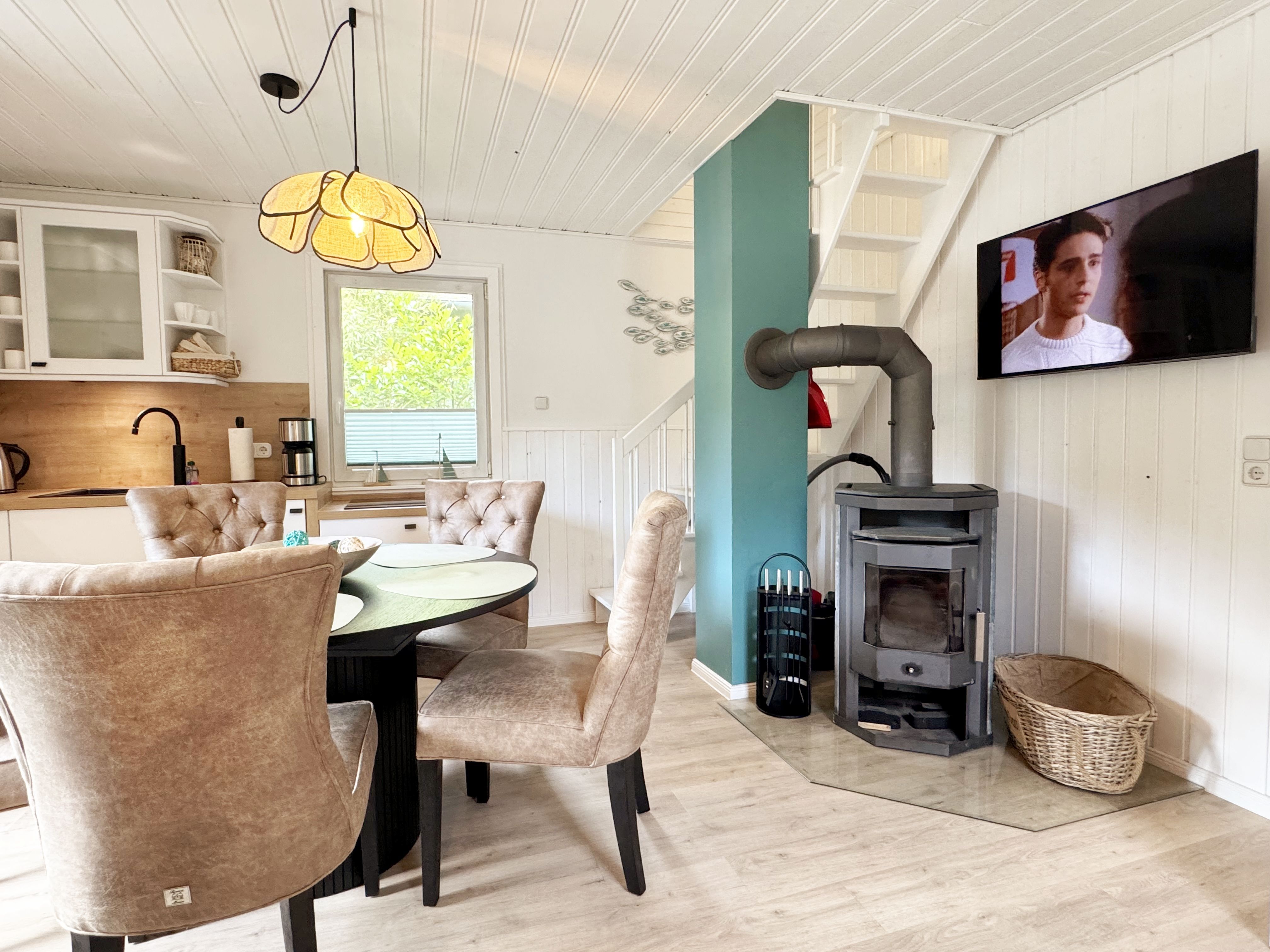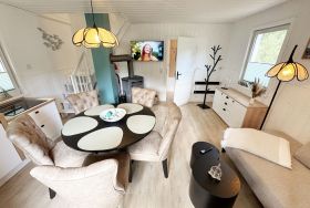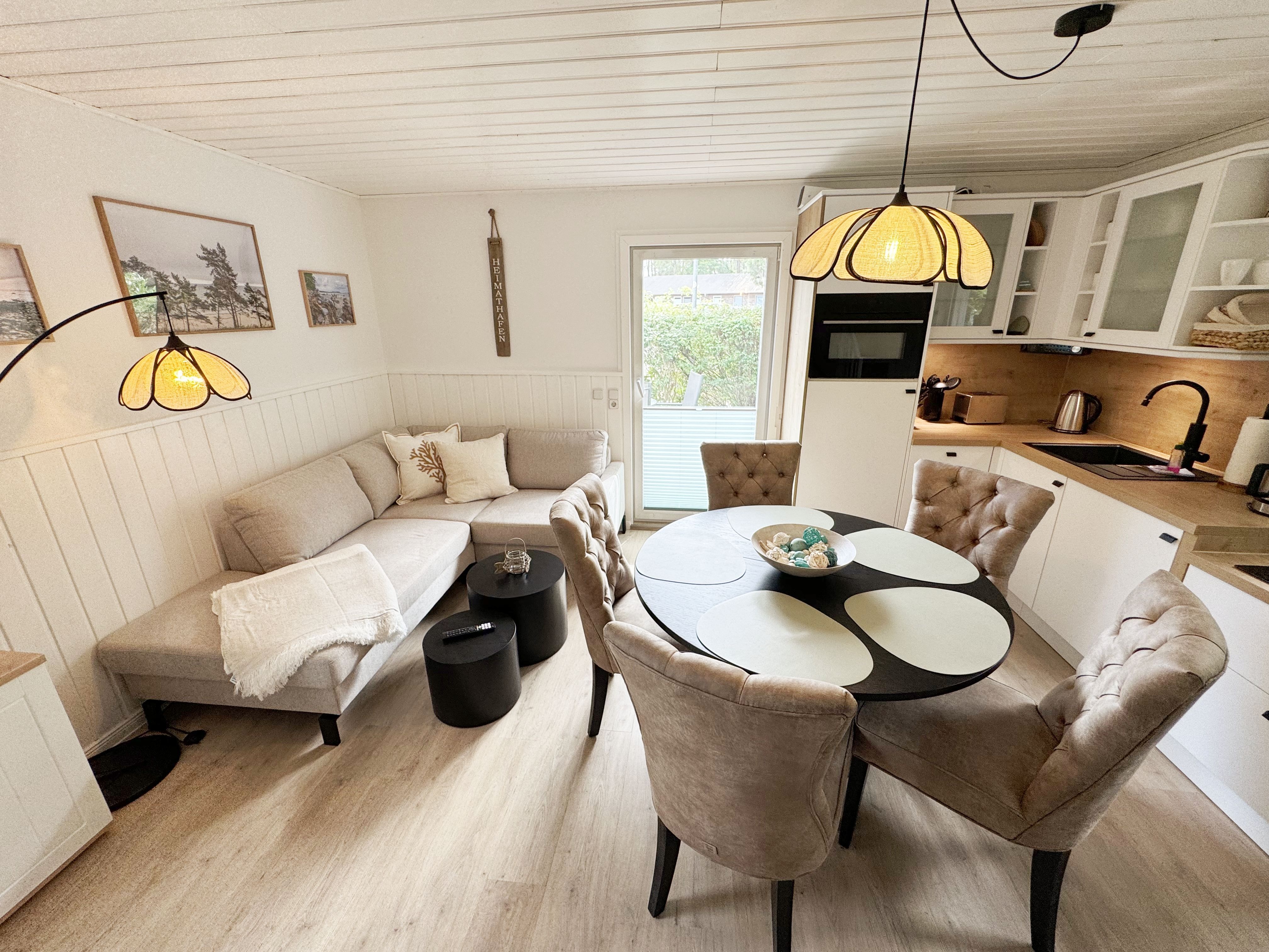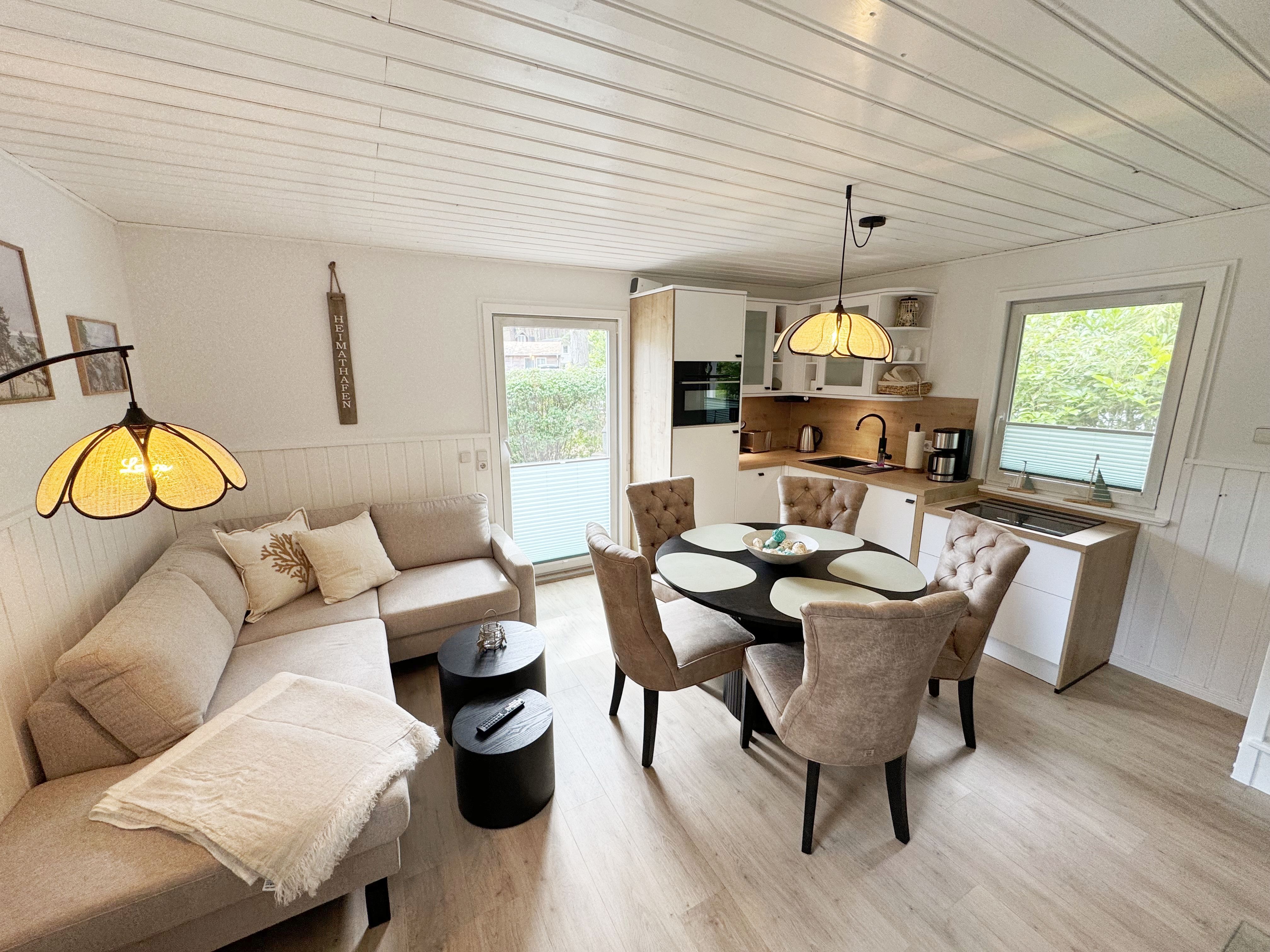 Das gemütliche 2005 in holzbauweise errichtete und 2025 renovierte Ferienhaus Strandmelodie (Nr.08c) mit einer Wohnfläche von 59 m² finden sie im Dünenpark Baabe, umgeben von Meer und Wald. Das optimal für 2 bis 4 Erwachsene + 1 Kleinkind bis 3 Jahre im Kinderreisebett ausgerichtete tierfreundliche Nichtraucherhaus betreten sie über einen kleinen Eingangsflur mit Garderobe. Im Erdgeschoß befindet sich der Wohn- und Essbereich mit gemütlicher Wohnlandschaft mit Urlaubslektüre, Stehlampe, Smart-TV, DAB-Radio mit Bluetooth und auch für einen Internetzugang ist gesorgt. Dieser ist für sie inklusive. Wer es abends noch etwas gemütlicher mag, der zündet sich den Kamin an und lässt den Tag bei einem prasselnden Feuer und einem Glas Wein ausklingen. Dem Wohnbereich angeschlossen ist die Einbauküche mit Geschirrspüler, Kühlschrank mit Gefrierfach, Ceranfeld, Backofen, Mikrowelle, Kaffeemaschine, Eierkocher, Wasserkocher und Waschmaschine mit Trocknerfunktion. Am Esstisch finden alle Personen Platz, wo auch für ein Hochstuhl gesorgt ist. Direkt vom Wohn-& Essbereich haben sie die Möglichkeit die Terrasse zu betreten, welche mit bequemen Terrassenmöbeln, einem Steingrill, einer Überdachung und Sonnenschutz ausgestattet ist. Das freundlich eingerichtete Schlafzimmer ist mit einem Boxspringbett (1,60m x 2,00m) mit verstellbaren Lattenrosten, Nachttischkonsole, Leseleuchten, Kleiderablage, einem Safe, einem Smart-TV, Verdunklungsmöglichkeiten und Kleiderschrank ausgestattet. Auf gleicher Ebene befindet sich das Tageslicht-Bad mit ebenerdiger Dusche, Waschplatz, Fön, Kosmetikspiegel, Insektenschutzgitter und WC. Über eine Holztreppe erreichen sie das Obergeschoß zum 2. Schlafzimmer mit 2 Einzelboxspringbetten (je 0,90m 2,00m), Ablagemöglichkeiten, Leseleuchten, Verdunklungsmöglichkeit, einem kleinen Sitzbereich und einer Kommode zur Kleiderablage. Im Vorflur befindet sich zusätzlich ein Einbauschrank, wo Sie Ihre Kleidung zudem auch aufhängen können. Unsere bis zu 100° beheizbare Trockensauna befindet im angrenzenden Nebenraum mit Blick ins Grüne.Im kleinen Vorraum befindet sich eine Sitzgelegenheit zum entspannen. Das Haus verfügt in allen Räumen über eine Fußbodenheizung und in den Schlafräumen, Wohn-& Essbereich befinden sich vor den Fenstern Insektenschutzgitter, die Ihnen einen ruhigen Schlaf ermöglichen. Ihre geliehenen oder mitgebrachten Fahrräder/E-Bikes können sie in dem am Haus befindlichen Fahrradschuppen mit Auflademöglichkeit sicher unterbringen. Ein Haustier ist mit seinem eigenen Schlafplatz gegen eine Gebühr ein gern gesehener Gast. Ihr PKW-Stellplatz (Nr.08c) befindet sich in unmittelbarer Nähe und in Sichtweite. Die Erstausstattung eines Wäschepaketes (komplette Bettwäsche, 1 Duschhandtuch, 2 kleine Handtücher) können Sie bis 14 Tage vor Anreise gegen einen Aufpreis dazu buchen oder durch eigenes Ergänzen. Ab 2 gebuchten Paketen erhalten Sie einmalig 1 Geschirrhandtuch und 1 Duschvorleger hinzu.