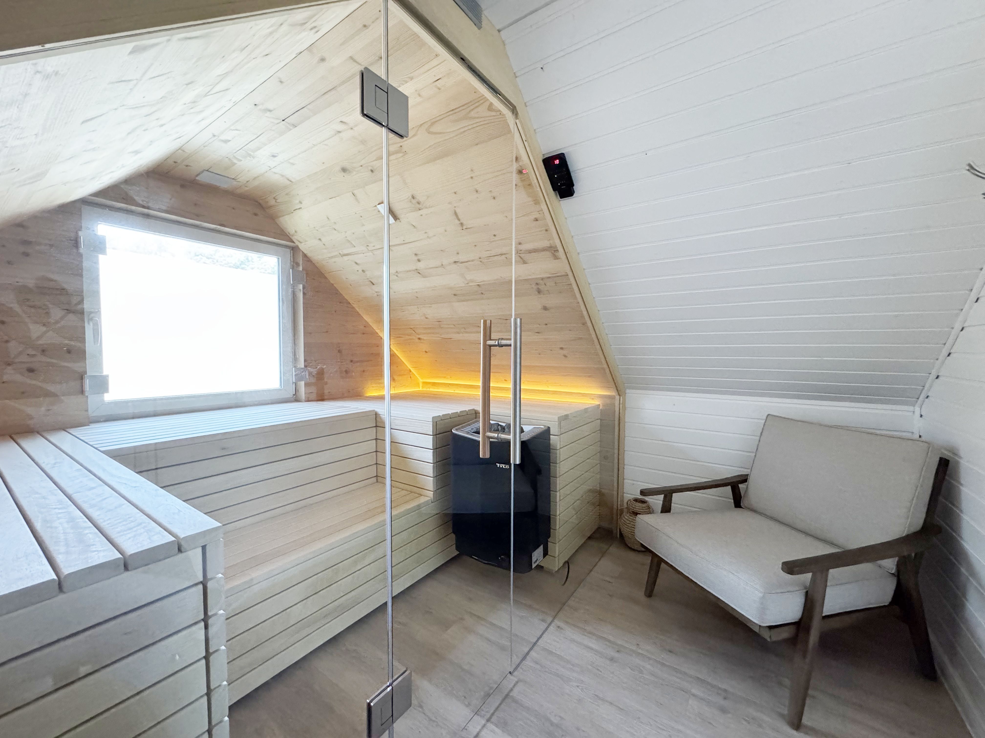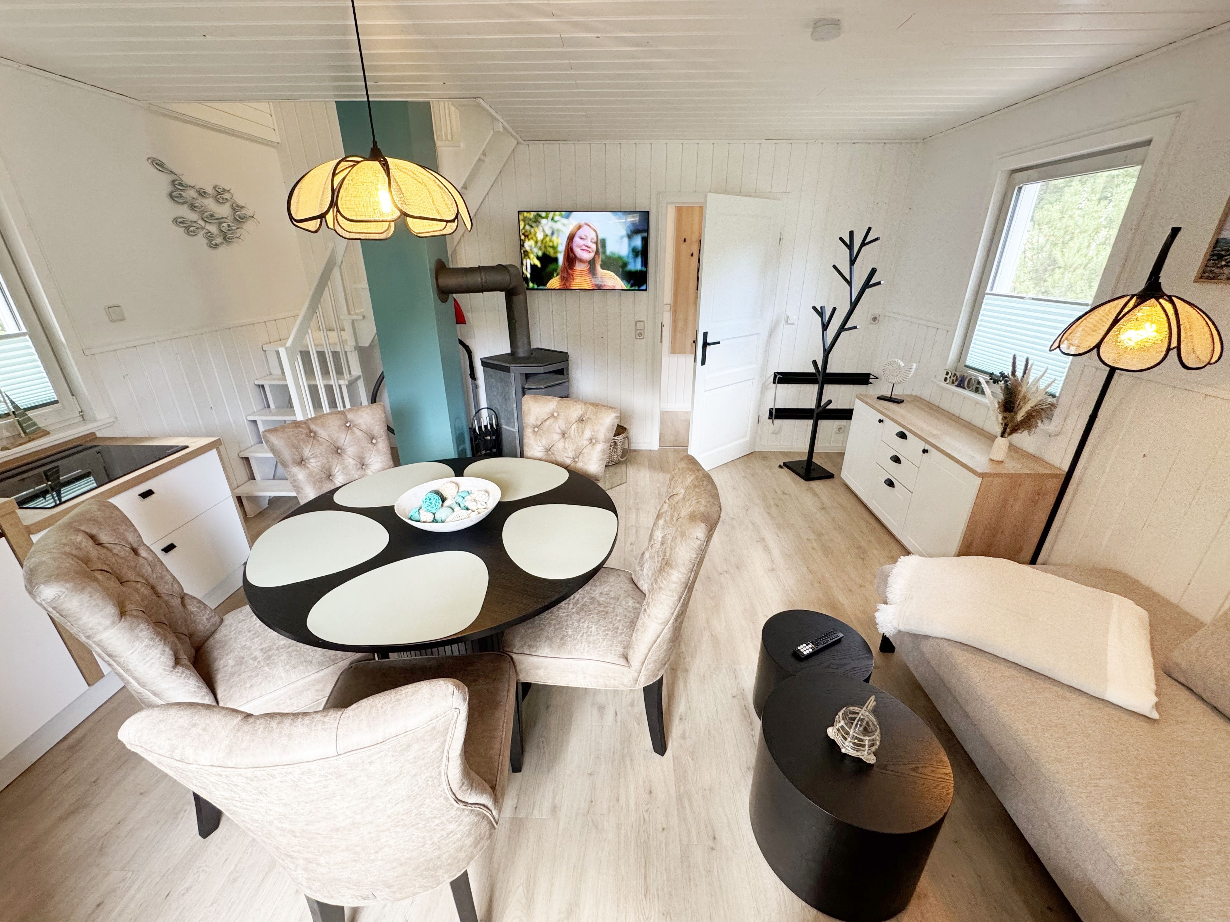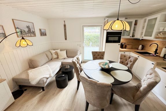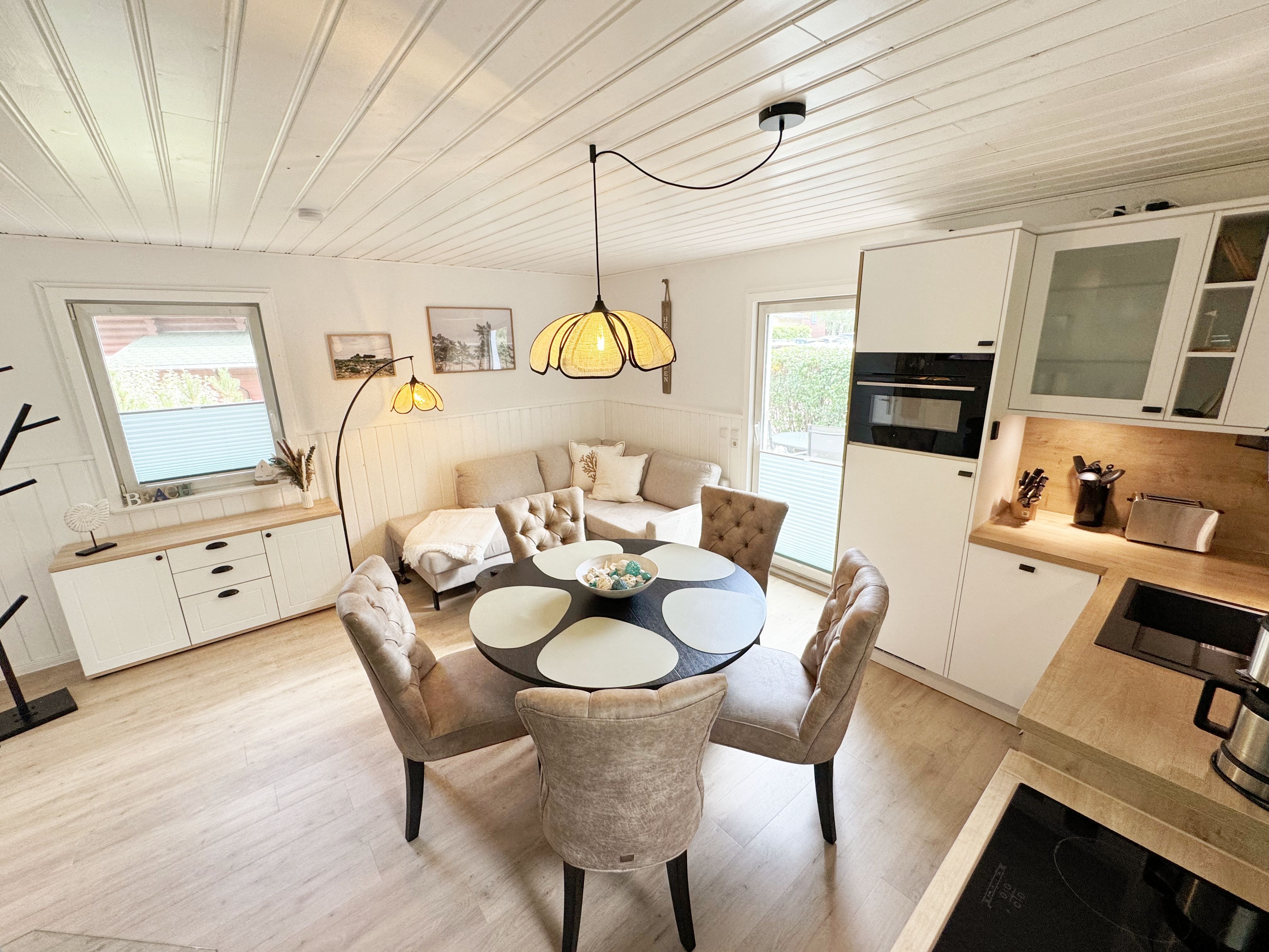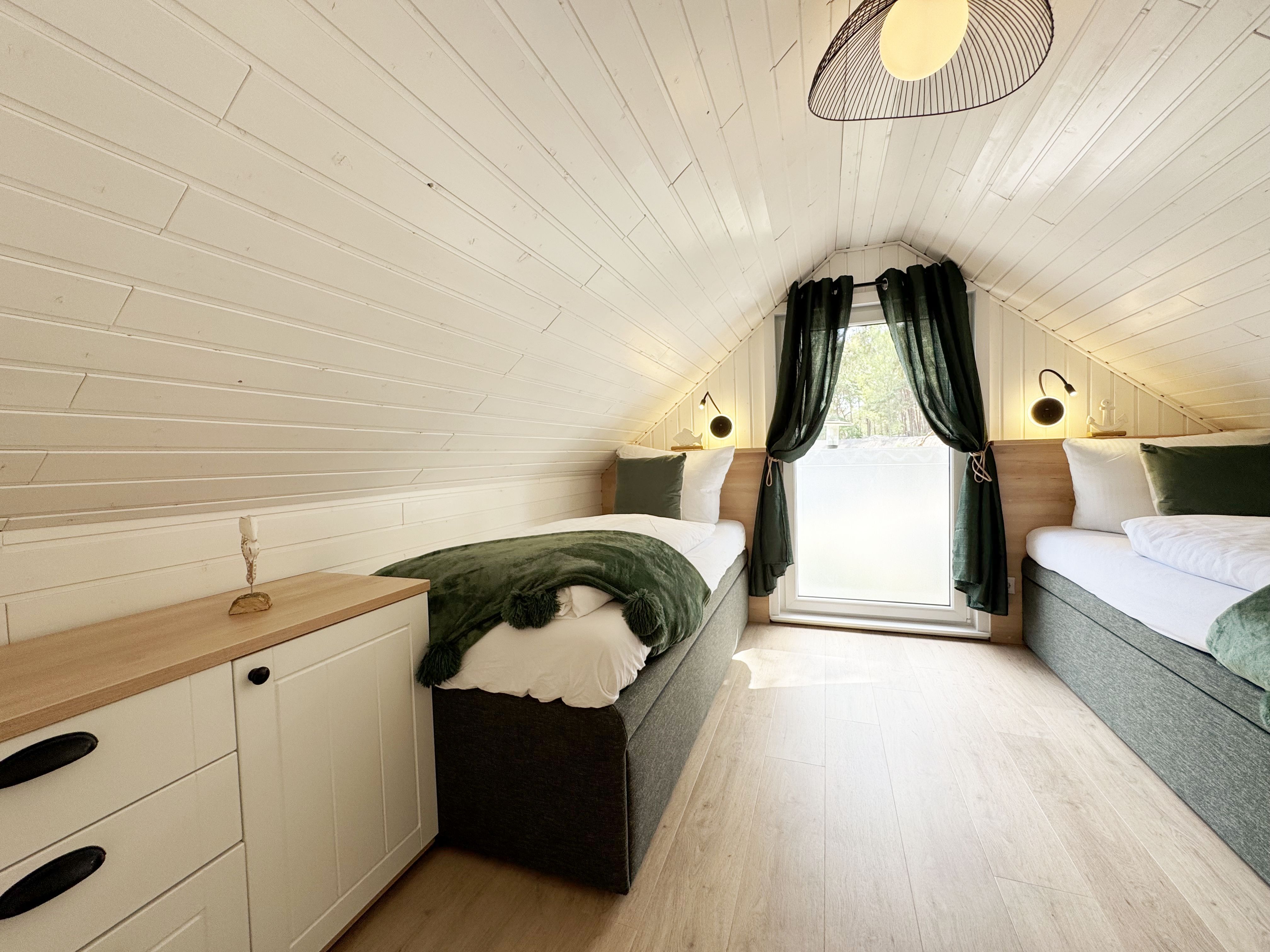 Das gemütliche 2005 in holzbauweise errichtete und 2025 renovierte Ferienhaus Strandmelodie (Nr.08c) mit einer Wohnfläche von 59 m² finden sie im Dünenpark Baabe, umgeben von Meer und Wald. Das optimal für 2 bis 4 Erwachsene + 1 Kleinkind bis 3 Jahre im Kinderreisebett ausgerichtete tierfreundliche Nichtraucherhaus betreten sie über einen kleinen Eingangsflur mit Garderobe. Im Erdgeschoß befindet sich der Wohn- und Essbereich mit gemütlicher Wohnlandschaft mit Urlaubslektüre, Stehlampe, Smart-TV, DAB-Radio mit Bluetooth und auch für einen Internetzugang ist gesorgt. Dieser ist für sie inklusive. Wer es abends noch etwas gemütlicher mag, der zündet sich den Kamin an und lässt den Tag bei einem prasselnden Feuer und einem Glas Wein ausklingen. Dem Wohnbereich angeschlossen ist die Einbauküche mit Geschirrspüler, Kühlschrank mit Gefrierfach, Ceranfeld, Backofen, Mikrowelle, Kaffeemaschine, Eierkocher, Wasserkocher und Waschmaschine mit Trocknerfunktion. Am Esstisch finden alle Personen Platz, wo auch für ein Hochstuhl gesorgt ist. Direkt vom Wohn-& Essbereich haben sie die Möglichkeit die Terrasse zu betreten, welche mit bequemen Terrassenmöbeln, einem Steingrill, einer Überdachung und Sonnenschutz ausgestattet ist. Das freundlich eingerichtete Schlafzimmer ist mit einem Boxspringbett (1,60m x 2,00m) mit verstellbaren Lattenrosten, Nachttischkonsole, Leseleuchten, Kleiderablage, einem Safe, einem Smart-TV, Verdunklungsmöglichkeiten und Kleiderschrank ausgestattet. Auf gleicher Ebene befindet sich das Tageslicht-Bad mit ebenerdiger Dusche, Waschplatz, Fön, Kosmetikspiegel, Insektenschutzgitter und WC. Über eine Holztreppe erreichen sie das Obergeschoß zum 2. Schlafzimmer mit 2 Einzelboxspringbetten (je 0,90m 2,00m), Ablagemöglichkeiten, Leseleuchten, Verdunklungsmöglichkeit, einem kleinen Sitzbereich und einer Kommode zur Kleiderablage. Im Vorflur befindet sich zusätzlich ein Einbauschrank, wo Sie Ihre Kleidung zudem auch aufhängen können. Unsere bis zu 100° beheizbare Trockensauna befindet im angrenzenden Nebenraum mit Blick ins Grüne.Im kleinen Vorraum befindet sich eine Sitzgelegenheit zum entspannen. Das Haus verfügt in allen Räumen über eine Fußbodenheizung und in den Schlafräumen, Wohn-& Essbereich befinden sich vor den Fenstern Insektenschutzgitter, die Ihnen einen ruhigen Schlaf ermöglichen. Ihre geliehenen oder mitgebrachten Fahrräder/E-Bikes können sie in dem am Haus befindlichen Fahrradschuppen mit Auflademöglichkeit sicher unterbringen. Ein Haustier ist mit seinem eigenen Schlafplatz gegen eine Gebühr ein gern gesehener Gast. Ihr PKW-Stellplatz (Nr.08c) befindet sich in unmittelbarer Nähe und in Sichtweite. Die Erstausstattung eines Wäschepaketes (komplette Bettwäsche, 1 Duschhandtuch, 2 kleine Handtücher) können Sie bis 14 Tage vor Anreise gegen einen Aufpreis dazu buchen oder durch eigenes Ergänzen. Ab 2 gebuchten Paketen erhalten Sie einmalig 1 Geschirrhandtuch und 1 Duschvorleger hinzu.