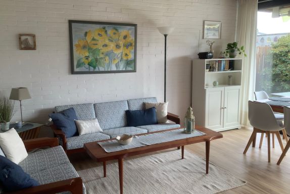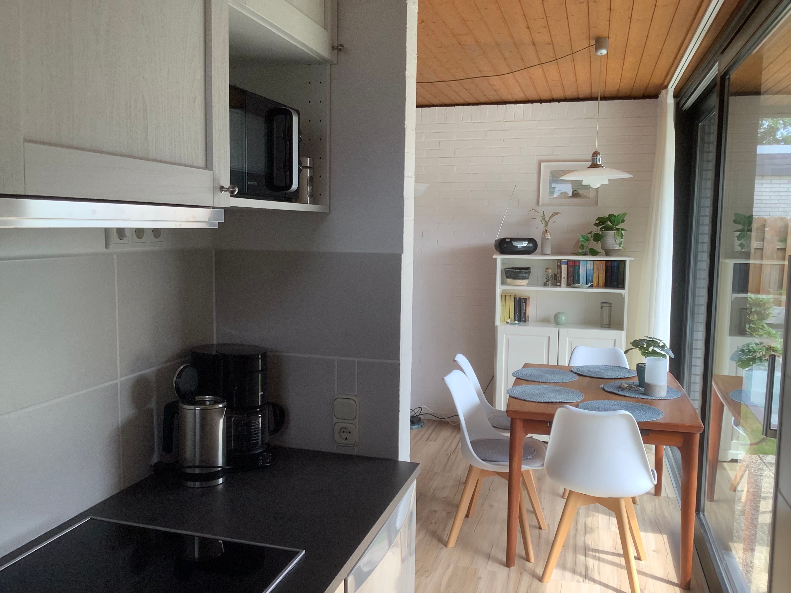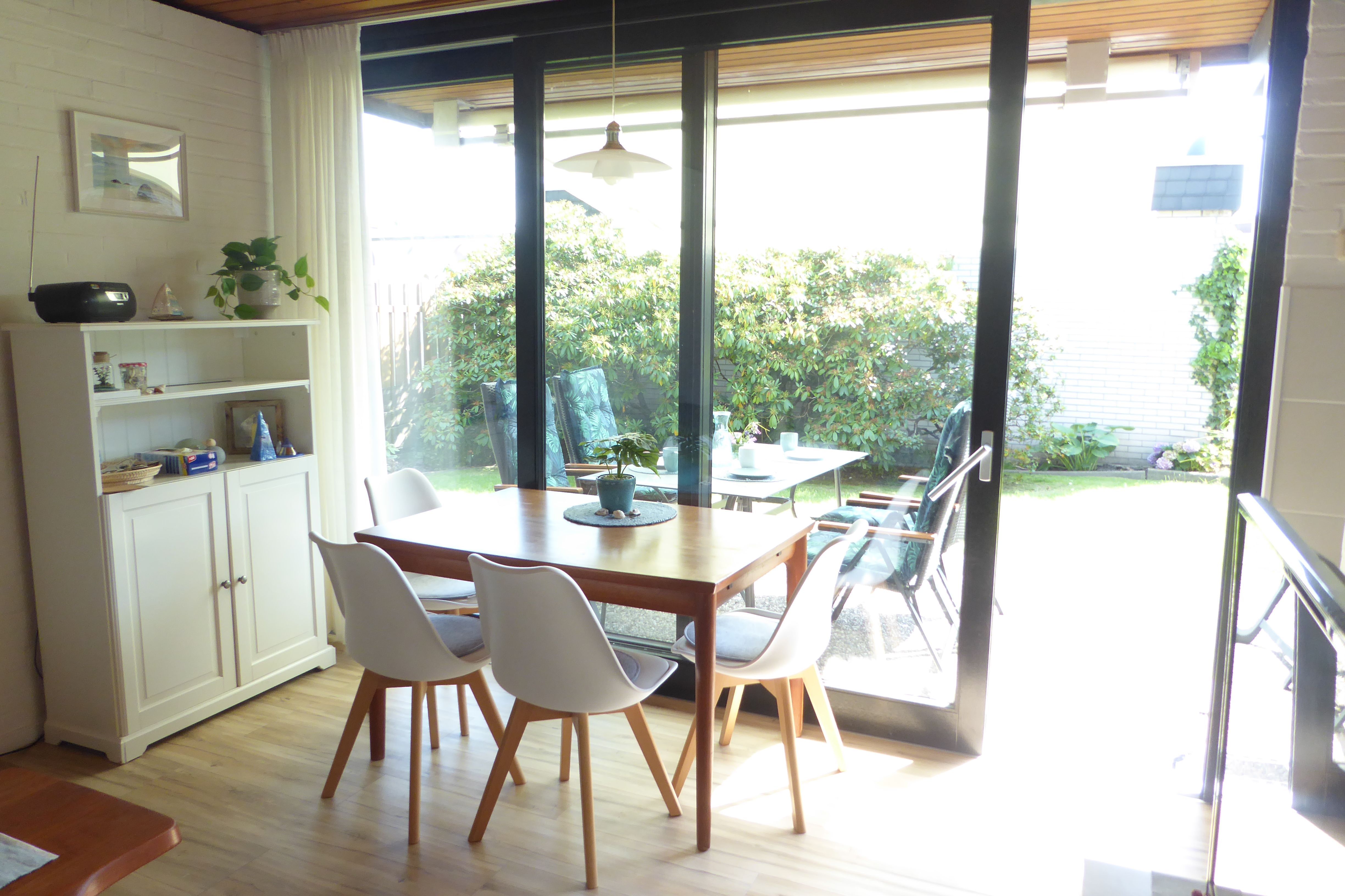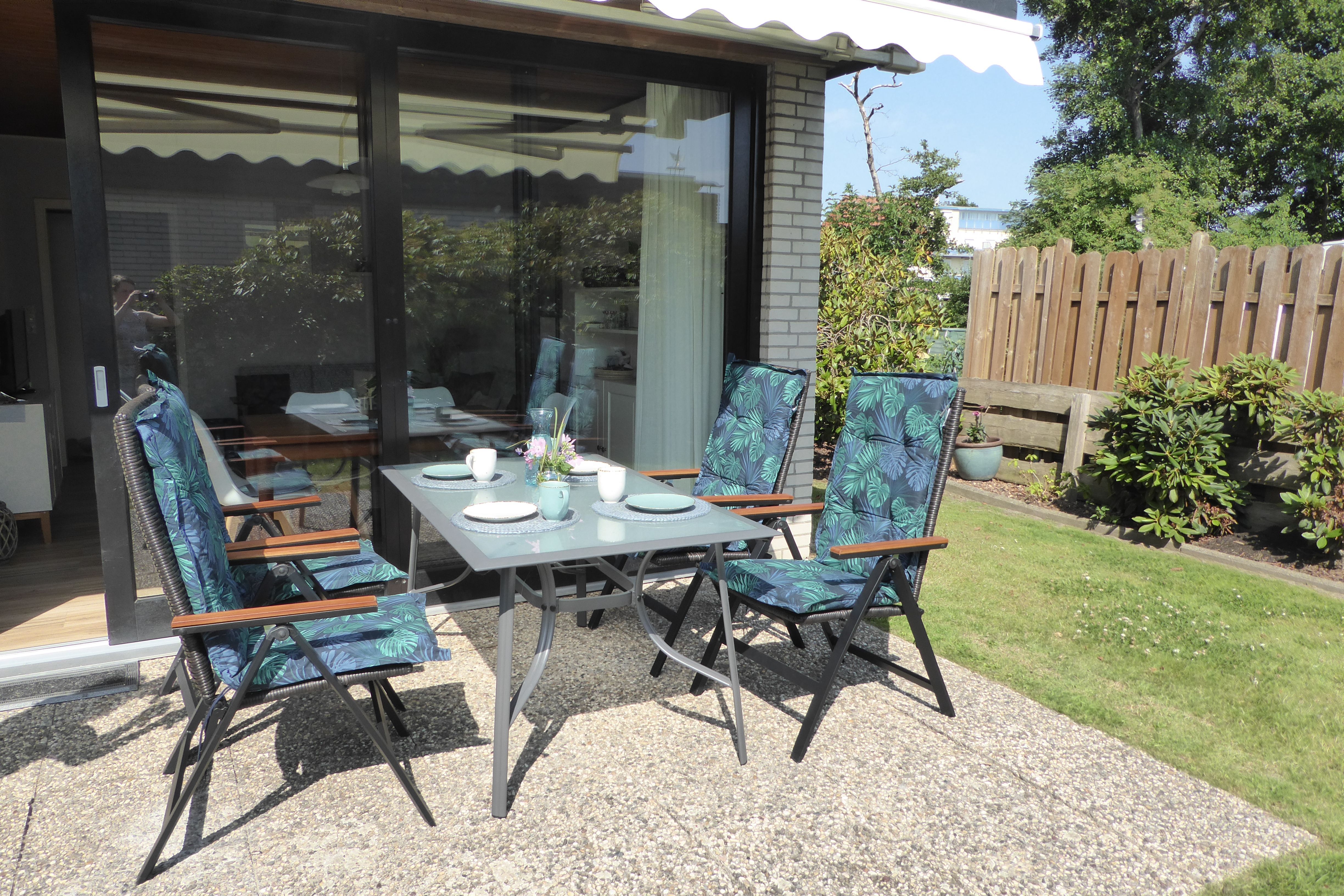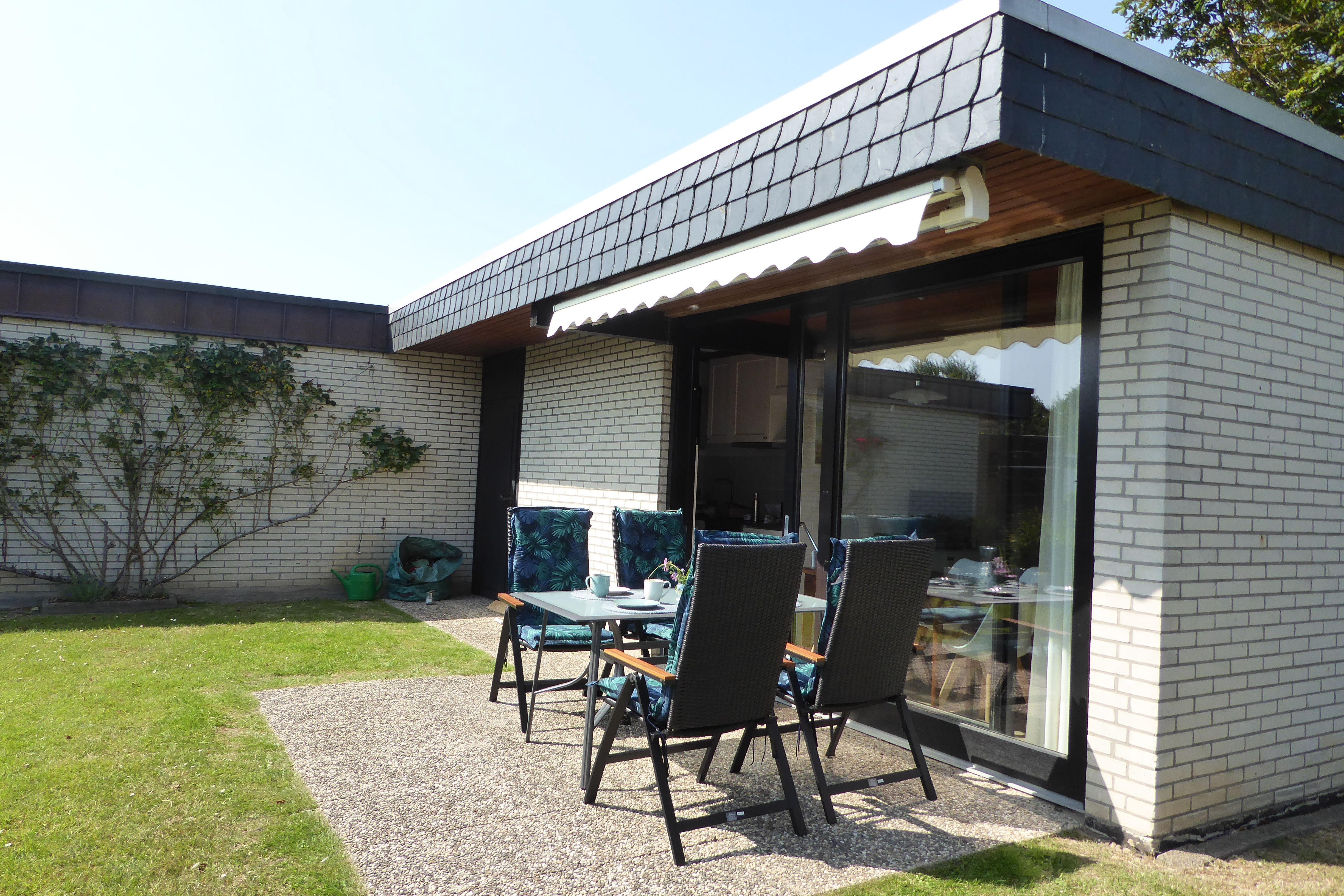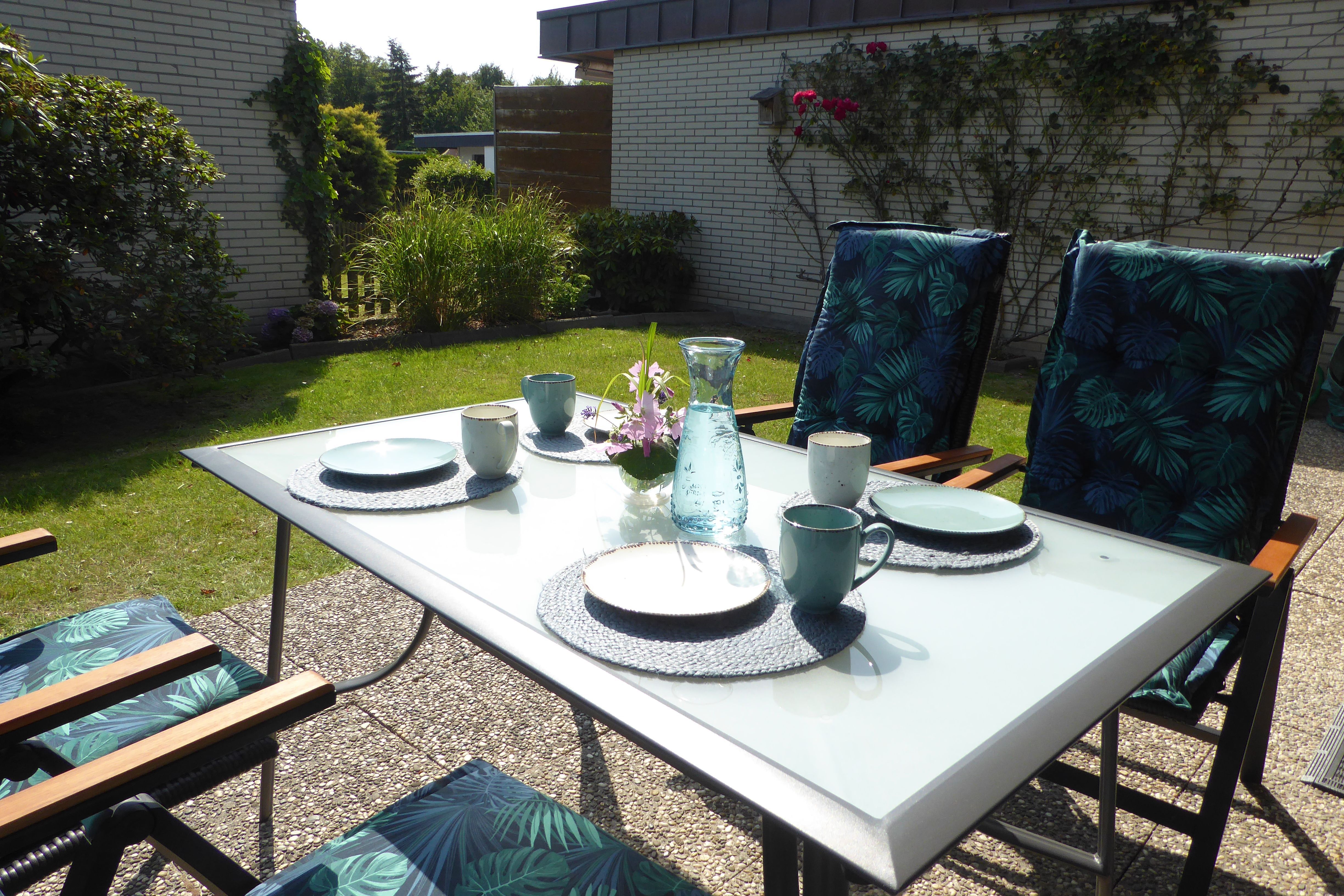 Zum Garten hin gelegen ist eine ca. 20 qm² große Terrasse vom Wohnzimmer aus begehbar. Dort stehen neben Sitz- und Liegemöbeln auch ein Grill im windgeschützten Außenbereich. Außerdem gibt es eine ausfahrbare Markise. Das gesamte Ferienhaus ist neu, modern eingerichtet und wenn doch einmal etwas fehlen sollte, wird Abhilfe geleistet.