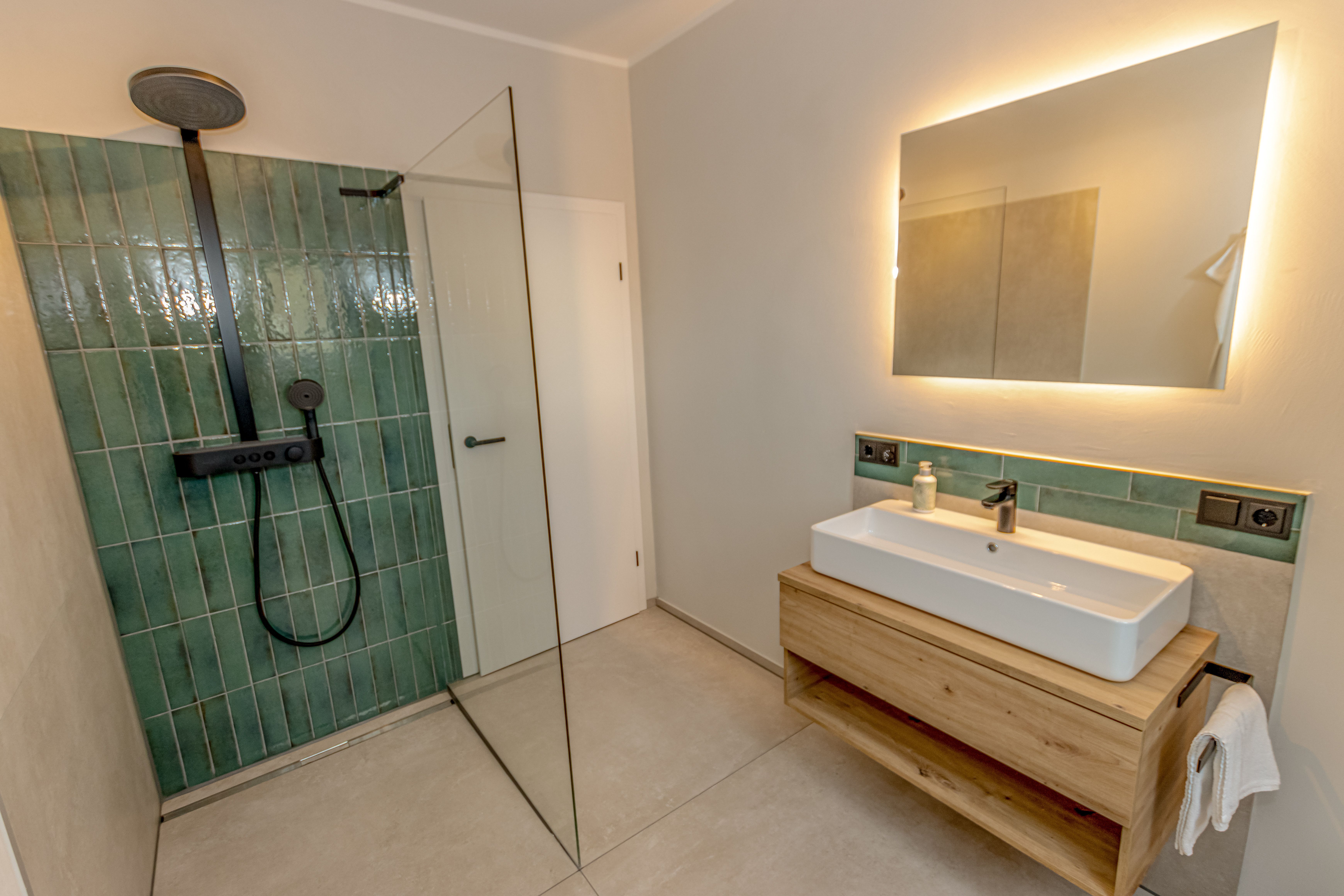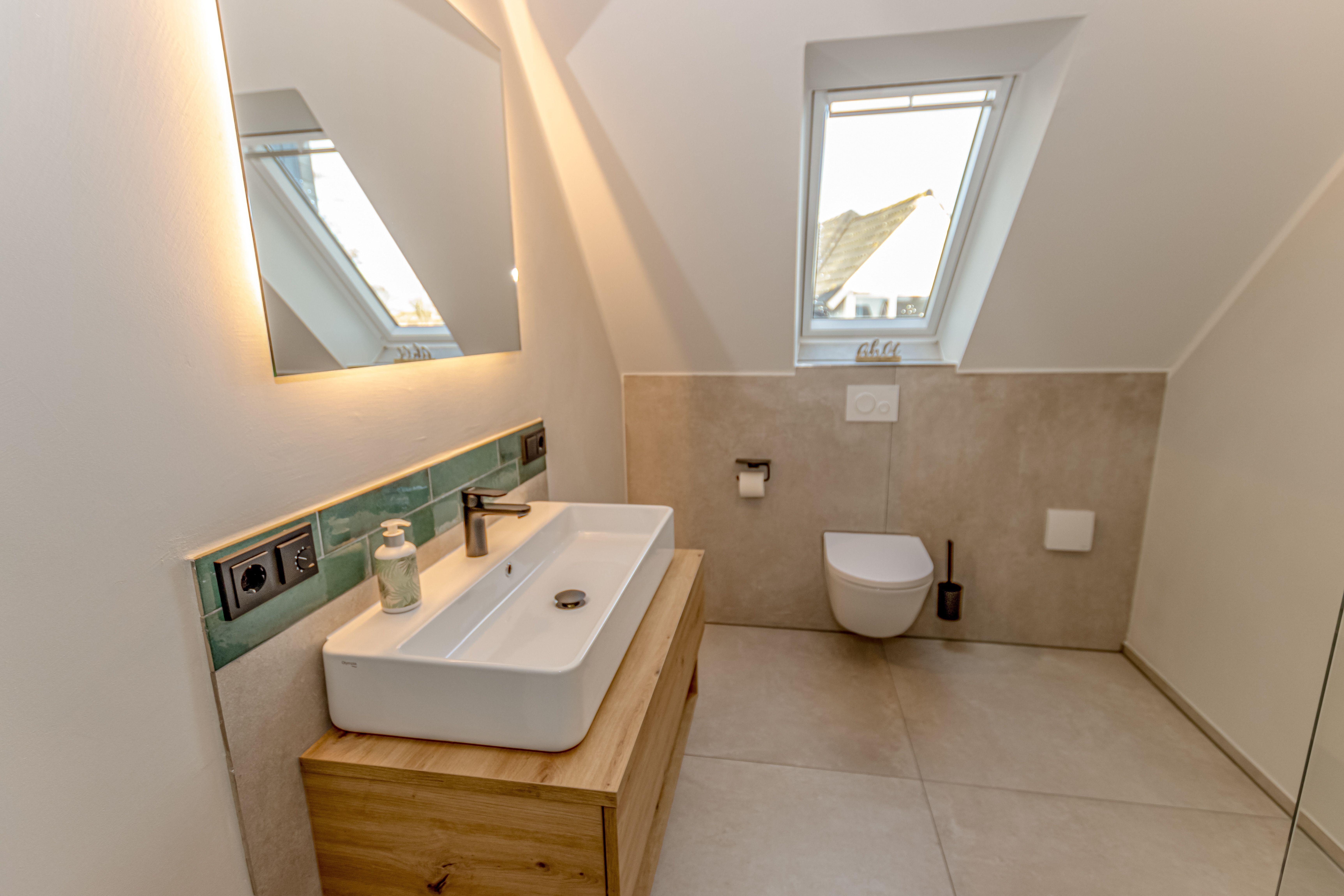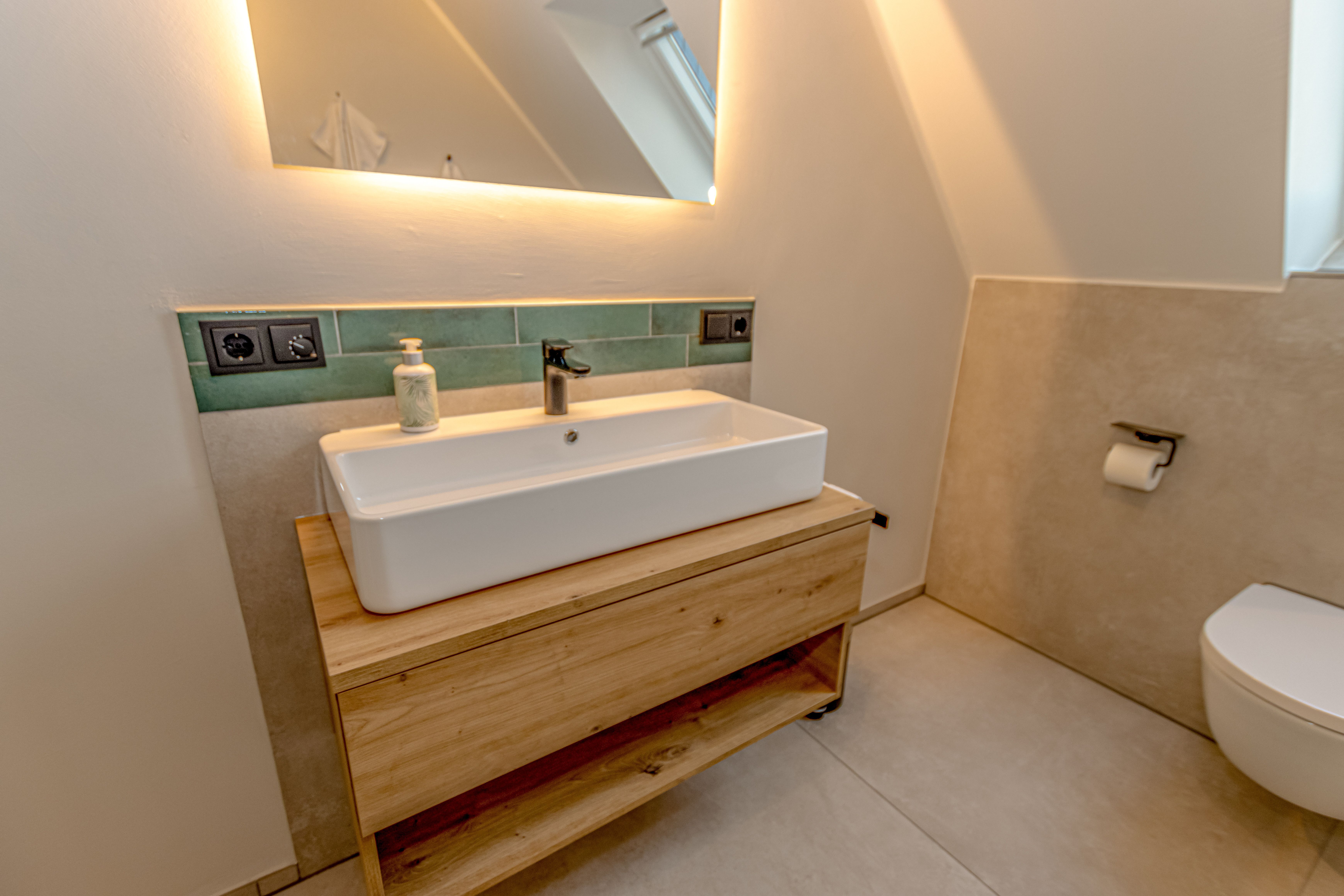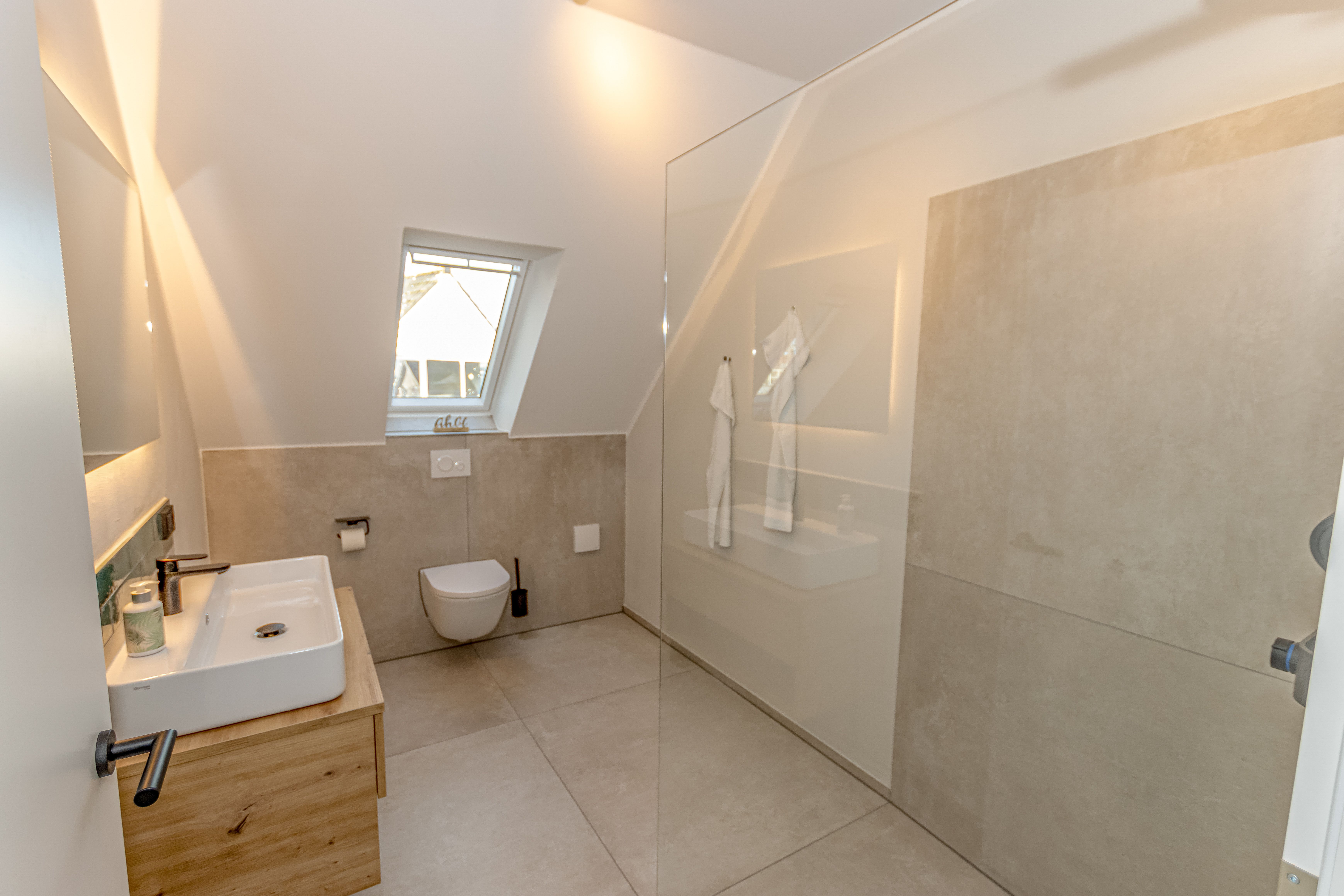 - Badezimmer mit Dusche, Waschtisch und WC