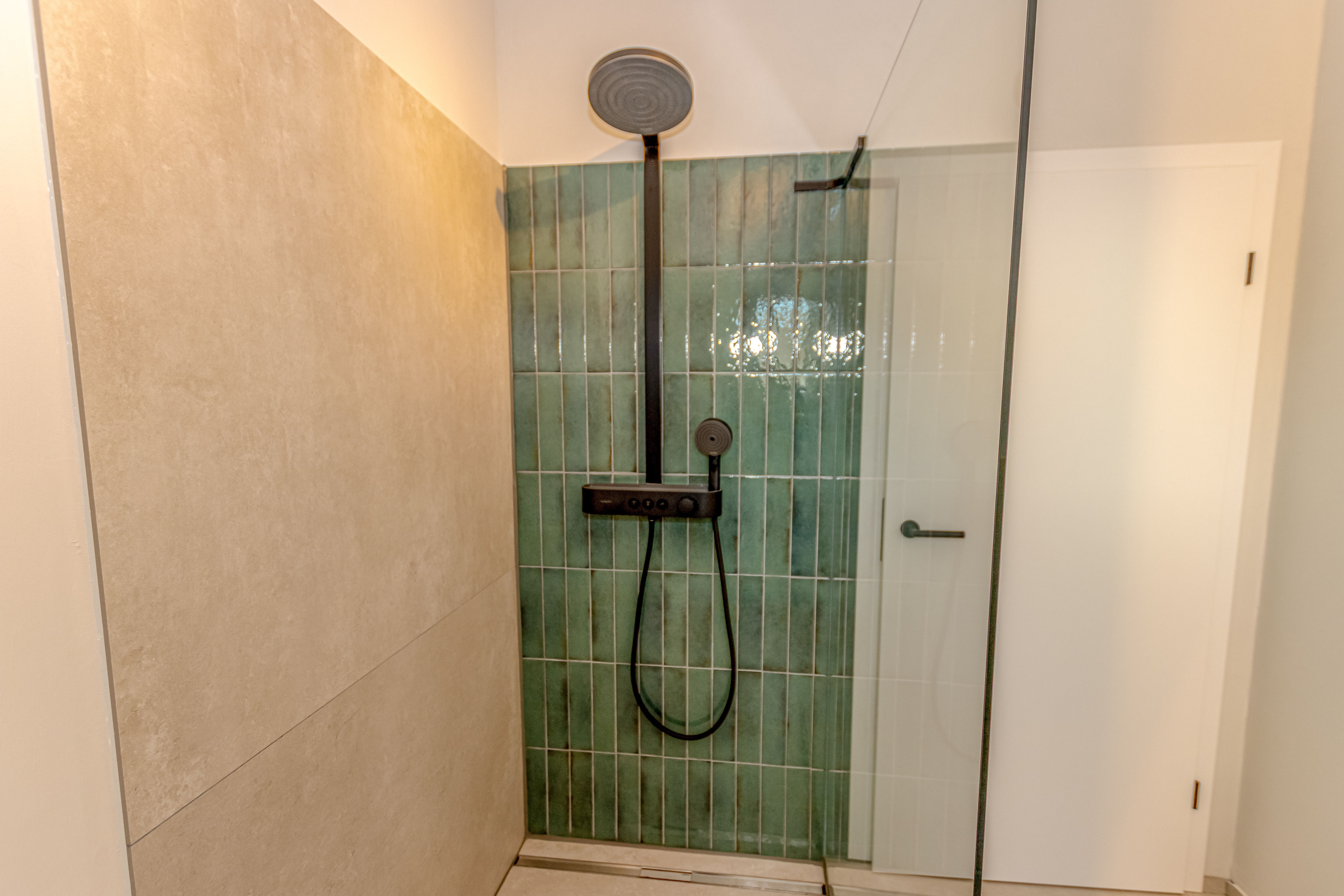 Großzügiges, modernes Badezimmer mit einer großen, geräumigen und sehr modernen Duscharmatur.
