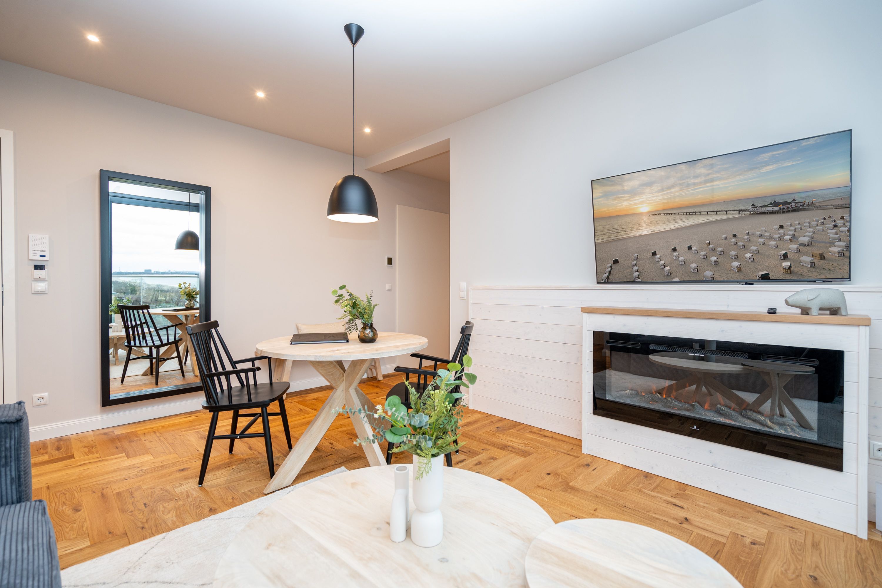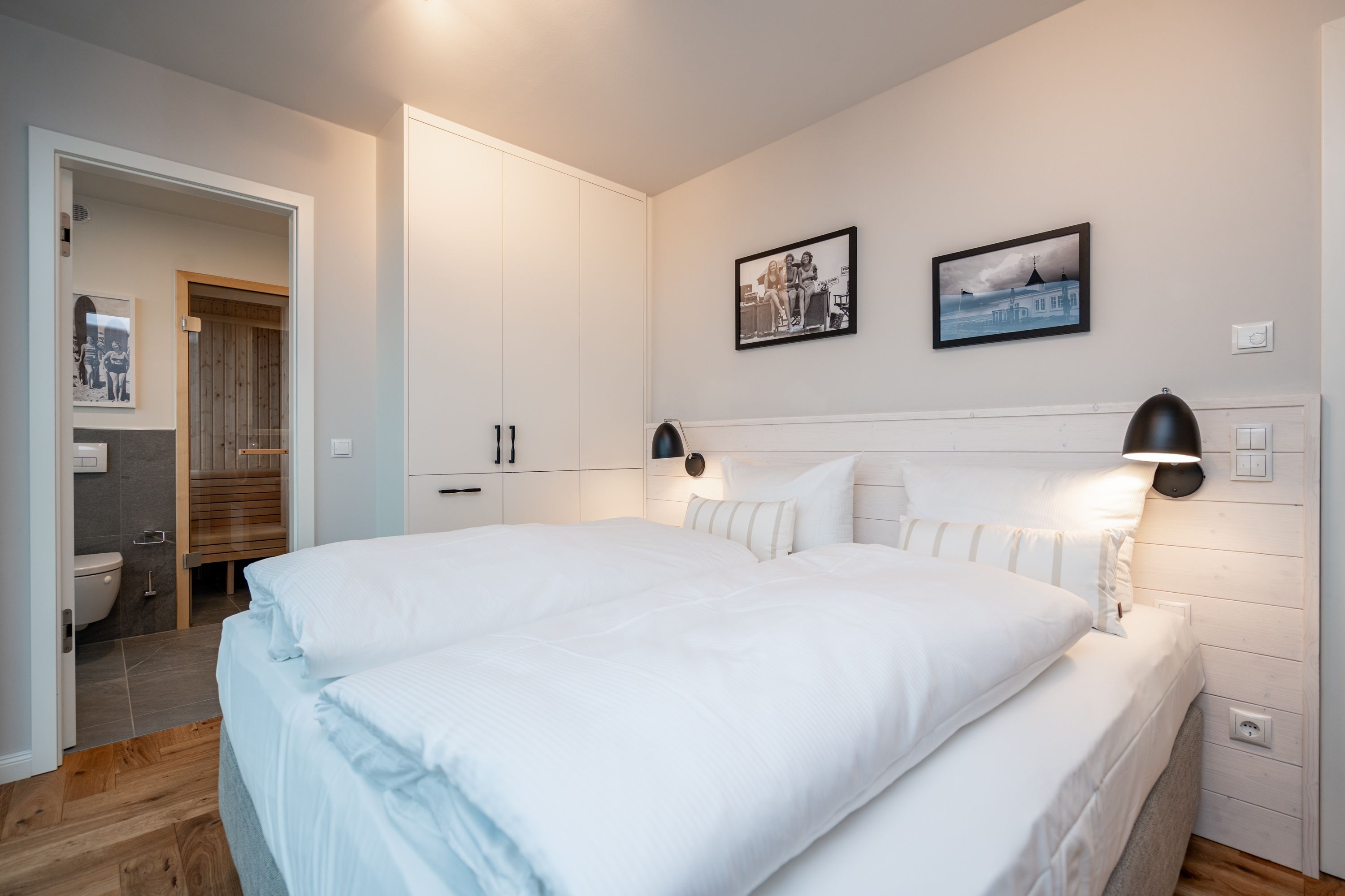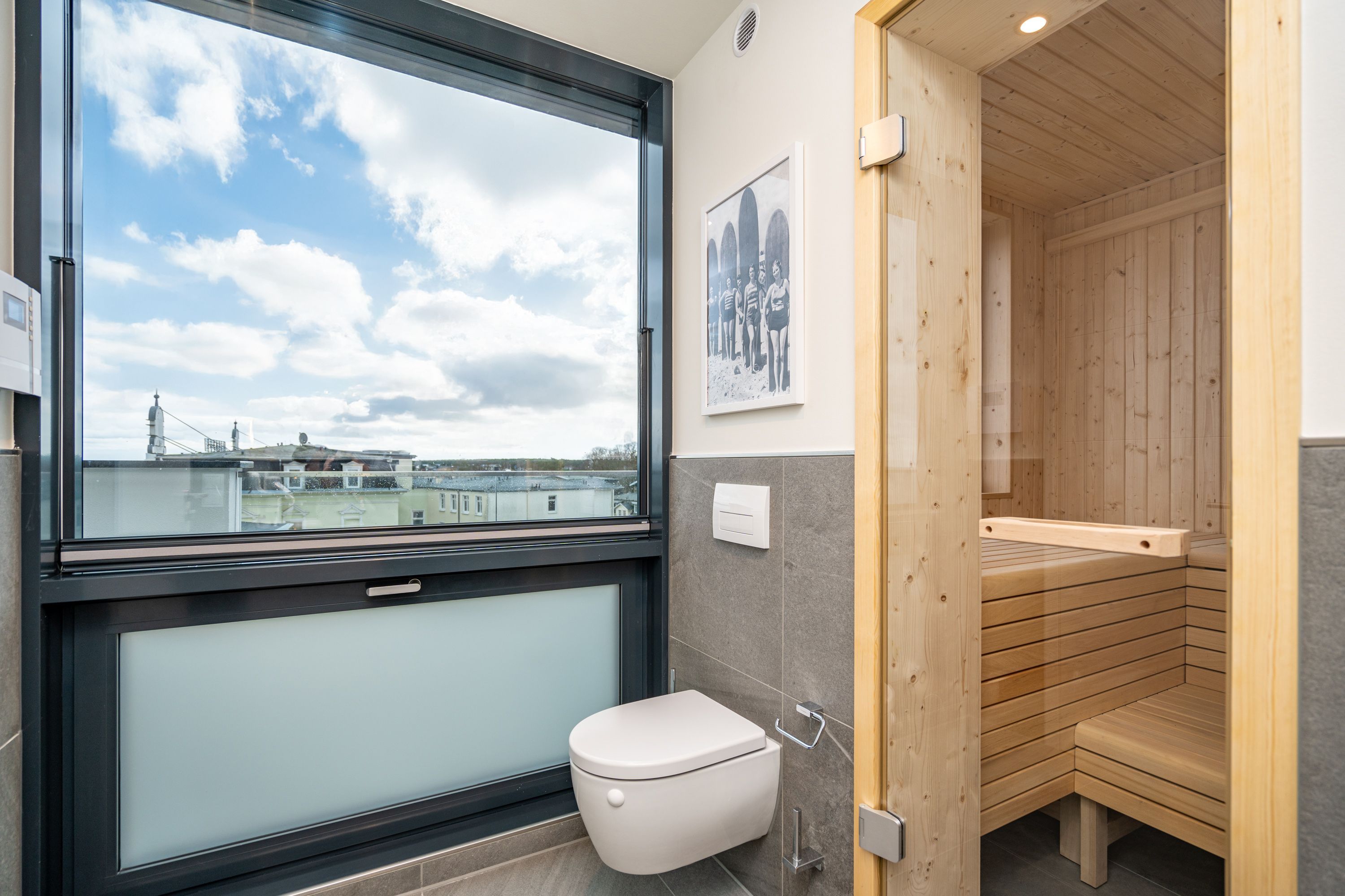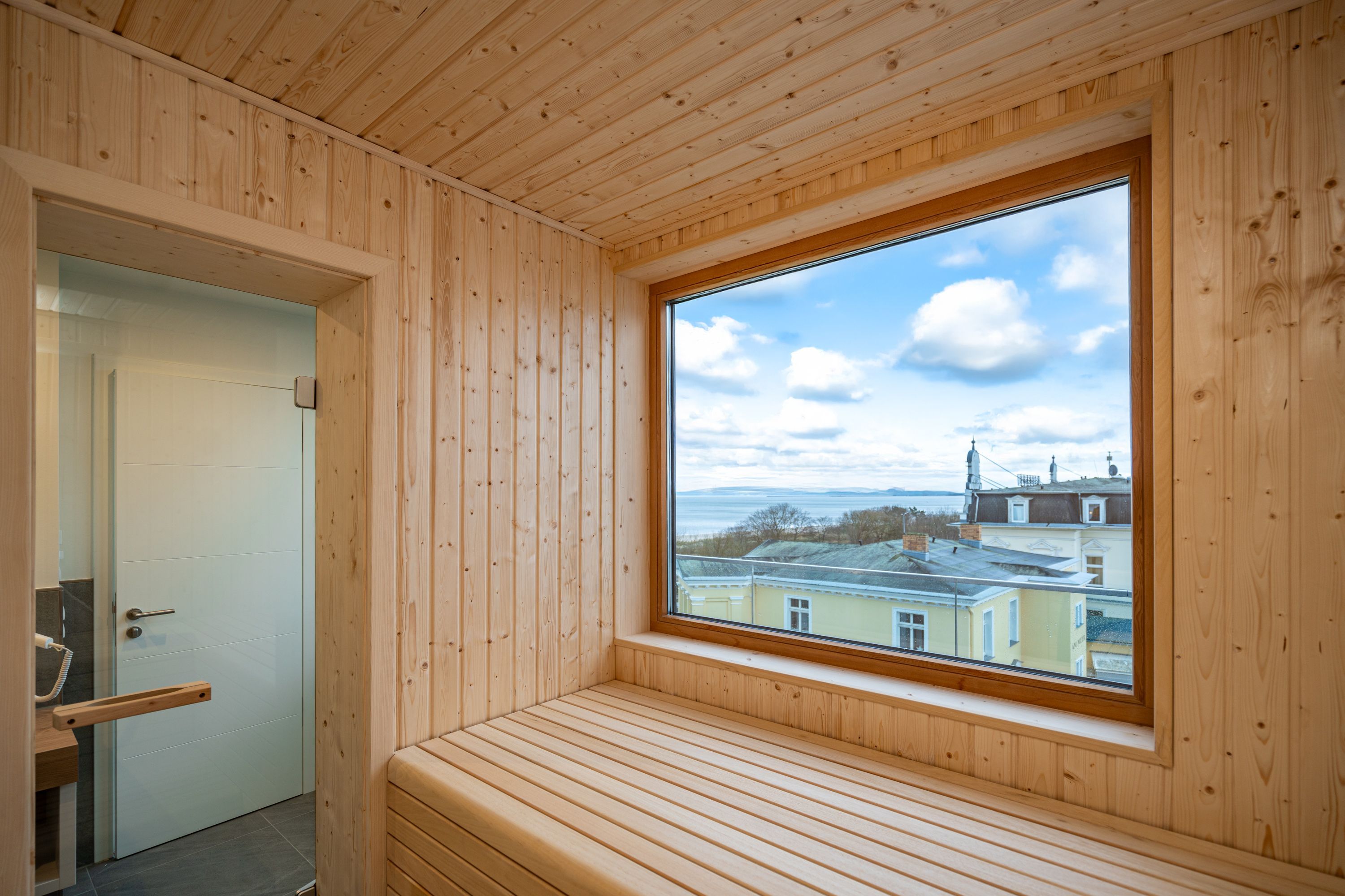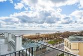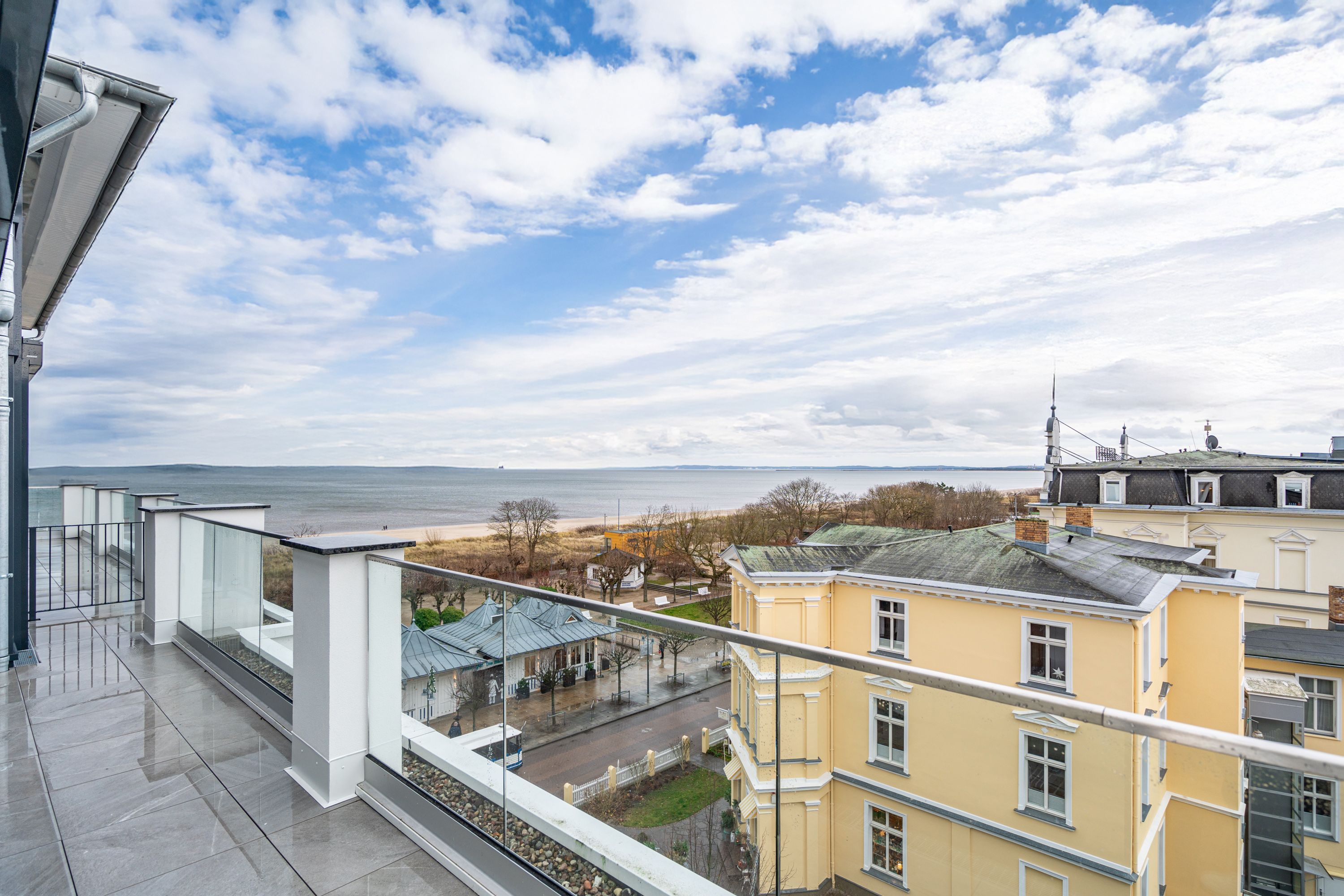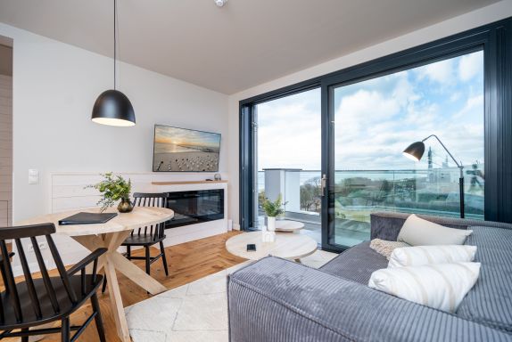 Herzlich willkommen im exklusiven Penthouse-Appartement 4.3 Ihrem stilvollen Rückzugsort im Penthouse von Haus A in der 4. Etage mit unvergleichlichem Meerblick. Auf großzügigen 59 m² erwartet zwei Personen ein harmonischer Mix aus modernem Komfort, eleganter Ausstattung und maritimer Wohlfühlatmosphäre. Der lichtdurchflutete Wohnbereich begeistert mit edlem Echtholzparkett, einer gemütlichen Couch, einem stimmungsvollen Elektrokamin und einem beeindruckenden 55-Zoll-Flat-TV. Direkt daneben lädt der Essplatz für zwei Personen dazu ein, köstliche Mahlzeiten in entspannter Atmosphäre zu genießen ob beim romantischen Abendessen oder beim gemütlichen Frühstück. Die angrenzende, voll ausgestattete Küchenzeile erfüllt mit einem Kombibackofen mit Mikrowellenfunktion, einem 3-Platten-Induktionskochfeld, einer Spülmaschine und einem Kühlschrank mit Gefrierfach höchste Ansprüche. Das separate Schlafzimmer lässt mit einem komfortablen Boxspringbett (1,80 m x 2,00 m), einem geräumigen Kleiderschrank und einem 43-Zoll-Flat-TV keine Wünsche offen. Ein besonderes Highlight ist die großzügige Dachterrasse, die Sie sowohl vom Wohn- als auch vom Schlafbereich betreten können perfekt für entspannte Stunden an der frischen Luft. Das Badezimmer ist Ihre ganz persönliche Wellnessoase: eine großzügige Dusche und eine finnische Sauna mit atemberaubendem Meerblick laden zum Entspannen ein. Ein eleganter Waschtisch, eine Toilette sowie ein separates Gäste-WC ergänzen das moderne Raumangebot. Für zusätzlichen Komfort stehen Ihnen kostenfreies WLAN und ein eigener PKW-Stellplatz in der Tiefgarage zur Verfügung. Freuen Sie sich auf unvergessliche Urlaubstage in der Strandterrasse App. 4.3 der perfekte Ort, um die Seele baumeln zu lassen und das Beste aus Ihrem Aufenthalt zu machen. Wir heißen Sie herzlich willkommen!