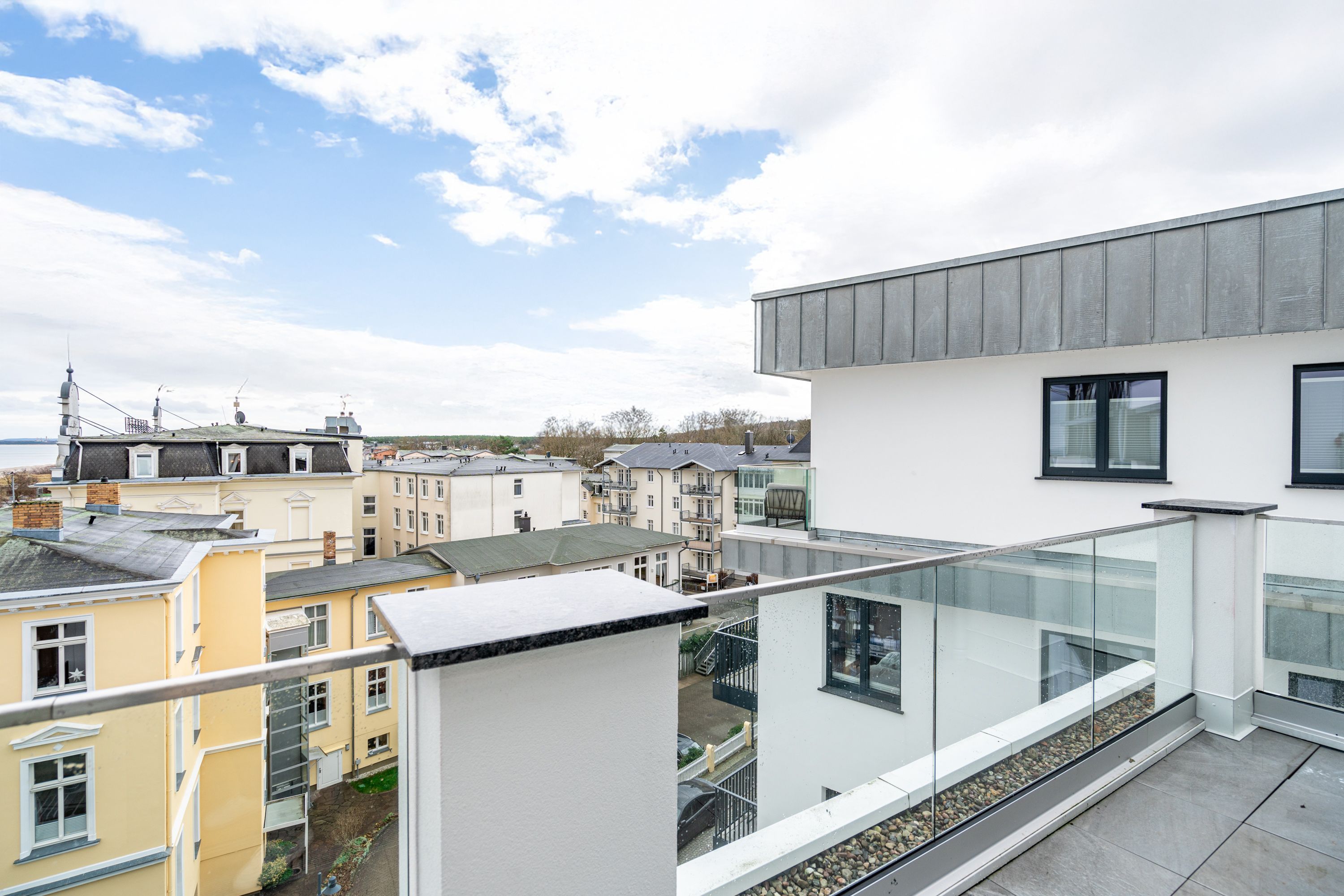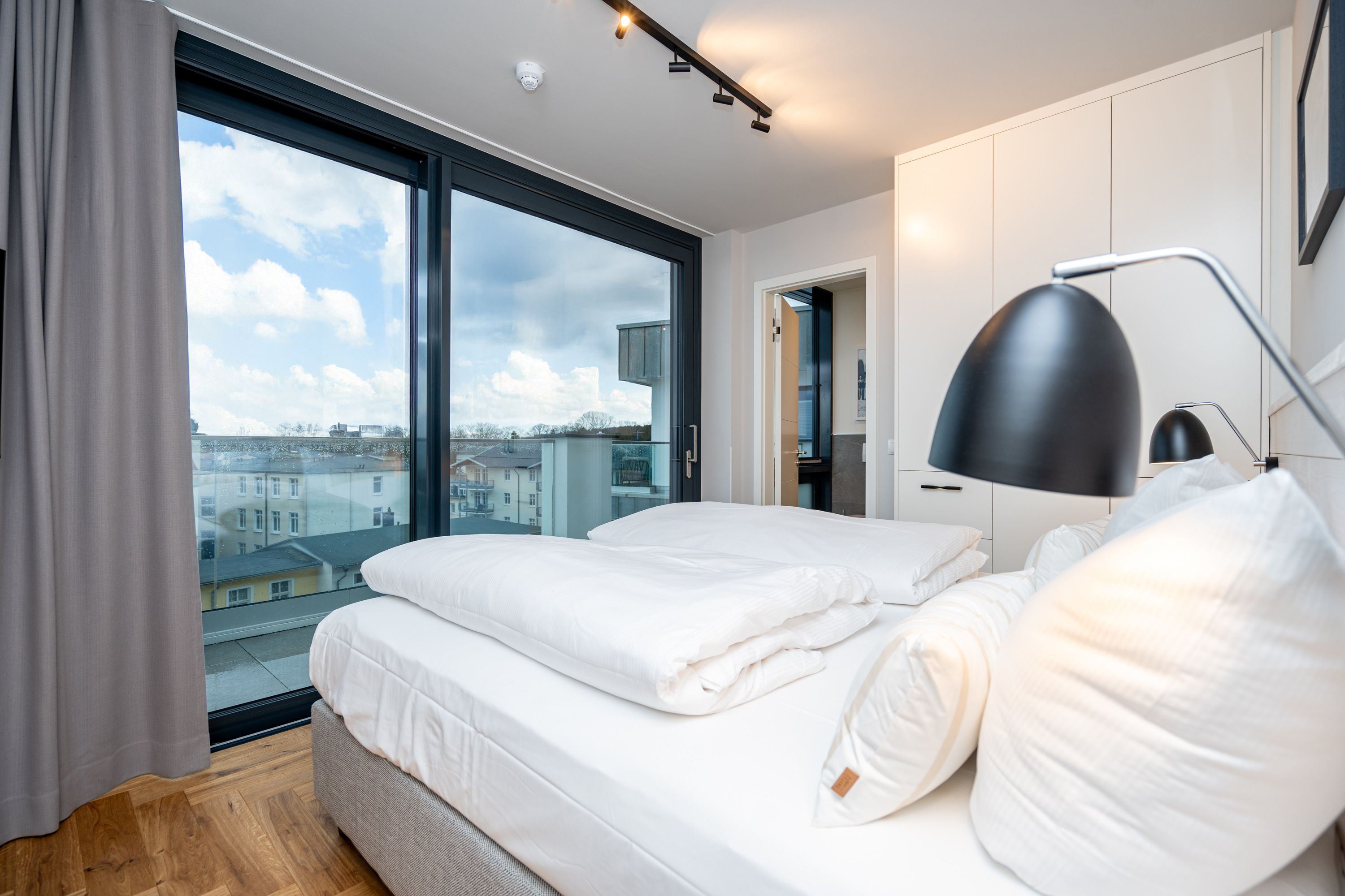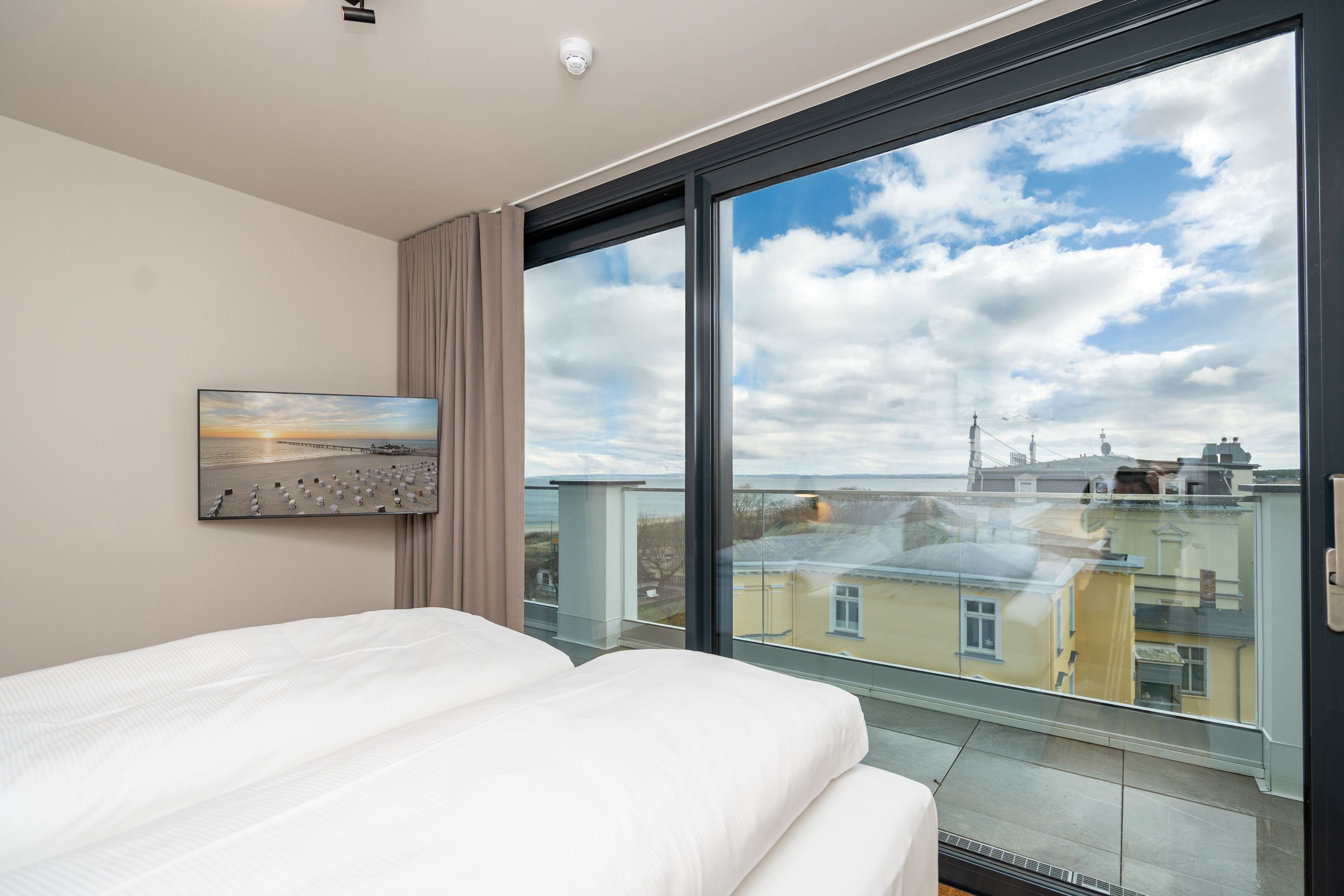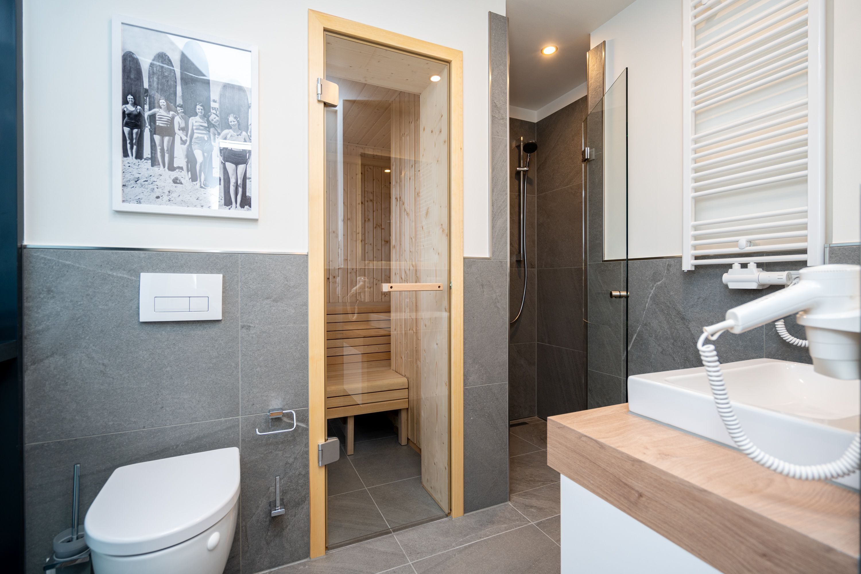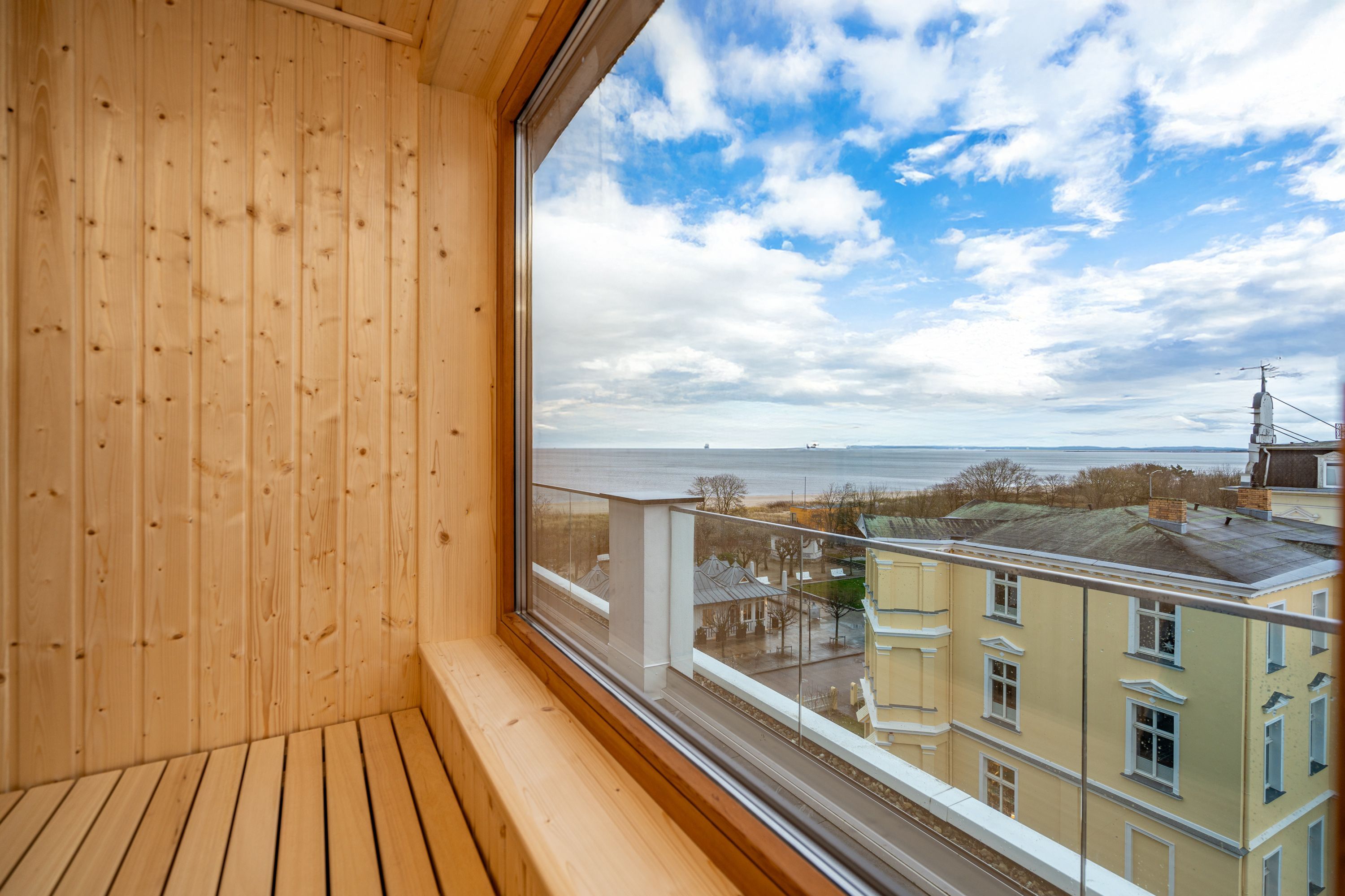 Herzlich willkommen im exklusiven Penthouse-Appartement 4.3 Ihrem stilvollen Rückzugsort im Penthouse von Haus A in der 4. Etage mit unvergleichlichem Meerblick. Auf großzügigen 59 m² erwartet zwei Personen ein harmonischer Mix aus modernem Komfort, eleganter Ausstattung und maritimer Wohlfühlatmosphäre. Der lichtdurchflutete Wohnbereich begeistert mit edlem Echtholzparkett, einer gemütlichen Couch, einem stimmungsvollen Elektrokamin und einem beeindruckenden 55-Zoll-Flat-TV. Direkt daneben lädt der Essplatz für zwei Personen dazu ein, köstliche Mahlzeiten in entspannter Atmosphäre zu genießen ob beim romantischen Abendessen oder beim gemütlichen Frühstück. Die angrenzende, voll ausgestattete Küchenzeile erfüllt mit einem Kombibackofen mit Mikrowellenfunktion, einem 3-Platten-Induktionskochfeld, einer Spülmaschine und einem Kühlschrank mit Gefrierfach höchste Ansprüche. Das separate Schlafzimmer lässt mit einem komfortablen Boxspringbett (1,80 m x 2,00 m), einem geräumigen Kleiderschrank und einem 43-Zoll-Flat-TV keine Wünsche offen. Ein besonderes Highlight ist die großzügige Dachterrasse, die Sie sowohl vom Wohn- als auch vom Schlafbereich betreten können perfekt für entspannte Stunden an der frischen Luft. Das Badezimmer ist Ihre ganz persönliche Wellnessoase: eine großzügige Dusche und eine finnische Sauna mit atemberaubendem Meerblick laden zum Entspannen ein. Ein eleganter Waschtisch, eine Toilette sowie ein separates Gäste-WC ergänzen das moderne Raumangebot. Für zusätzlichen Komfort stehen Ihnen kostenfreies WLAN und ein eigener PKW-Stellplatz in der Tiefgarage zur Verfügung. Freuen Sie sich auf unvergessliche Urlaubstage in der Strandterrasse App. 4.3 der perfekte Ort, um die Seele baumeln zu lassen und das Beste aus Ihrem Aufenthalt zu machen. Wir heißen Sie herzlich willkommen!