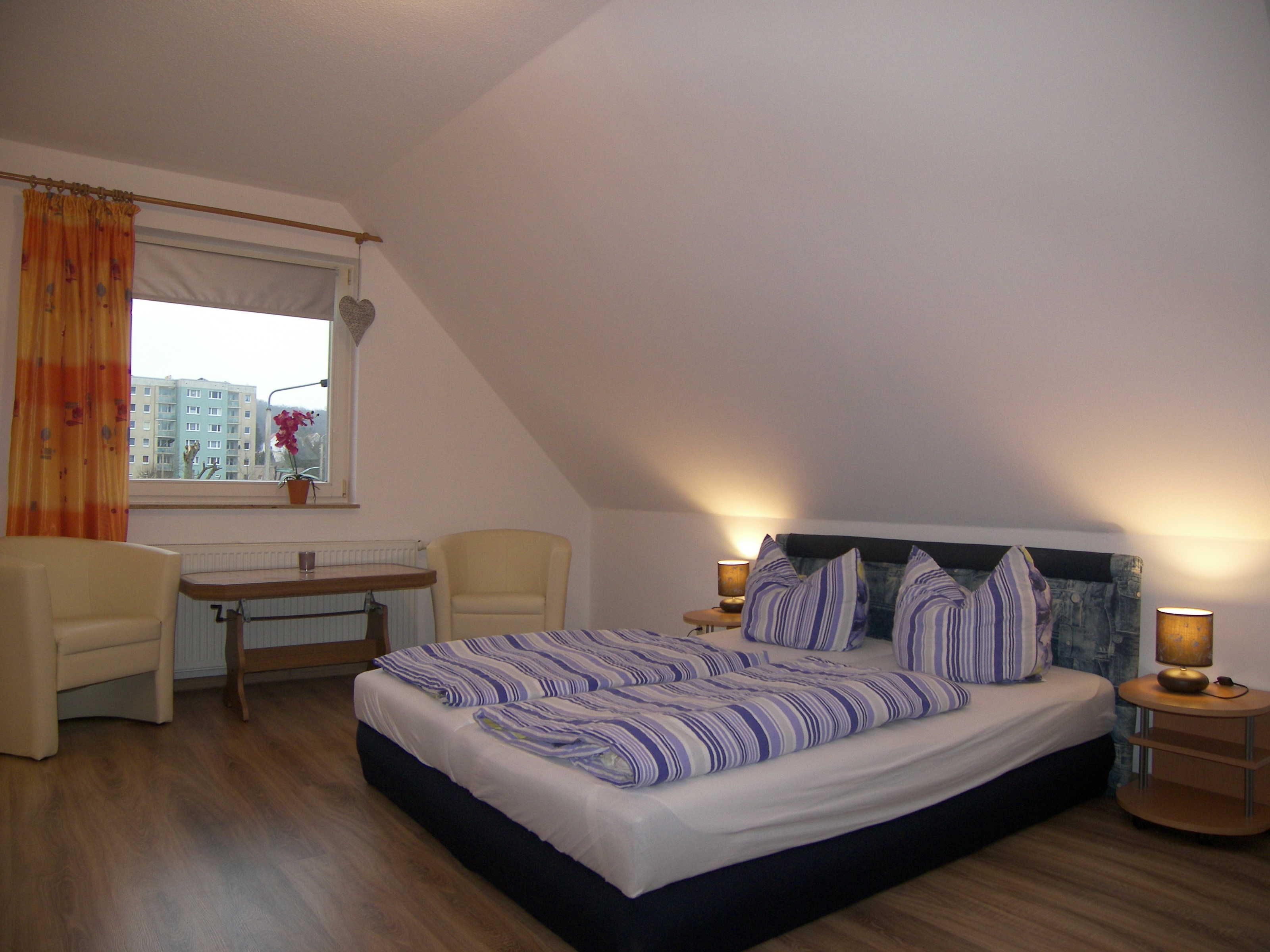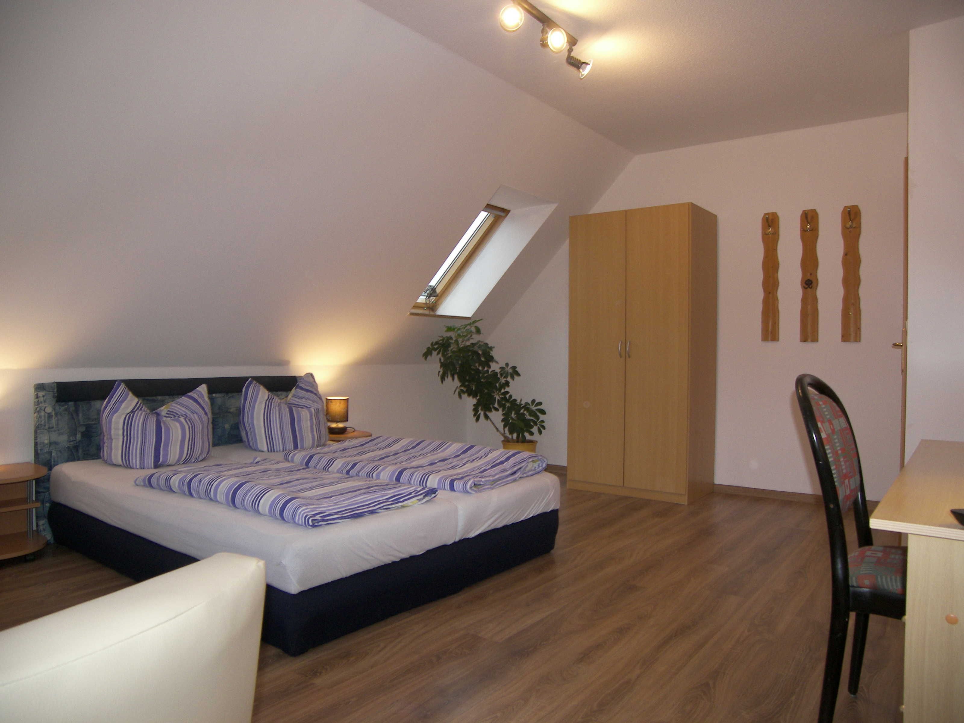 Die moderne 1-Zimmer-Ferienwohnung liegt im 1. OG/Dachgeschoß ist ca. 25 qm groß und verfügt über ein Doppelbett, einen Esstisch mit zwei Stühlen, Kleiderschrank, Flat-TV und Radiowecker. Eine Aufbettung für ein Kind bis max. 12 Jahre kann auf einem Reiseklappbett erfolgen.