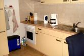 Die Küche ist in das Wohnzimmer integriert und komplett ausgestattet unter anderem mit einem Kühlschrank, einem Herd (4 Ceranfeld-Platten), eine Kaffeemaschine und einem Wasserkocher.