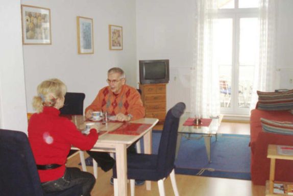 Die Ferienwohnung befindet sich in der Strandstraße im 1.Obergeschoss. In dem Haus befindet sich ein Fahrstuhl. In der Ferienwohnung gibt es ein Wohnzimmer mit Couch und Fernseher, eine offene Küche mit Backofen und Kühlschrank, ein Bad mit Dusche, WC und Waschtisch sowie ein Schlafzimmer mit einem Doppelbett. Außerdem gehören zu der Ferienwohnung ein Balkon und ein PKW-Stellplatz.