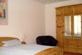 Im Schlafzimmer befindet sich ein Doppelbett und ein großer Kleiderschrank sowie ein Sessel.