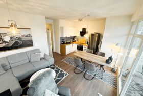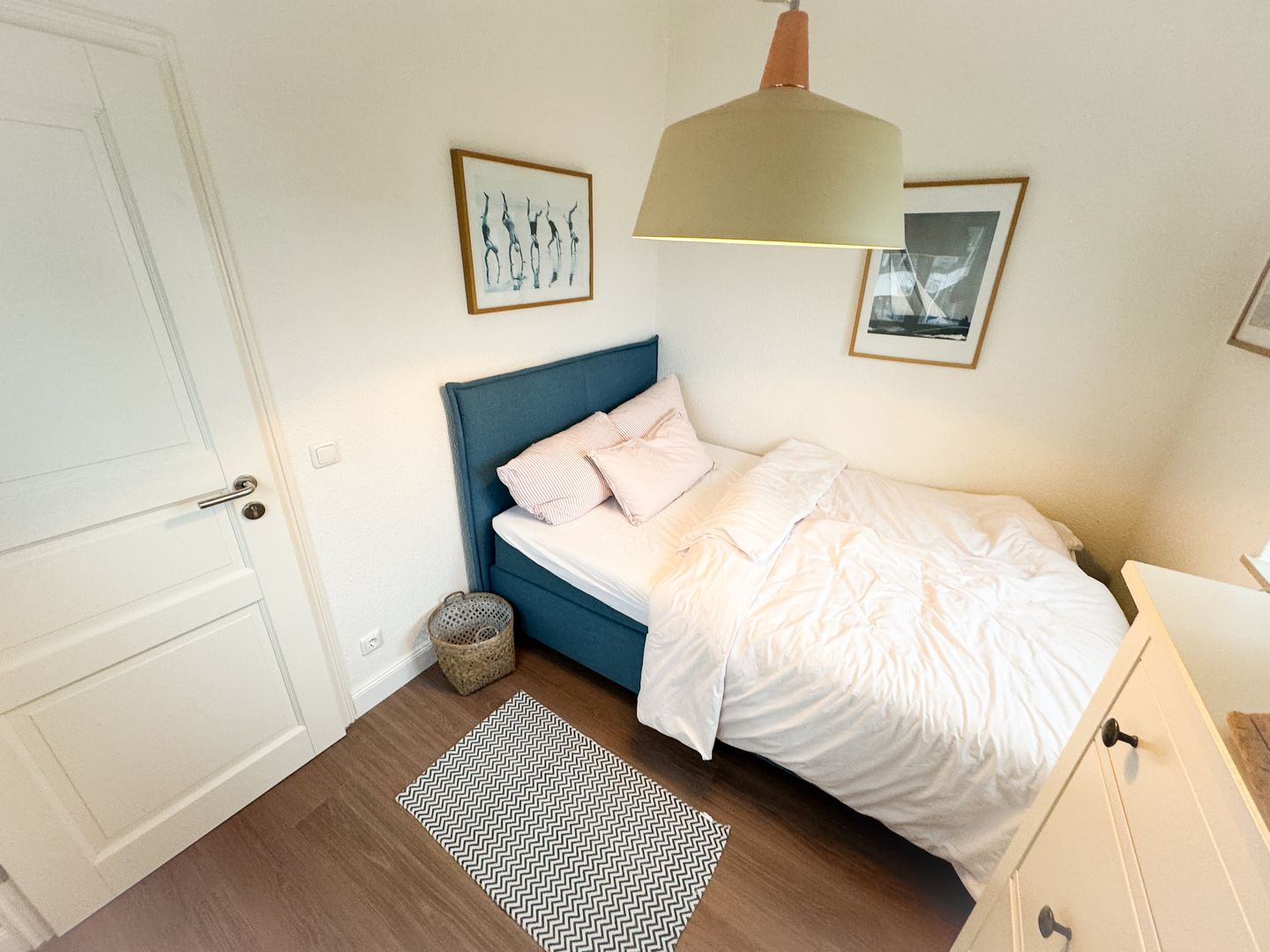 Die liebevoll eingerichtete Unterkunft befindet sich im 2. Stock eines 2019 vollständig renovierten Hauses. Die offene Küche, die zum Wohnzimmer führt, ist mit allen modernen Annehmlichkeiten ausgestattet, die Sie für einen angenehmen Aufenthalt benötigen. Hier finden Sie einen Herd, einen Backofen, einen Kühlschrank mit Gefrierfach sowie eine Kapselkaffeemaschine, einen Wasserkocher und einen Toaster. Nach einem langen Tag am Strand können Sie im Essbereich gemeinsam speisen und gemütliche Abende vor dem Fernseher verbringen, denn die Ferienwohnung verfügt über drei TV-Geräte und kostenfreies WLAN.