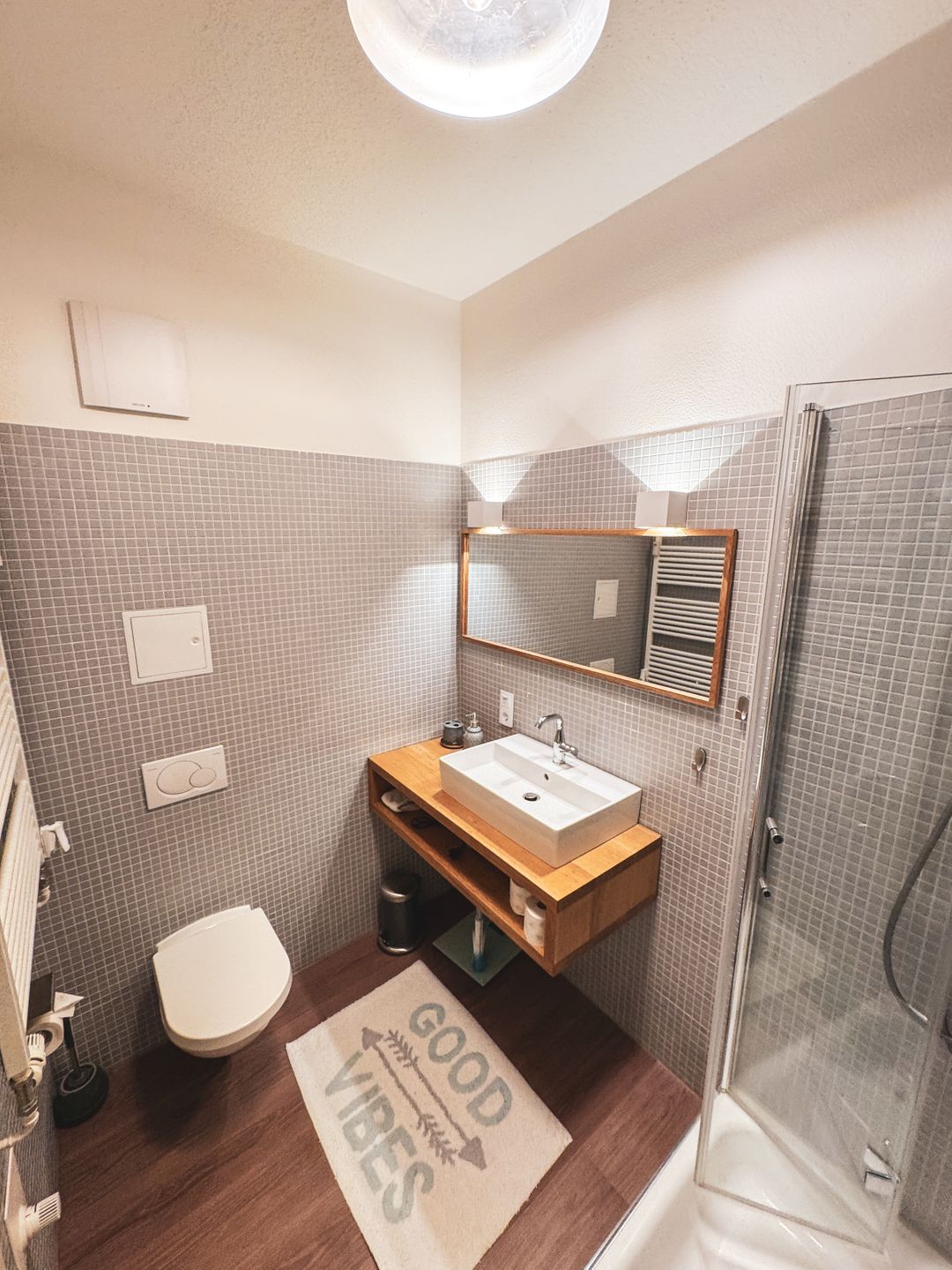 Zur Wohnung gehört ein modernes Badezimmer mit einer Dusche. Außerdem stehen praktische Annehmlichkeiten wie eine Waschmaschine und ein Haartrockner zur Verfügung.