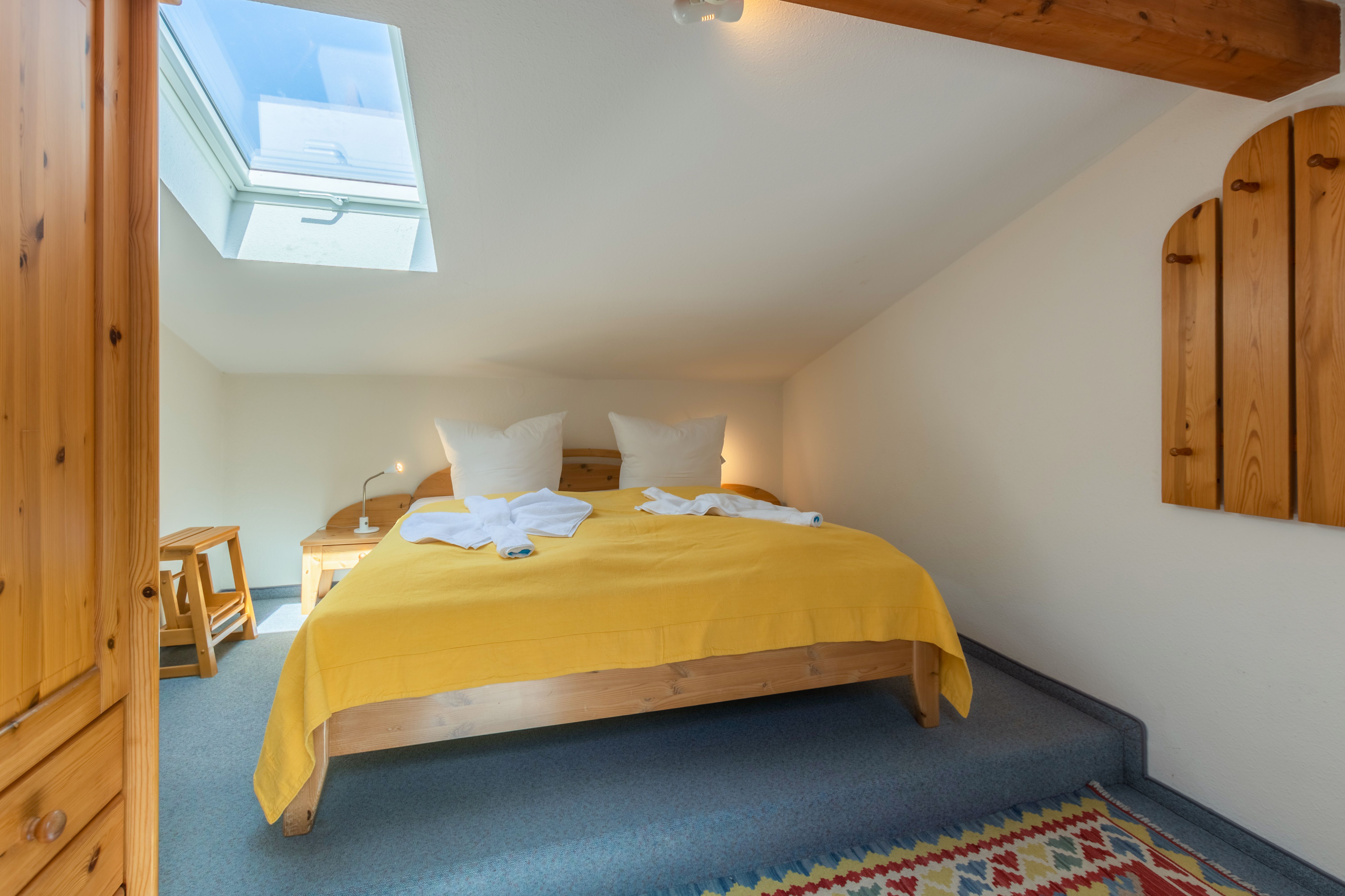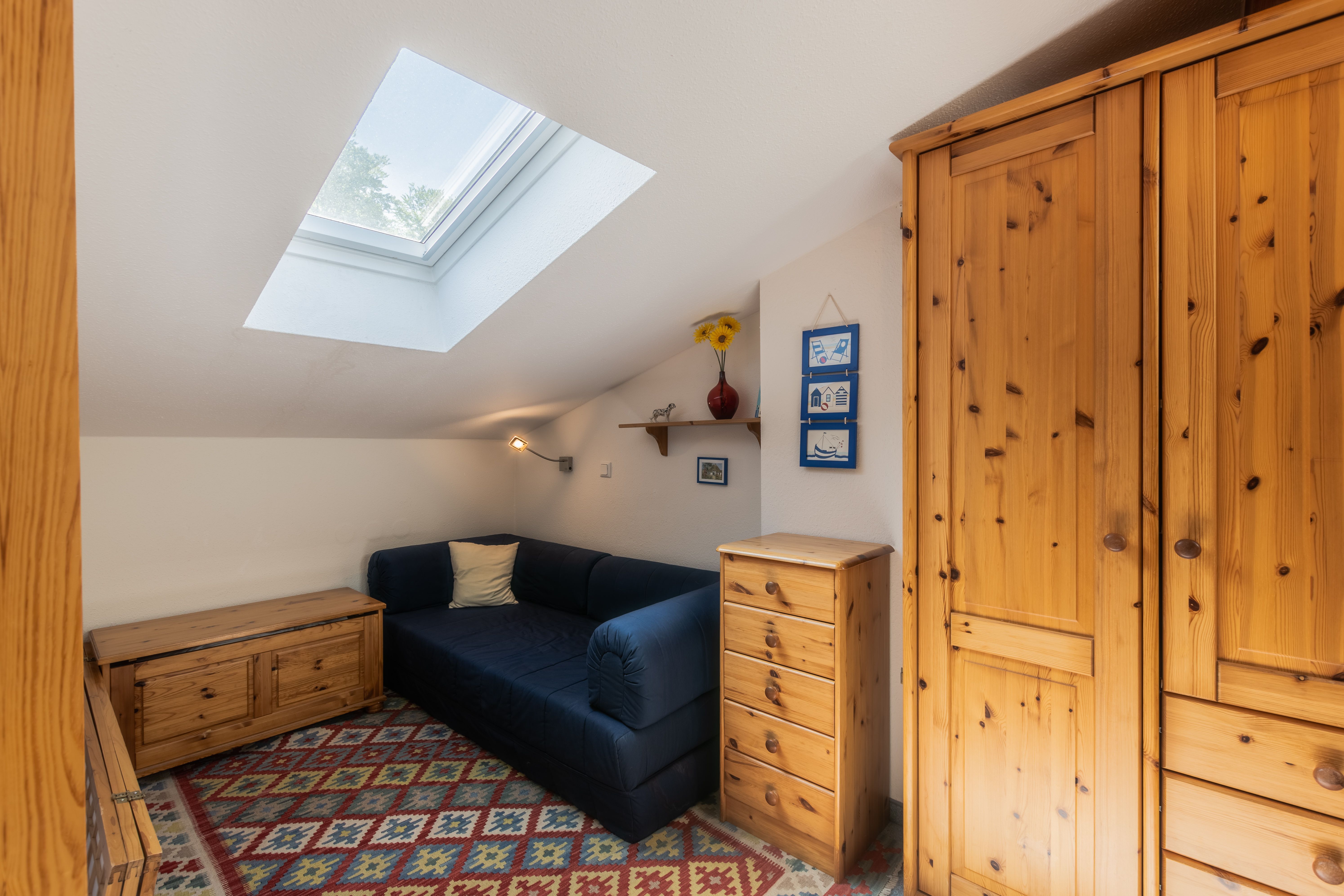 Das Schlafzimmer befindet sich in der offenen Galerie und ist mit einem Doppelbett, einer Schlafcouch und einem Kleiderschrank ausgestattet.