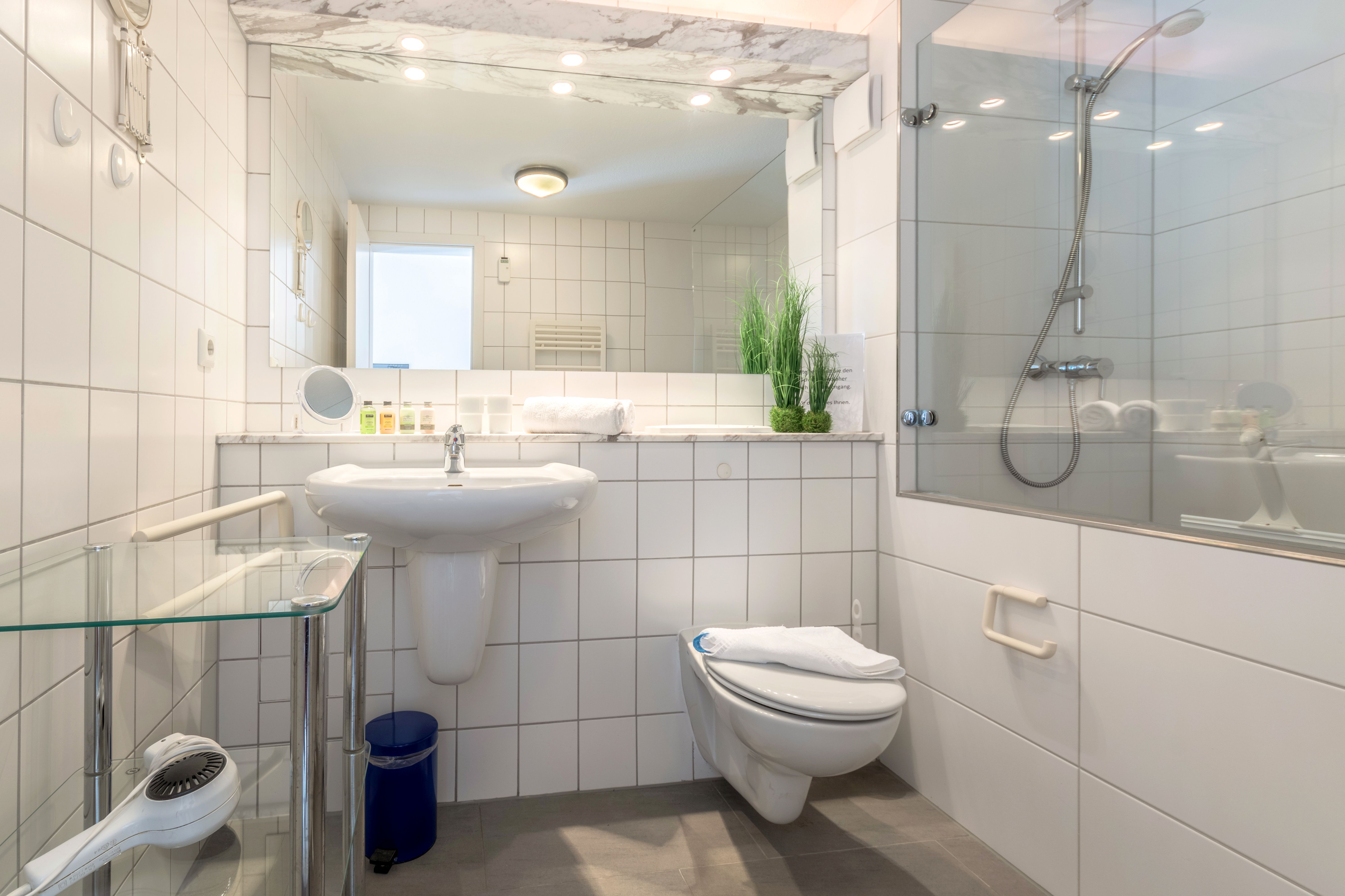Das hell geflieste Badezimmer verfügt über eine Dusche, Fußbodenheizung und ein Fön ist ebenfalls vorhanden.