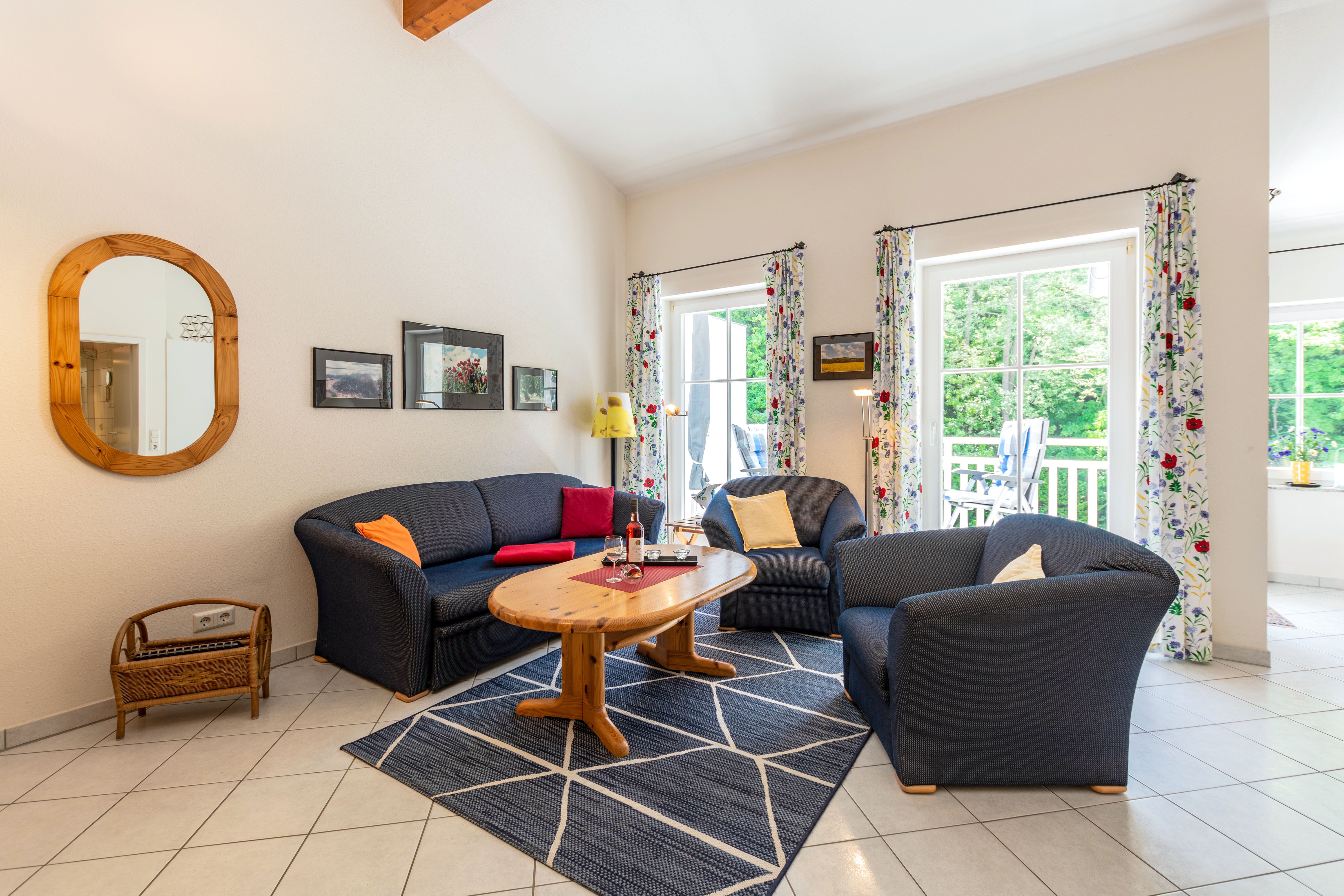 Der großzügig geschnittene Wohnraum verfügt über ein bequemes Sofa und lädt zur lauschigen Runde ein.
