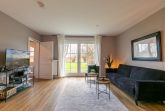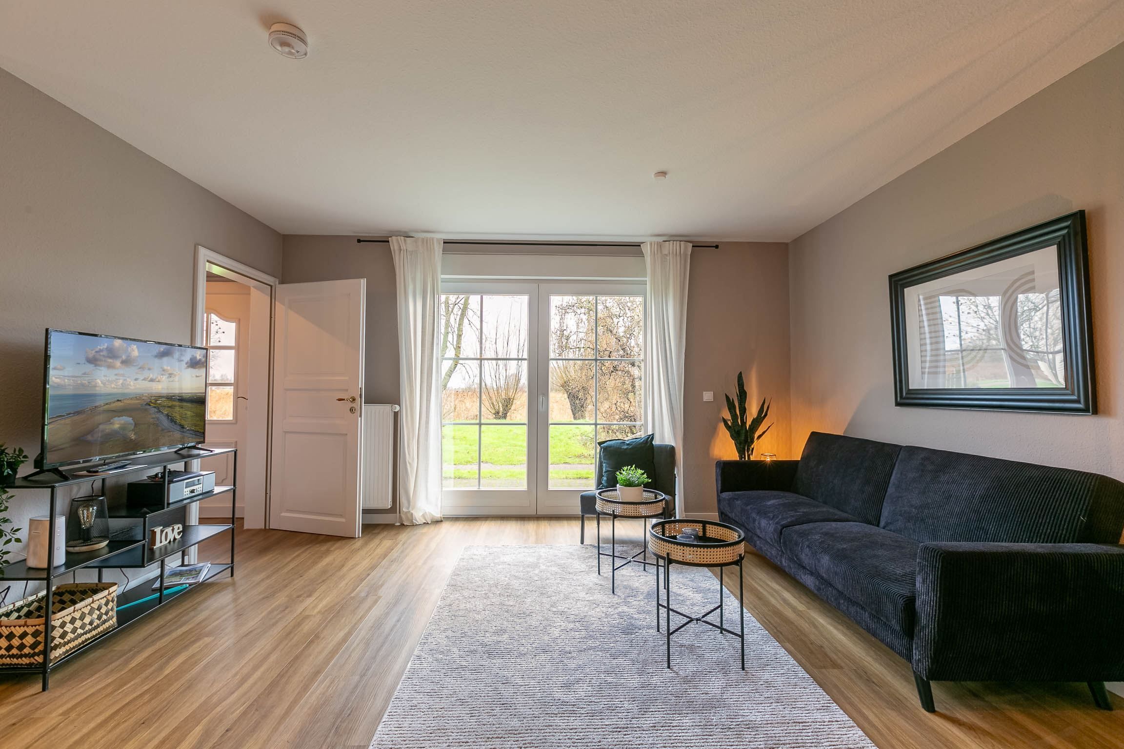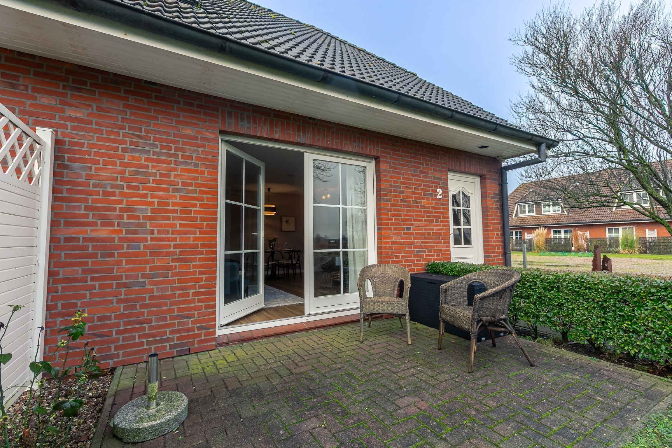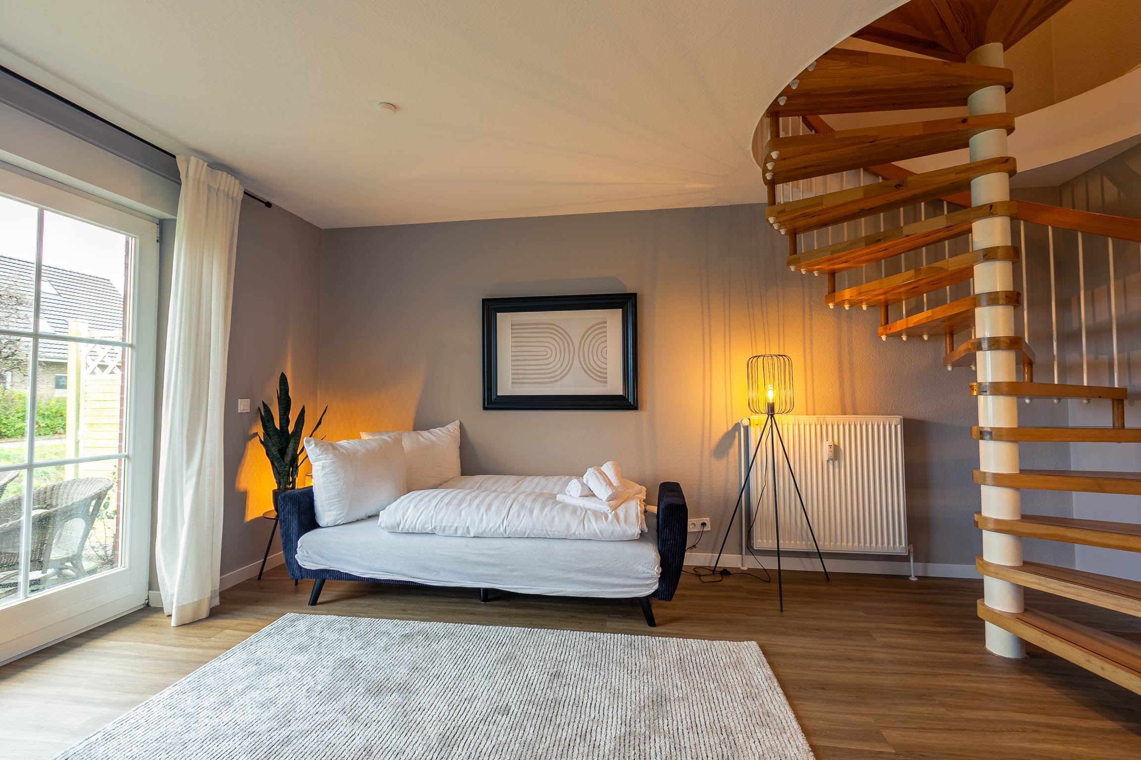 Wohnzimmer mit (ausziehbarem Schlaf-) Sofa (105x190cm), Sessel, TV (Sat) und Esstisch mit vier Stühlen. Eine Wendeltreppe für zum OG. Direkter Zugang zur möblierten Terrasse nach Osten mit Blick auf den Deich. Offene Küche mit Backofen, Geschirrspüler und Kühlschrank mit Gefrierfach.