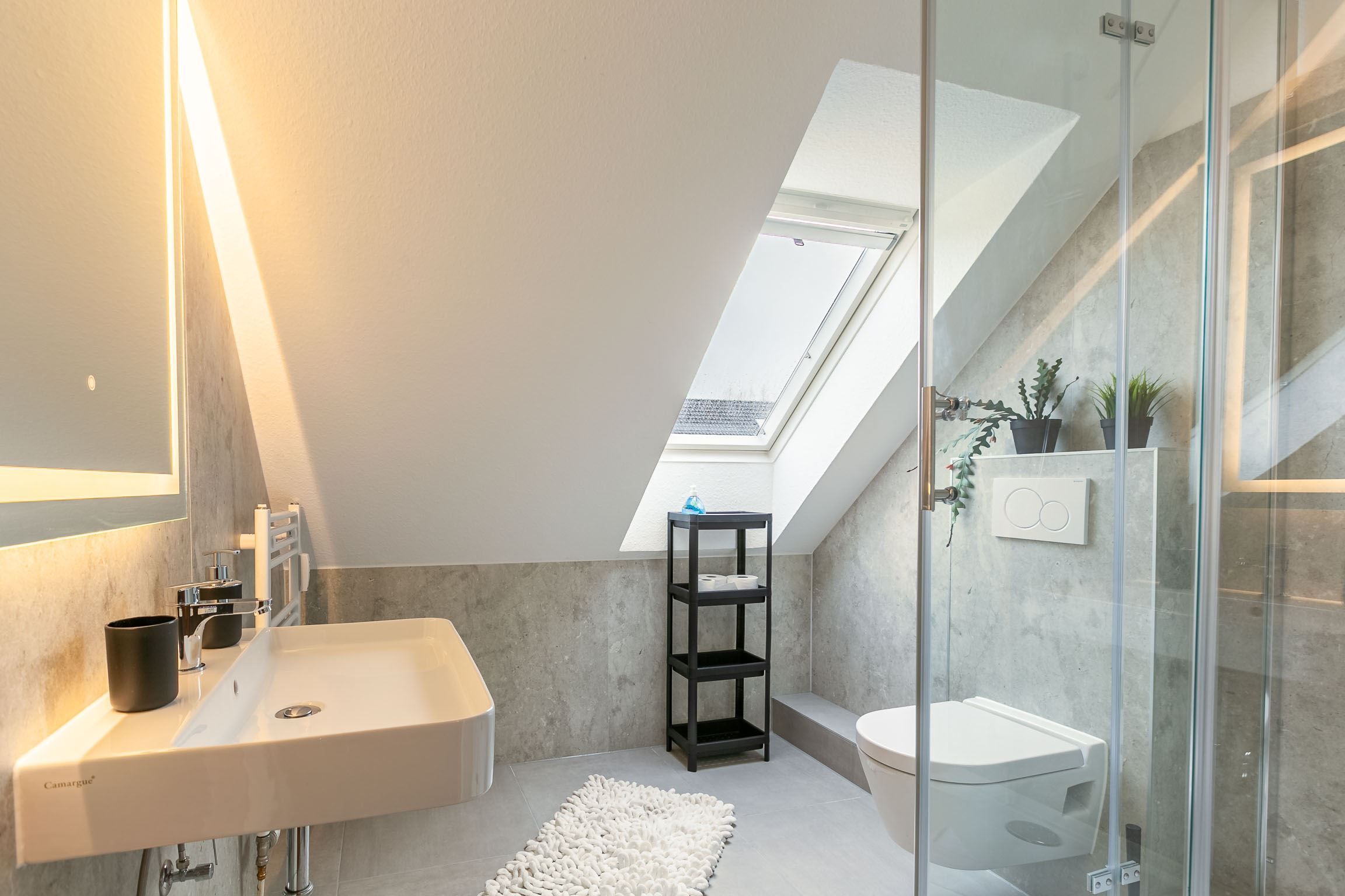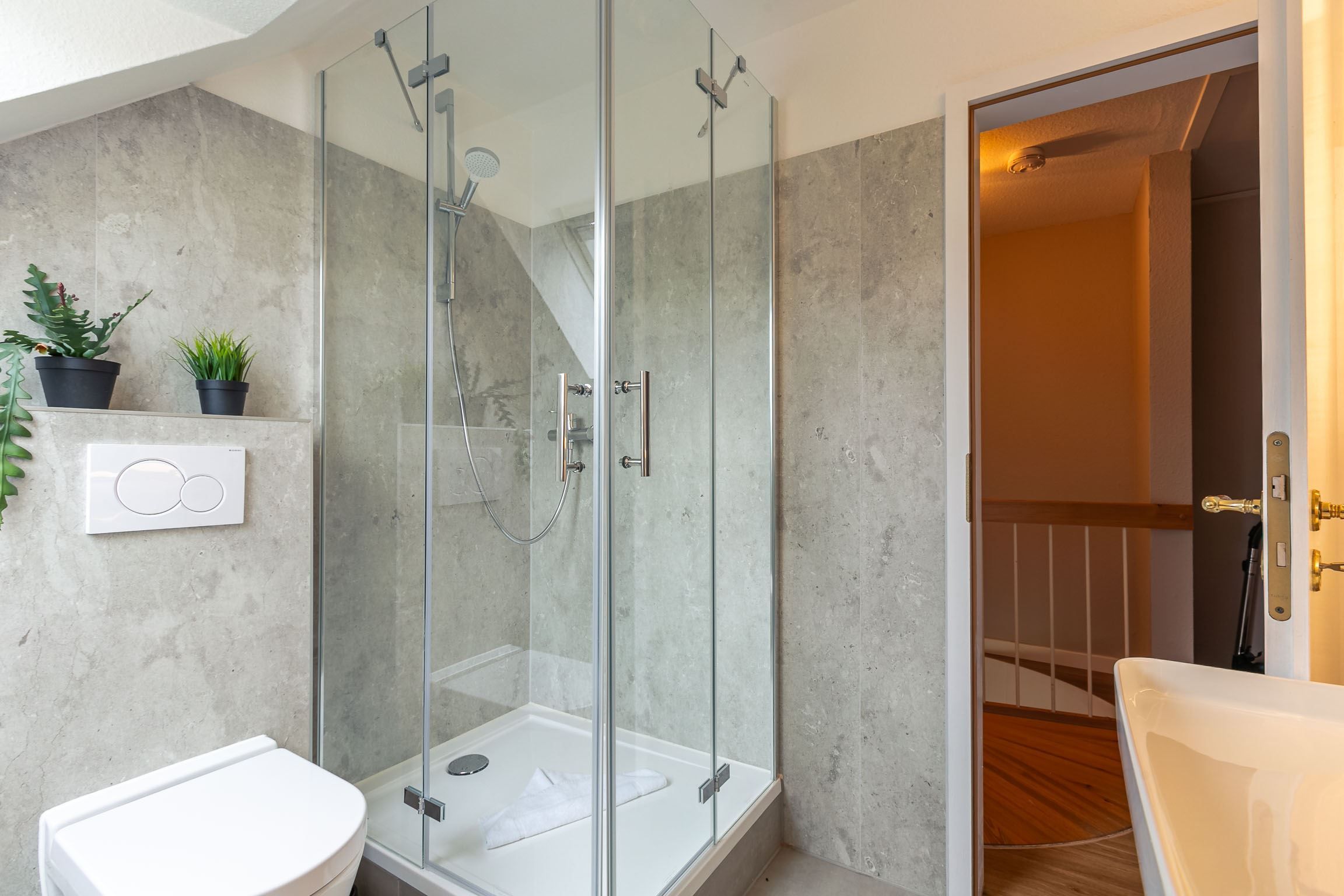Badezimmer (Duschbad) mit großer Dusche (75x95cm), WC, Handtuchwärmer und Tageslicht.