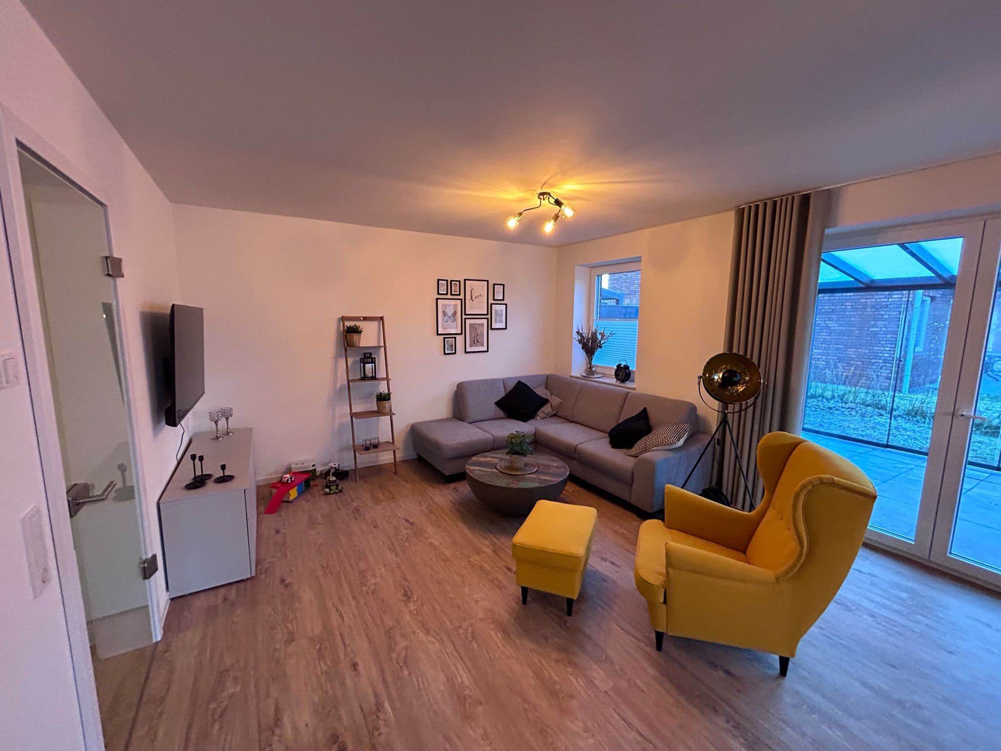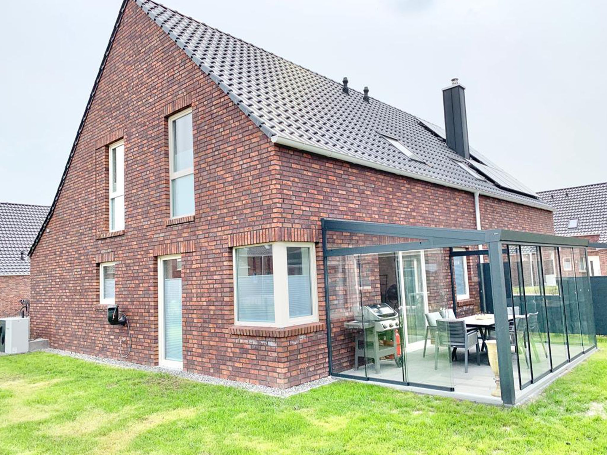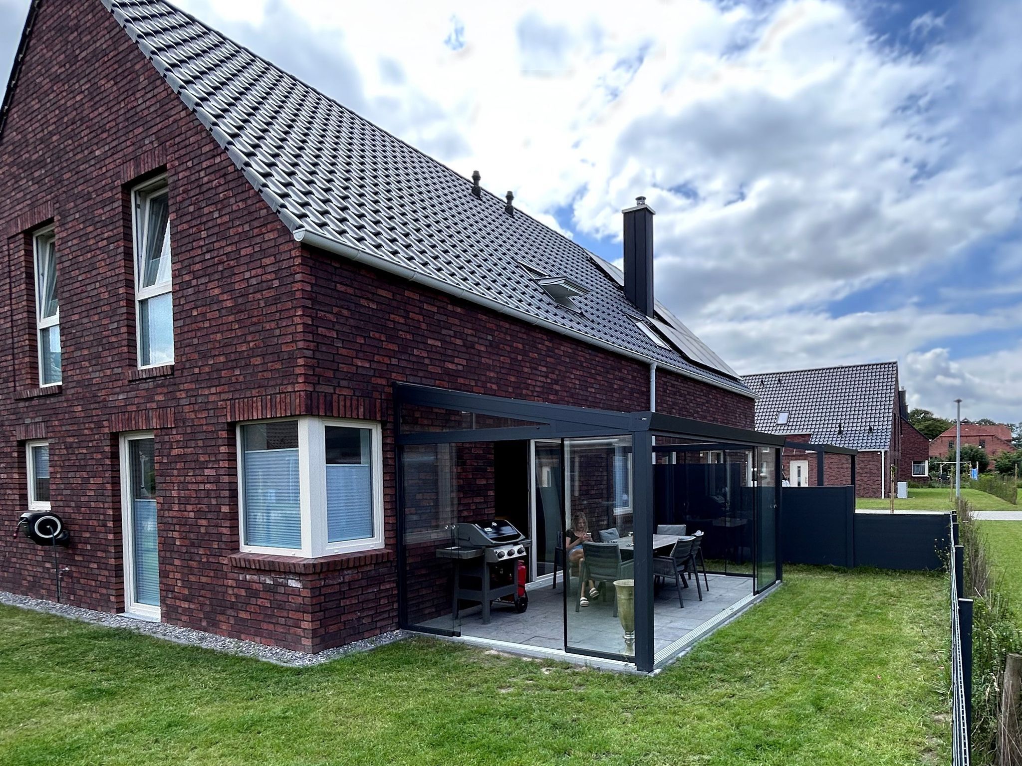 Im eigenen Garten, der komplett eingezäunt ist, finden wir dann neben einem tollen Kinderspielturm das eigentliche Highlight: Eine traumhafte Terrassenüberdachung mit Schiebetüren, Sonnenschutz und einem ausziehbaren Tisch mit 8 Stühlen.