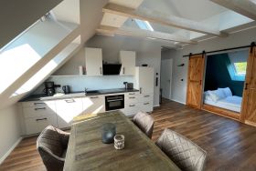 Unsere Lotte ist 79 m² groß und bietet Platz für 2 Personen im separaten Schlafzimmer und für einen Erwachsenen oder bis zu zwei Kinder im gemütlichen Alkoven. Die Einrichtung dieser hochwertigen Ferienwohnung kombiniert die zeitgemäßen Loft- und Beachhousestyles ganz erfrischend und wird Ihren Aufenthalt unvergesslich machen.
