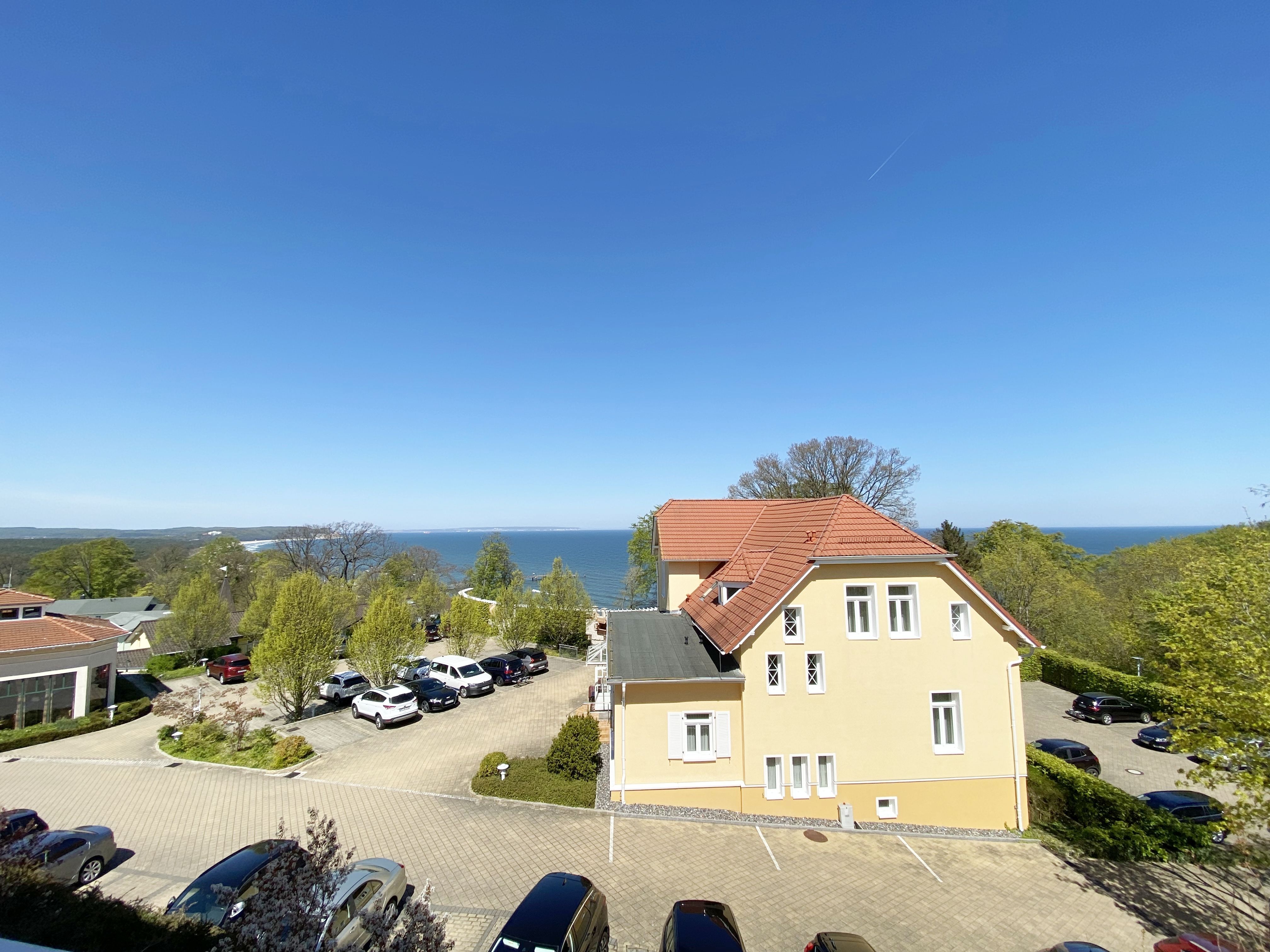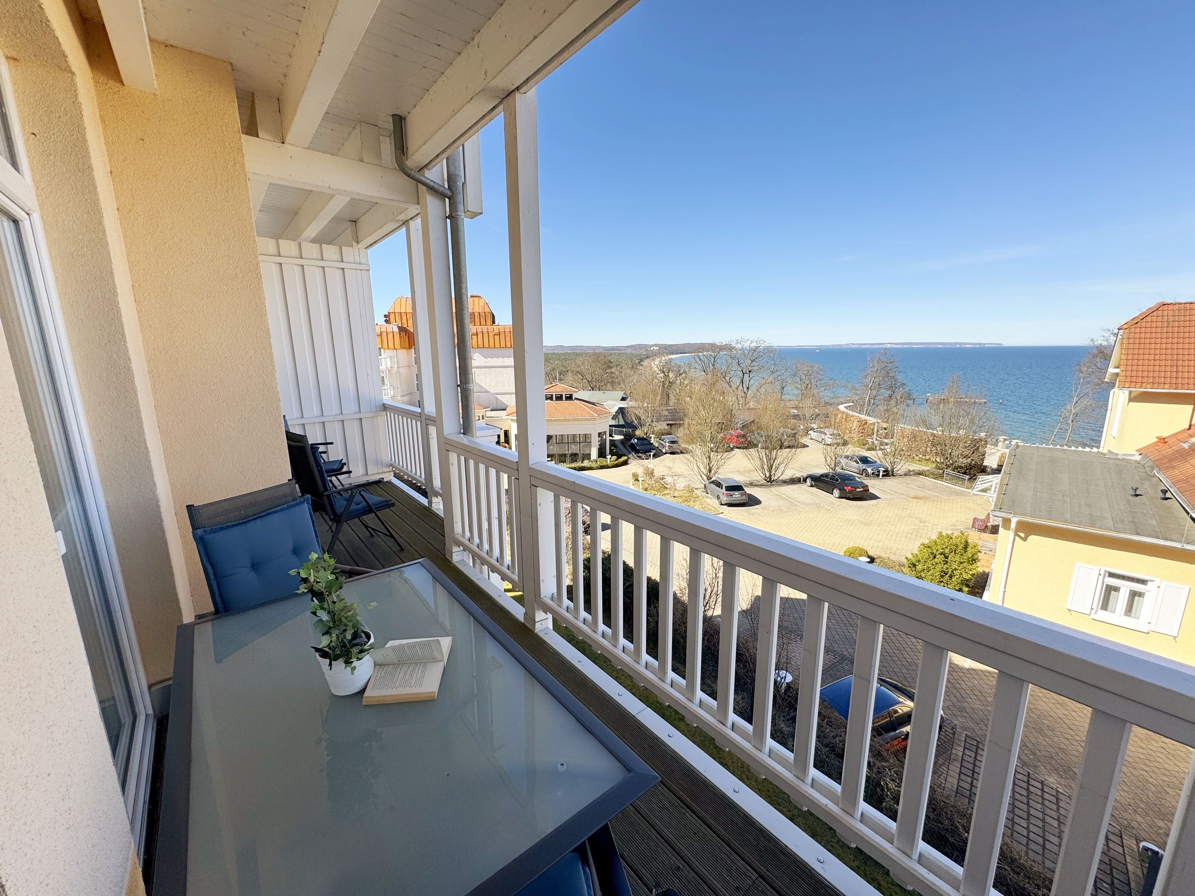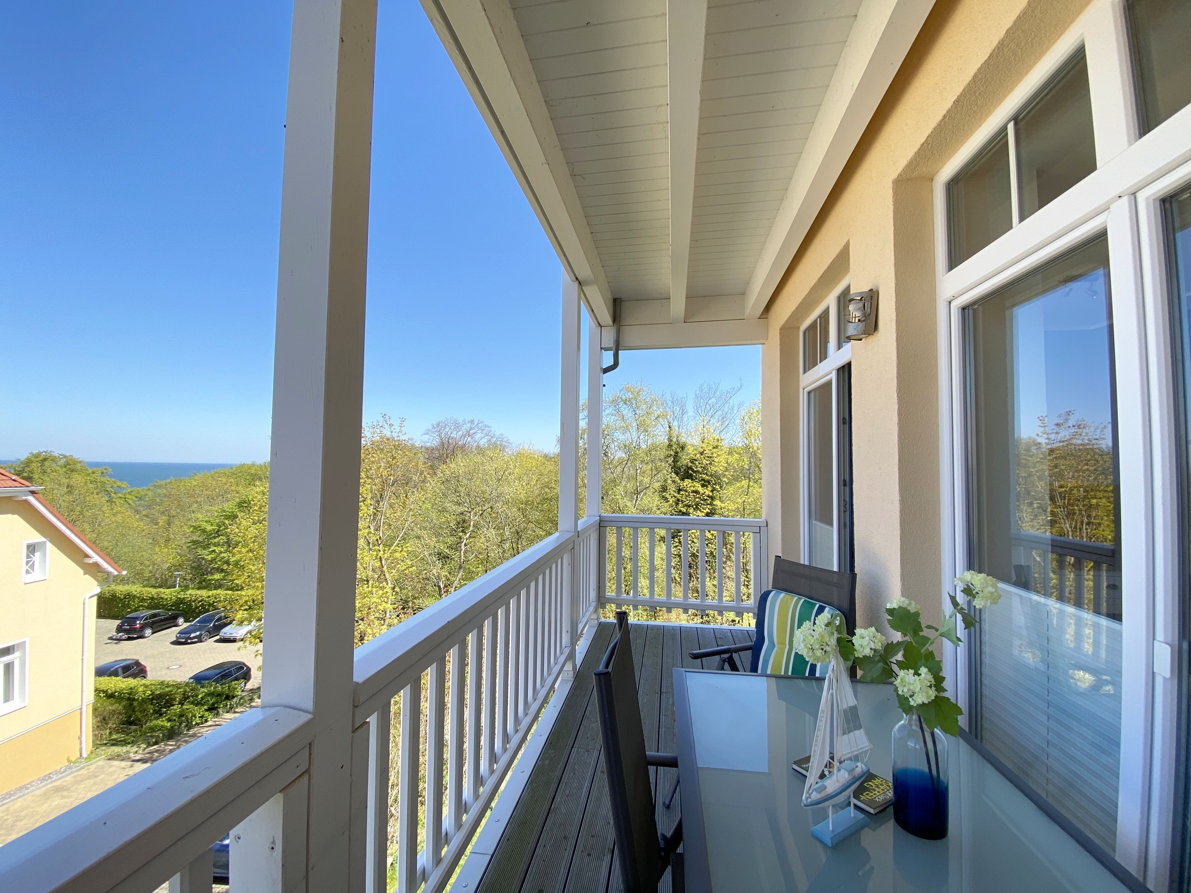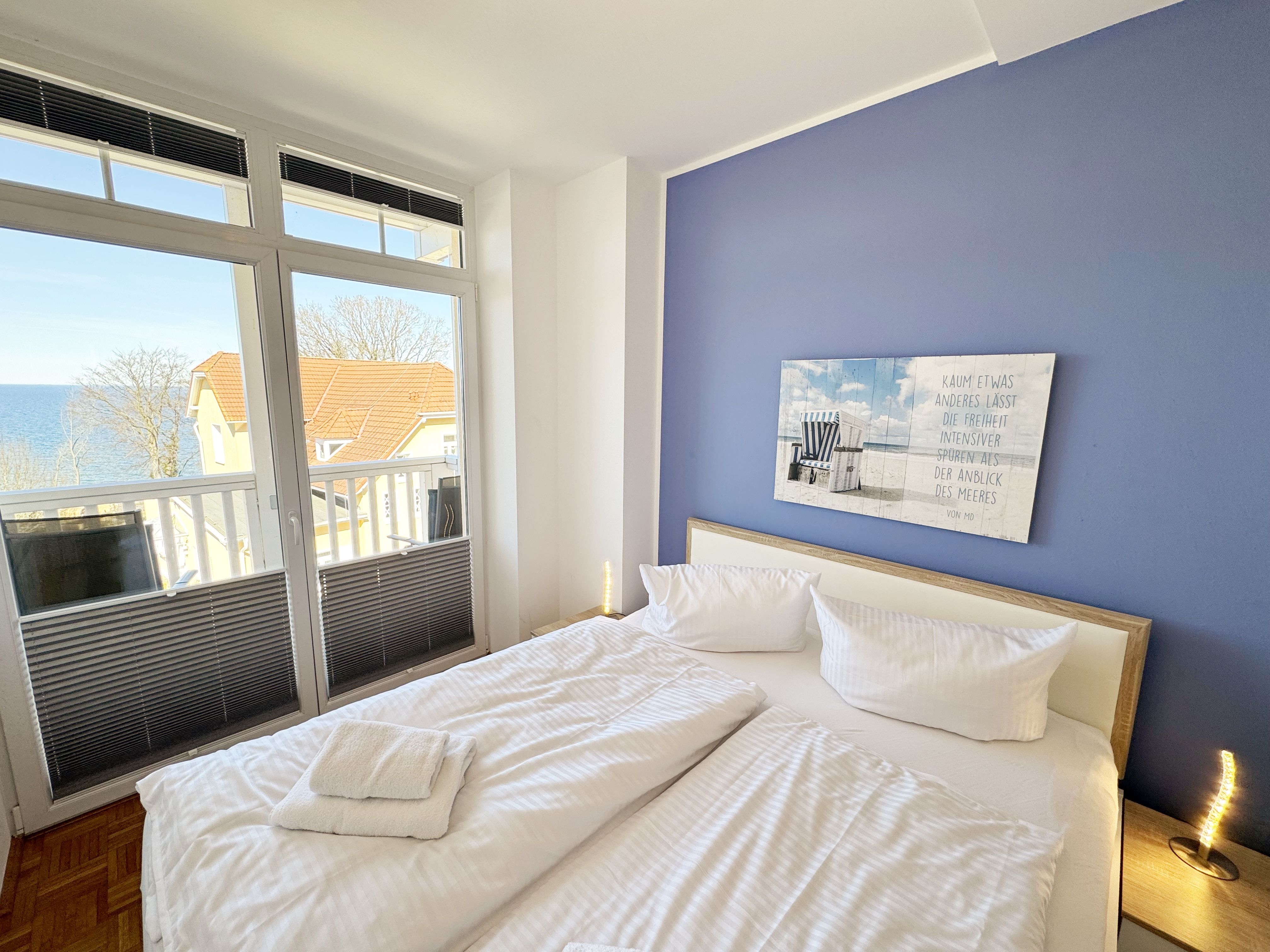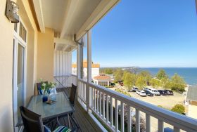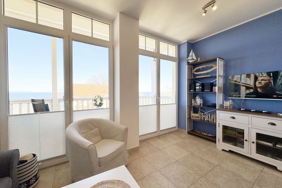 Die komfortable Nichtraucherferienwohnung in der Villa Bergfrieden bietet mit ca. 53 qm Platz für max. 2 bis 4 Personen. Die Wohnung befindet sich in der 1. Etage. Der Wohn- und Essbereich besteht aus einer gemütlichen, ausziehbaren Couchecke (Aufbettungsmöglichkeit für 3./4. Person, 1,40m x 2,00m), einem Couchtisch, einer Anrichte mit einem Smart-TV, einem DVD-Player, einem Radio mit CD-Player sowie einen WLAN-Zugang, welcher für Sie inklusive ist. Abgerundet wird der Bereich mit einer kleinen Auswahl an Gesellschaftsspielen und Urlaubslektüre. Am angrenzenden Essbereich befindet sich eine voll ausgestattete moderne Küchenzeile mit einem Geschirrspüler, einer Spüle, einem Kühlschrank mit Eisfach, einen Backofen mit 4-Zonen-Cerankochfeld, einen Wasserkocher, einer Kaffeemaschine, einen Toaster, einer Cafissimo Maschine sowie diverse Küchenutensilien. Ein Esstisch komplettiert den Bereich. Das helle Schlafzimmer besteht aus einem Doppelbett mit 2 einzelnen Matratzen (1,60m x 2,00m), verstellbare Lattenroste, Nachtischablagen mit Beleuchtung sowie einem Kleiderschrank. Vom Wohnbereich sowie auch vom Schlafzimmer können Sie den bestuhlten Balkon mit Sonnenschirm betreten. Hier haben Sie einen herrlichen Blick auf die Ostsee, wo Sie schon bei Ihrem Frühstück die Aussicht genießen können. Das innenliegende und geflieste Bad verfügt über eine Dusche, ein WC, einen Kosmetikspiegel und einen Fön. Im kleinen Abstellraum befindet sich ein Staubsauger, ein Wäscheständer, ein Bügelbrett und ein Bügeleisen sowie weitere Reinigungsutensilien. Bis zu 2 Haustiere können Sie gerne gegen eine Gebühr dazu buchen. Ihr PKW-Stellplatz Nr. 06 befindet sich direkt am Haus. Ihre geliehenen oder mitgebrachten Fahrräder können Sie in einem Fahrräderständer direkt vor dem Haus abstellen. Die Erstausstattung eines Wäschepaketes (komplette Bettwäsche, 1 Duschhandtuch, 2 kleine Handtücher) können Sie bis 14 Tage vor der Anreise gegen einen Aufpreis dazu buchen oder durch eigenes Ergänzen. Ab 2 gebuchten Paketen erhalten Sie einmalig 1 Geschirrtuch und einen Duschvorleger dazu.