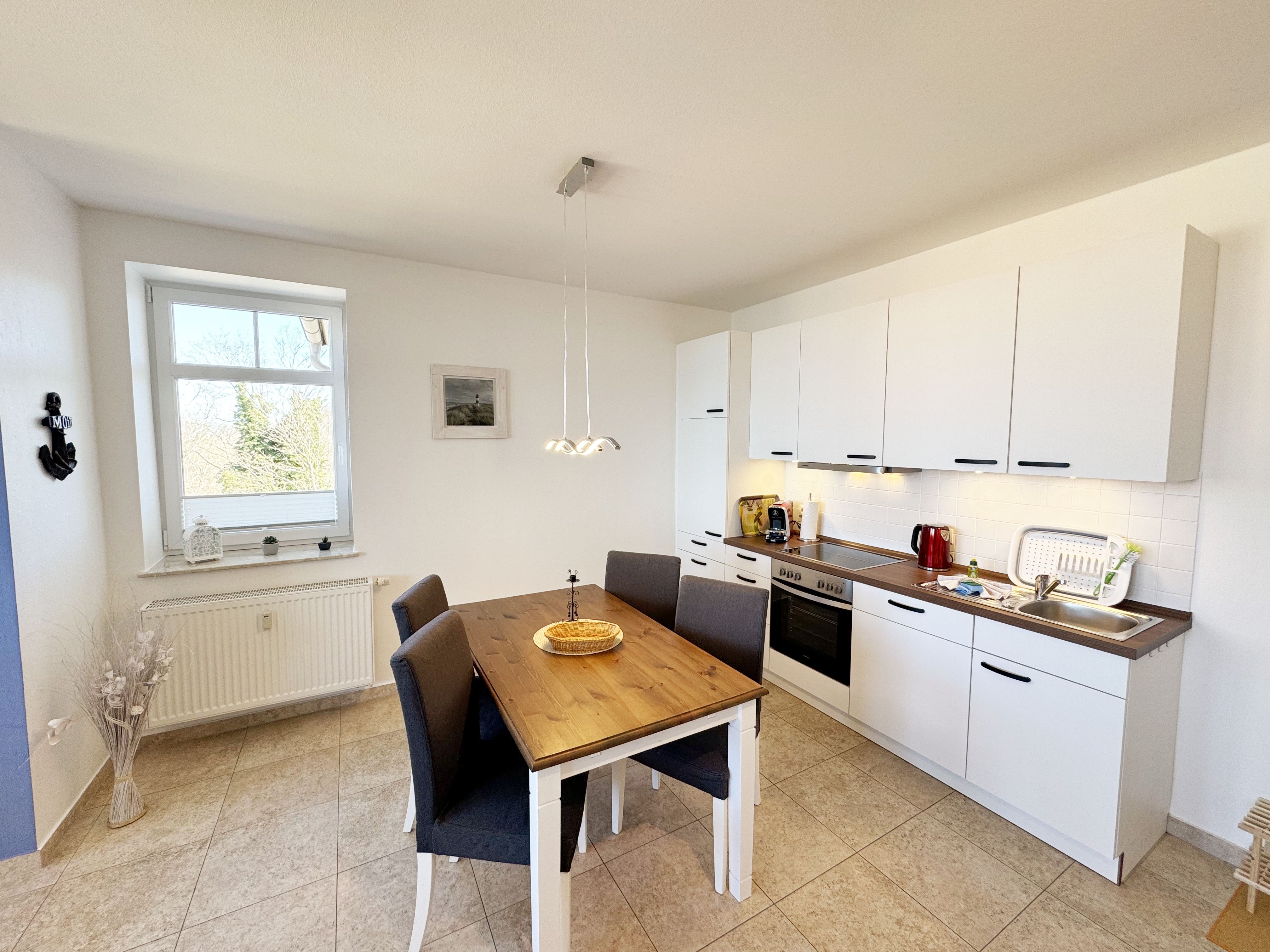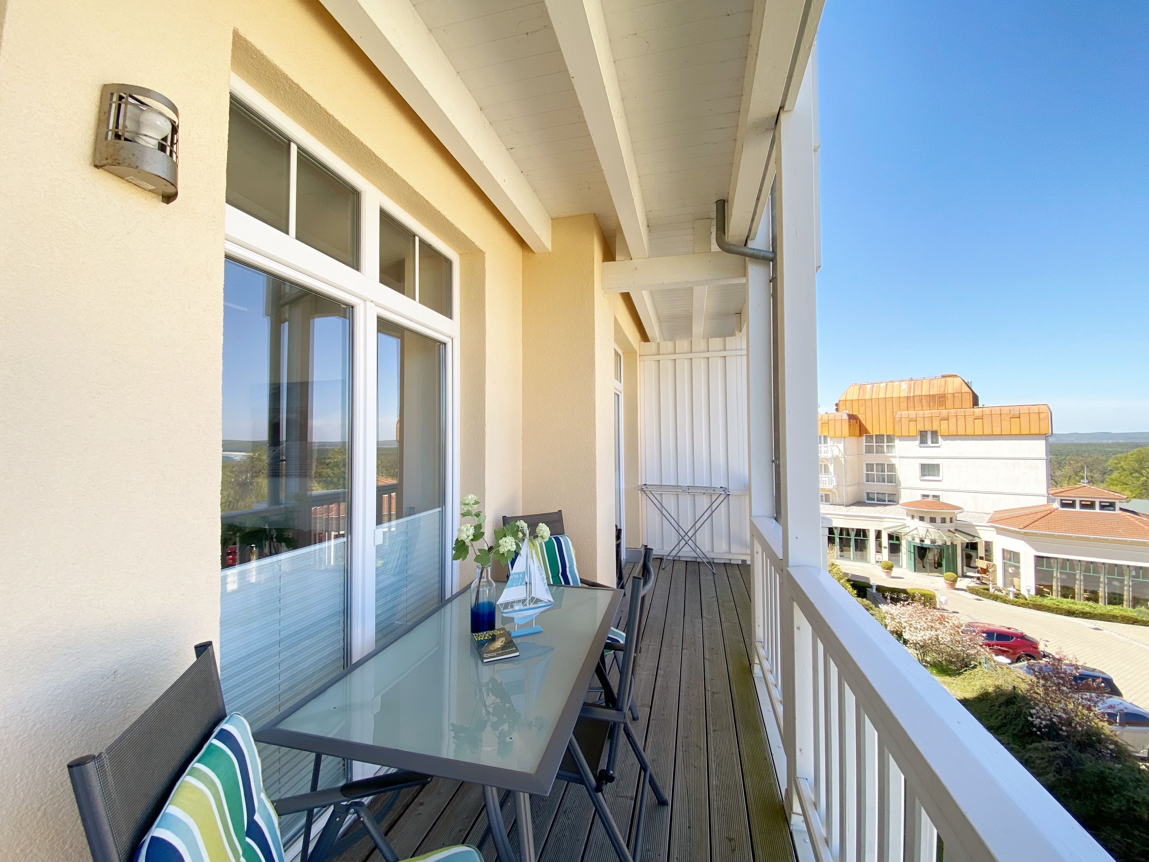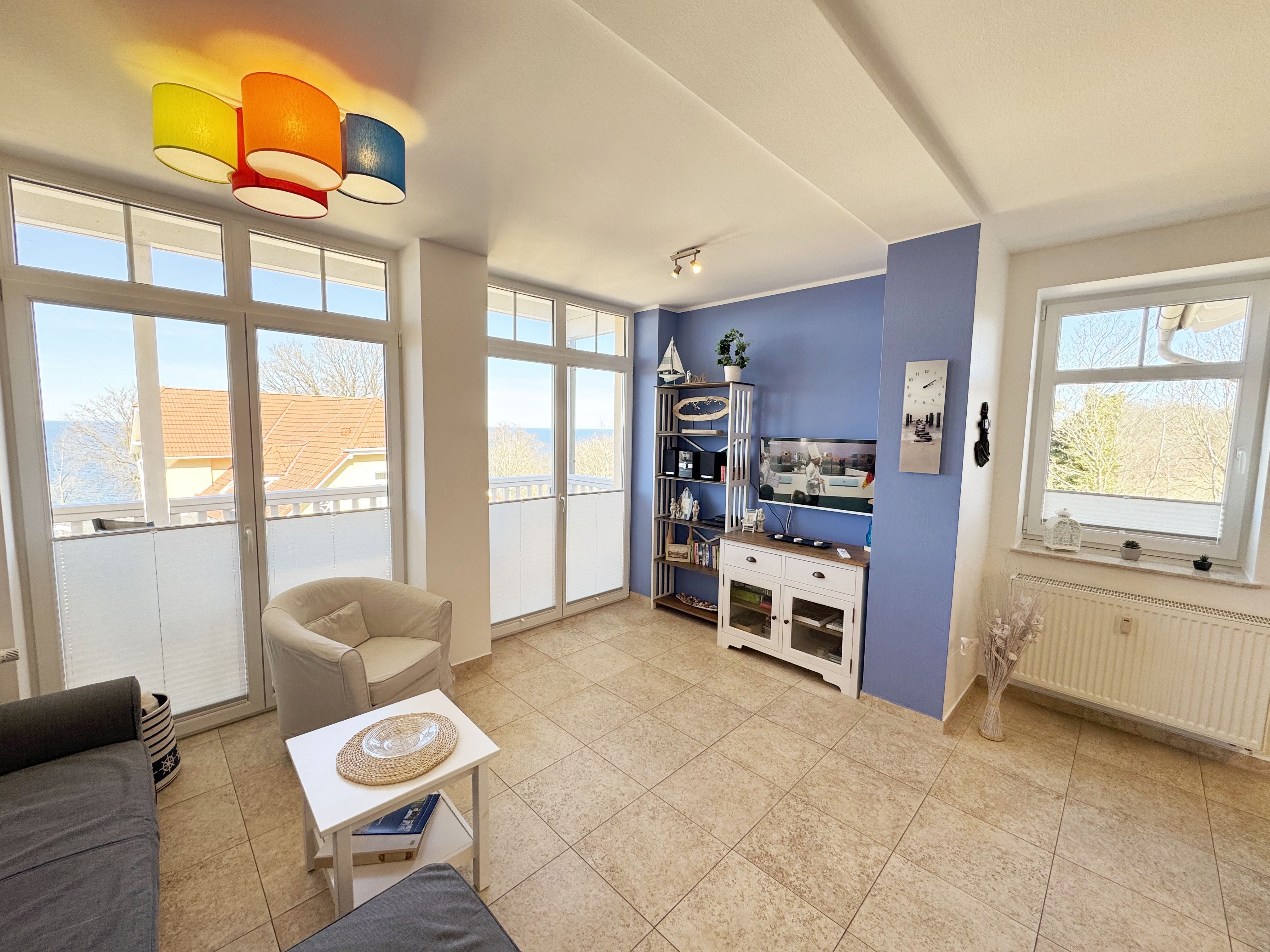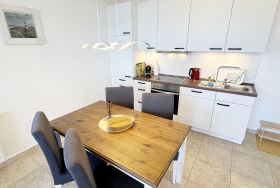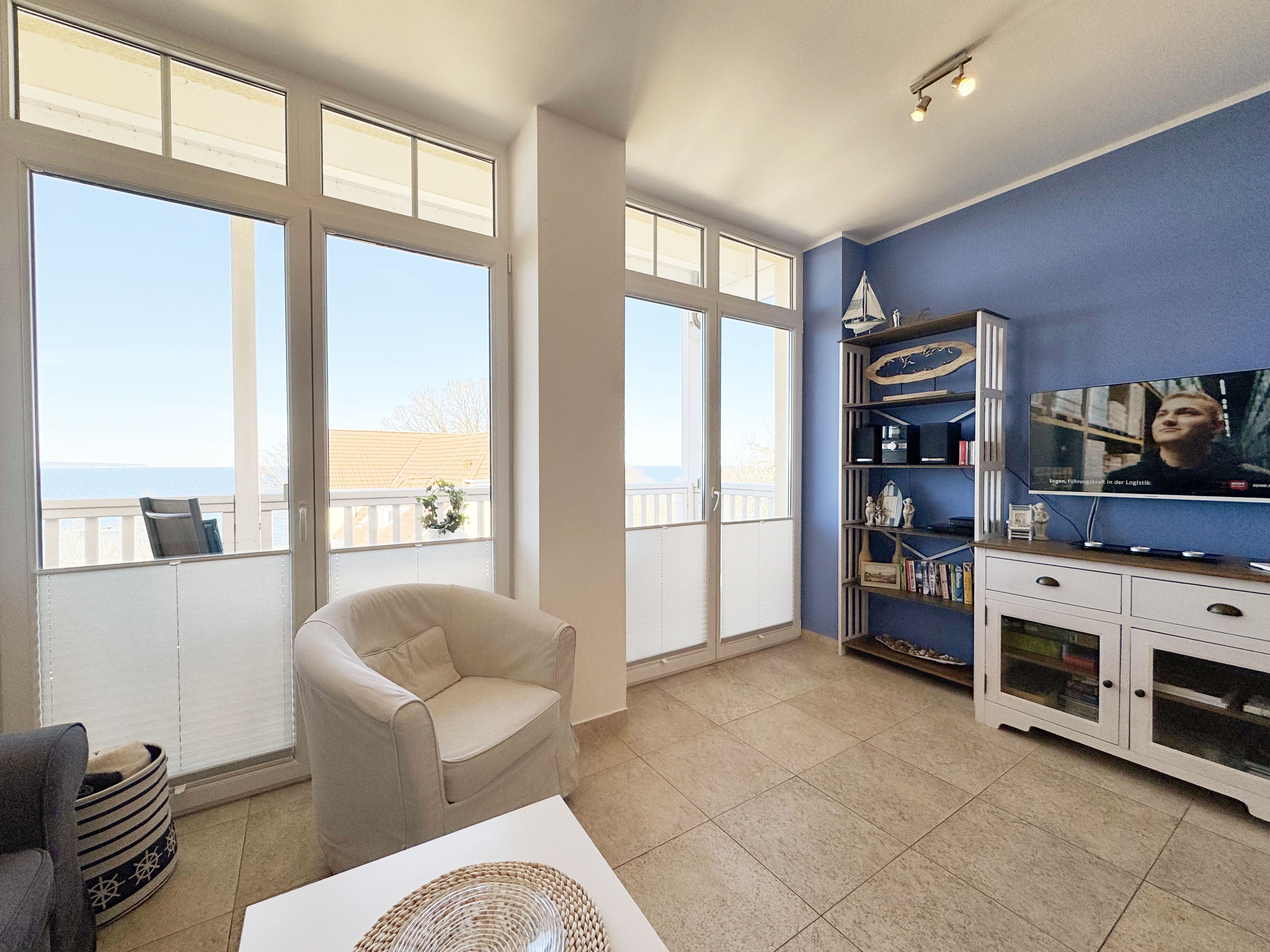 Die komfortable Nichtraucherferienwohnung in der Villa Bergfrieden bietet mit ca. 53 qm Platz für max. 2 bis 4 Personen. Die Wohnung befindet sich in der 1. Etage. Der Wohn- und Essbereich besteht aus einer gemütlichen, ausziehbaren Couchecke (Aufbettungsmöglichkeit für 3./4. Person, 1,40m x 2,00m), einem Couchtisch, einer Anrichte mit einem Smart-TV, einem DVD-Player, einem Radio mit CD-Player sowie einen WLAN-Zugang, welcher für Sie inklusive ist. Abgerundet wird der Bereich mit einer kleinen Auswahl an Gesellschaftsspielen und Urlaubslektüre. Am angrenzenden Essbereich befindet sich eine voll ausgestattete moderne Küchenzeile mit einem Geschirrspüler, einer Spüle, einem Kühlschrank mit Eisfach, einen Backofen mit 4-Zonen-Cerankochfeld, einen Wasserkocher, einer Kaffeemaschine, einen Toaster, einer Cafissimo Maschine sowie diverse Küchenutensilien. Ein Esstisch komplettiert den Bereich. Das helle Schlafzimmer besteht aus einem Doppelbett mit 2 einzelnen Matratzen (1,60m x 2,00m), verstellbare Lattenroste, Nachtischablagen mit Beleuchtung sowie einem Kleiderschrank. Vom Wohnbereich sowie auch vom Schlafzimmer können Sie den bestuhlten Balkon mit Sonnenschirm betreten. Hier haben Sie einen herrlichen Blick auf die Ostsee, wo Sie schon bei Ihrem Frühstück die Aussicht genießen können. Das innenliegende und geflieste Bad verfügt über eine Dusche, ein WC, einen Kosmetikspiegel und einen Fön. Im kleinen Abstellraum befindet sich ein Staubsauger, ein Wäscheständer, ein Bügelbrett und ein Bügeleisen sowie weitere Reinigungsutensilien. Bis zu 2 Haustiere können Sie gerne gegen eine Gebühr dazu buchen. Ihr PKW-Stellplatz Nr. 06 befindet sich direkt am Haus. Ihre geliehenen oder mitgebrachten Fahrräder können Sie in einem Fahrräderständer direkt vor dem Haus abstellen. Die Erstausstattung eines Wäschepaketes (komplette Bettwäsche, 1 Duschhandtuch, 2 kleine Handtücher) können Sie bis 14 Tage vor der Anreise gegen einen Aufpreis dazu buchen oder durch eigenes Ergänzen. Ab 2 gebuchten Paketen erhalten Sie einmalig 1 Geschirrtuch und einen Duschvorleger dazu.