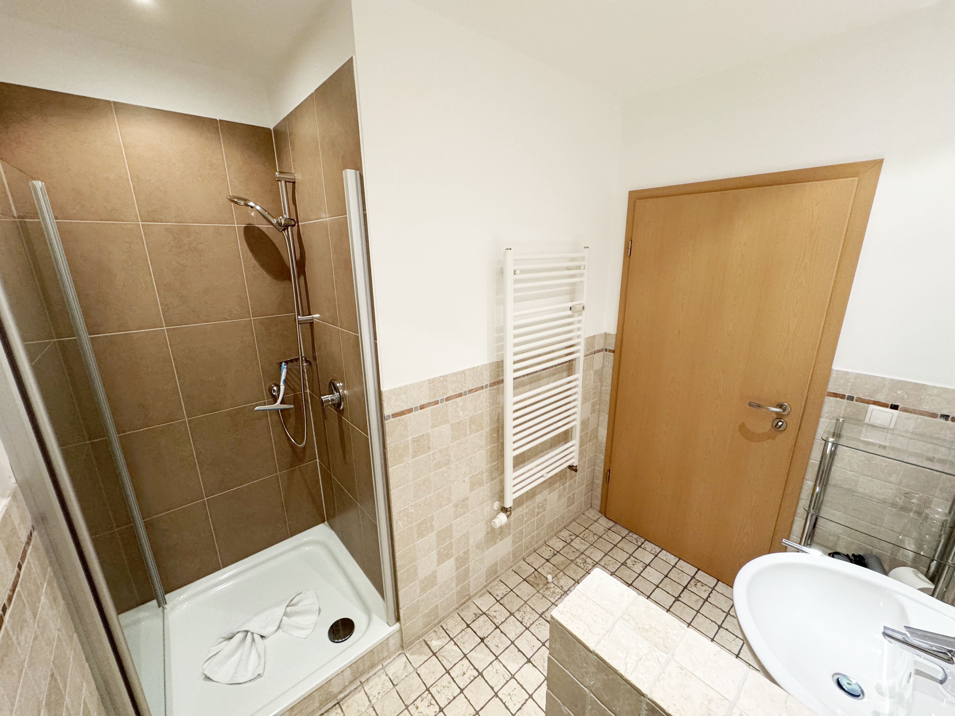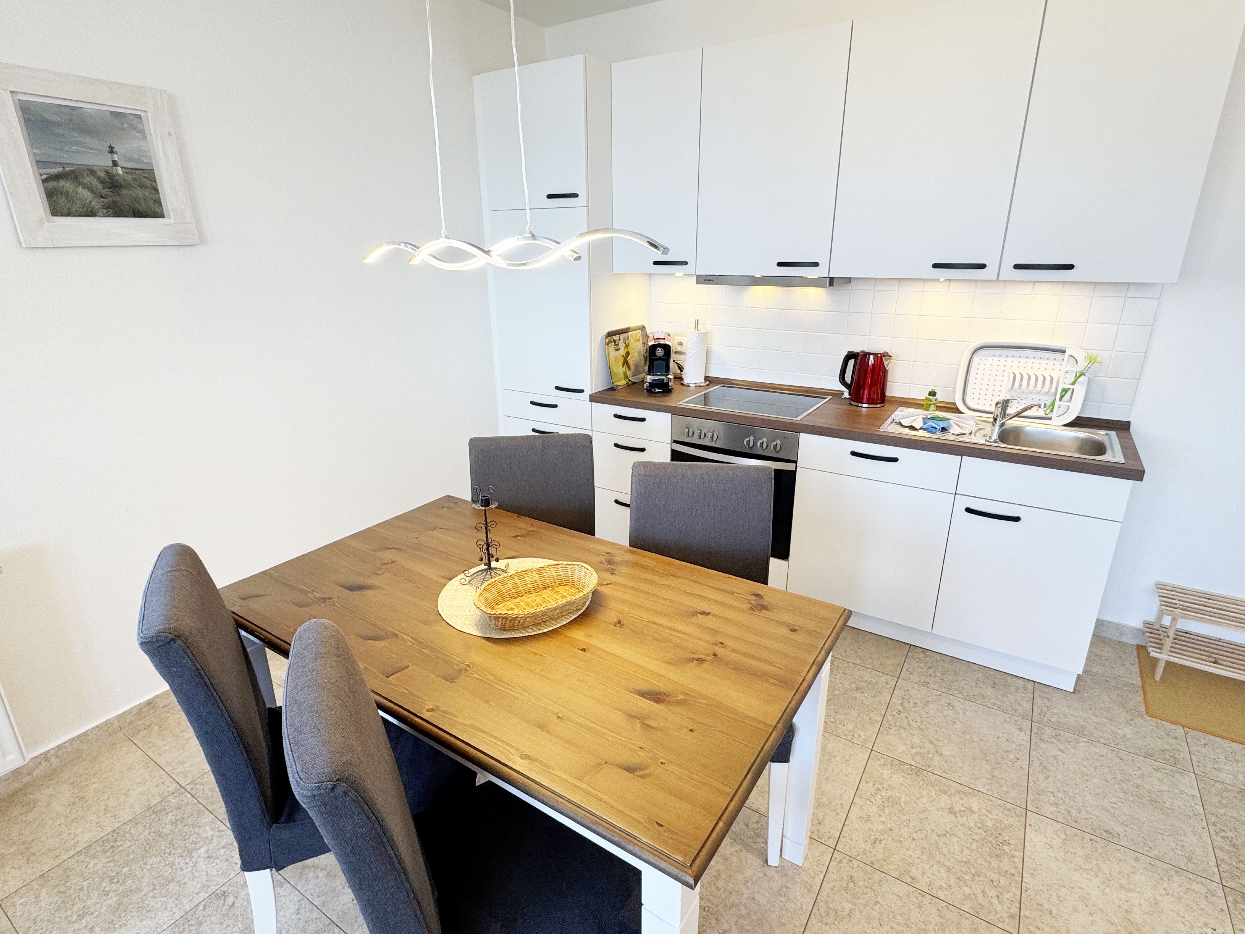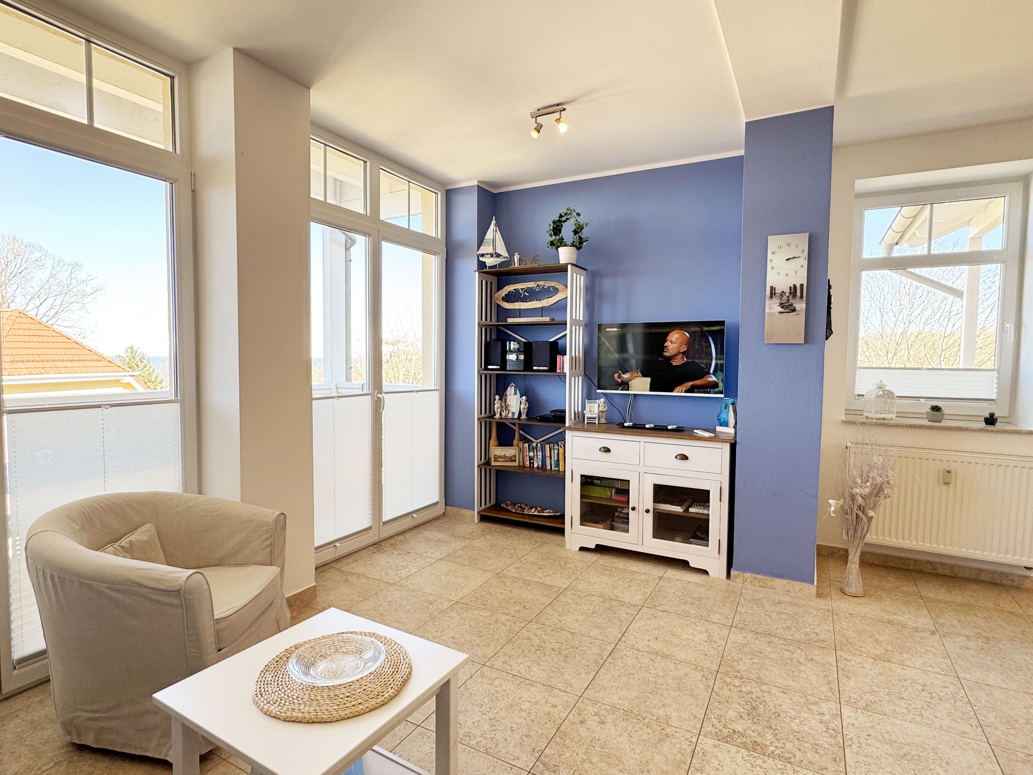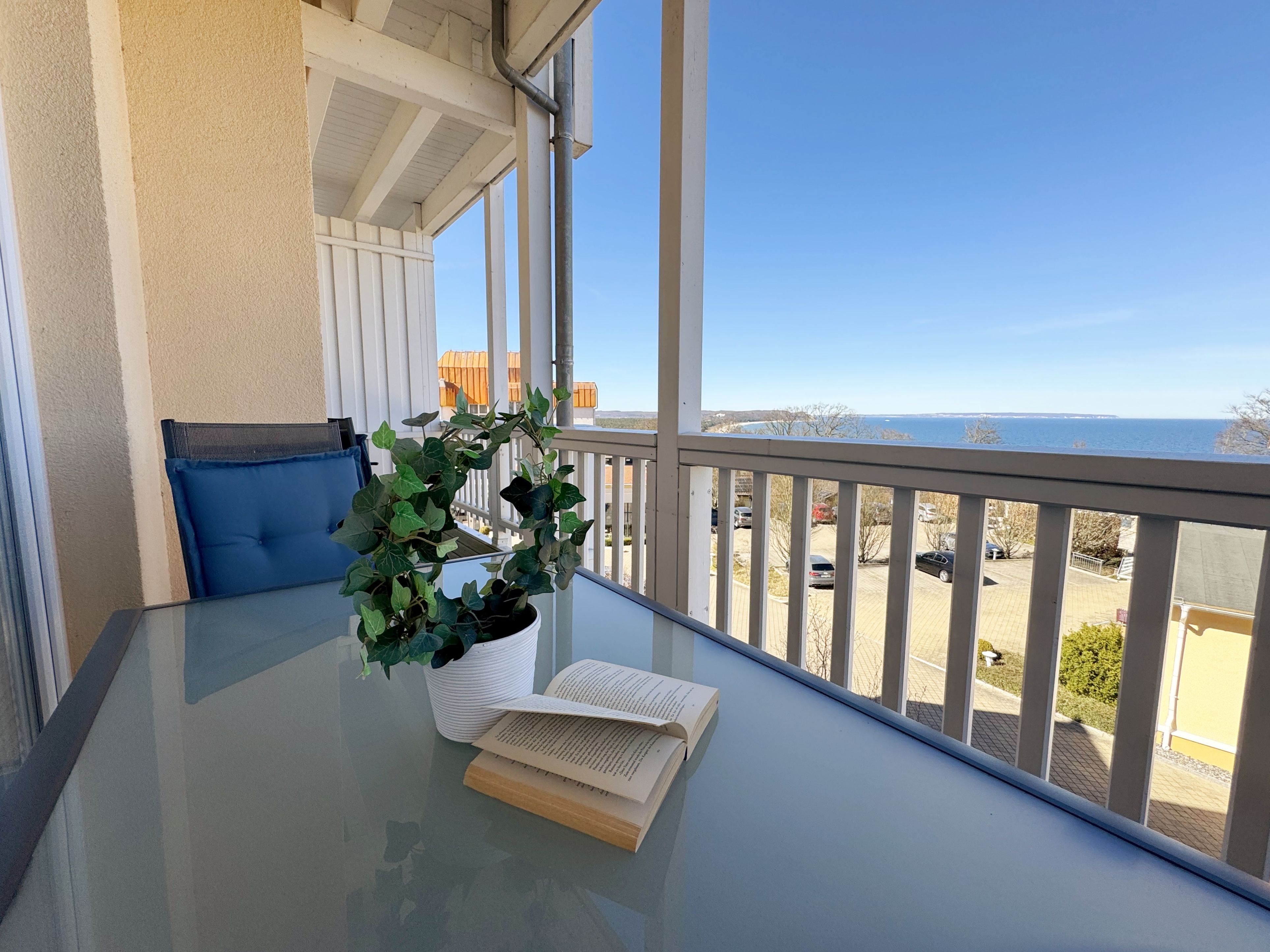 Die komfortable Nichtraucherferienwohnung in der Villa Bergfrieden bietet mit ca. 53 qm Platz für max. 2 bis 4 Personen. Die Wohnung befindet sich in der 1. Etage. Der Wohn- und Essbereich besteht aus einer gemütlichen, ausziehbaren Couchecke (Aufbettungsmöglichkeit für 3./4. Person, 1,40m x 2,00m), einem Couchtisch, einer Anrichte mit einem Smart-TV, einem DVD-Player, einem Radio mit CD-Player sowie einen WLAN-Zugang, welcher für Sie inklusive ist. Abgerundet wird der Bereich mit einer kleinen Auswahl an Gesellschaftsspielen und Urlaubslektüre. Am angrenzenden Essbereich befindet sich eine voll ausgestattete moderne Küchenzeile mit einem Geschirrspüler, einer Spüle, einem Kühlschrank mit Eisfach, einen Backofen mit 4-Zonen-Cerankochfeld, einen Wasserkocher, einer Kaffeemaschine, einen Toaster, einer Cafissimo Maschine sowie diverse Küchenutensilien. Ein Esstisch komplettiert den Bereich. Das helle Schlafzimmer besteht aus einem Doppelbett mit 2 einzelnen Matratzen (1,60m x 2,00m), verstellbare Lattenroste, Nachtischablagen mit Beleuchtung sowie einem Kleiderschrank. Vom Wohnbereich sowie auch vom Schlafzimmer können Sie den bestuhlten Balkon mit Sonnenschirm betreten. Hier haben Sie einen herrlichen Blick auf die Ostsee, wo Sie schon bei Ihrem Frühstück die Aussicht genießen können. Das innenliegende und geflieste Bad verfügt über eine Dusche, ein WC, einen Kosmetikspiegel und einen Fön. Im kleinen Abstellraum befindet sich ein Staubsauger, ein Wäscheständer, ein Bügelbrett und ein Bügeleisen sowie weitere Reinigungsutensilien. Bis zu 2 Haustiere können Sie gerne gegen eine Gebühr dazu buchen. Ihr PKW-Stellplatz Nr. 06 befindet sich direkt am Haus. Ihre geliehenen oder mitgebrachten Fahrräder können Sie in einem Fahrräderständer direkt vor dem Haus abstellen. Die Erstausstattung eines Wäschepaketes (komplette Bettwäsche, 1 Duschhandtuch, 2 kleine Handtücher) können Sie bis 14 Tage vor der Anreise gegen einen Aufpreis dazu buchen oder durch eigenes Ergänzen. Ab 2 gebuchten Paketen erhalten Sie einmalig 1 Geschirrtuch und einen Duschvorleger dazu.