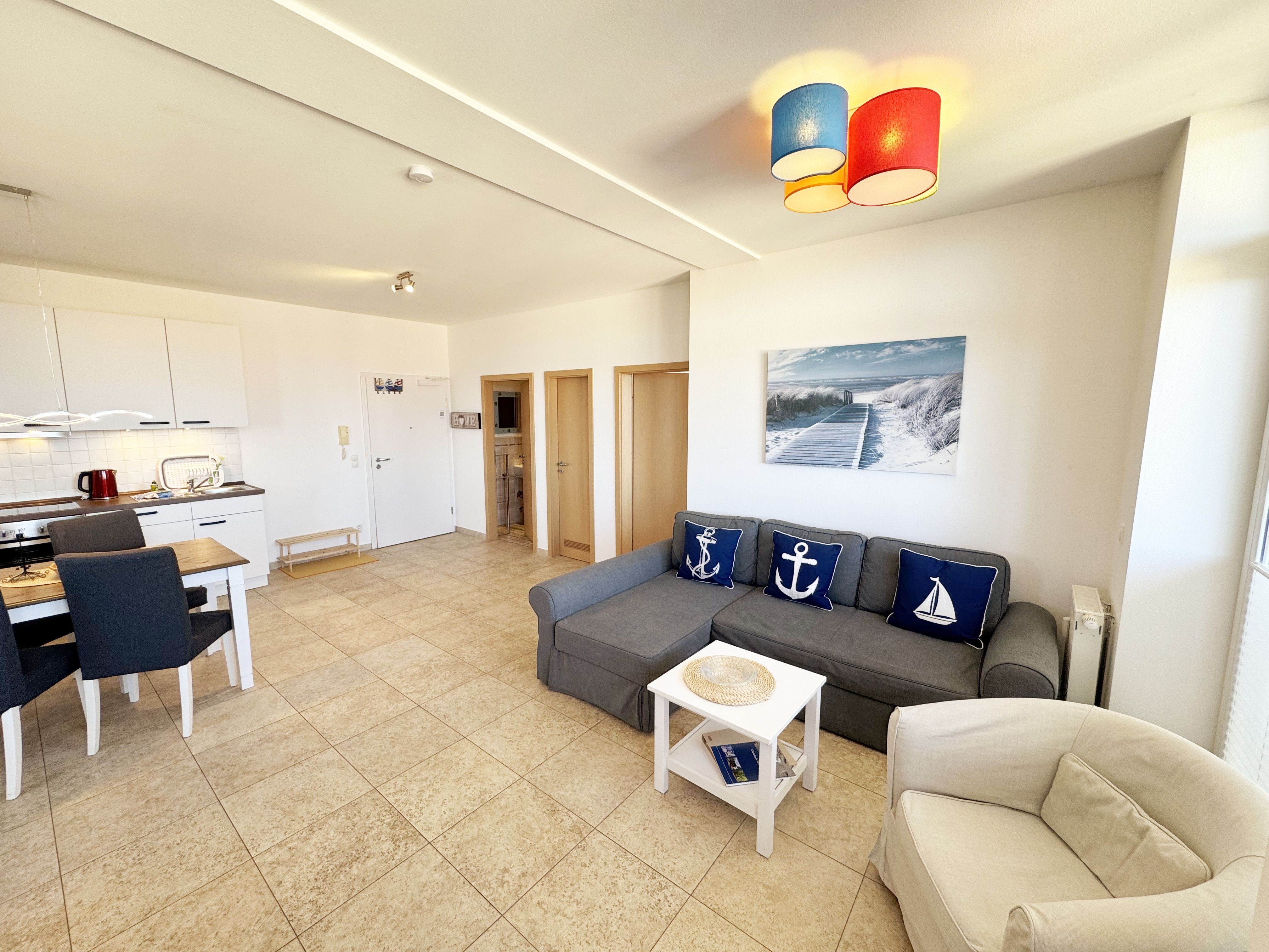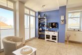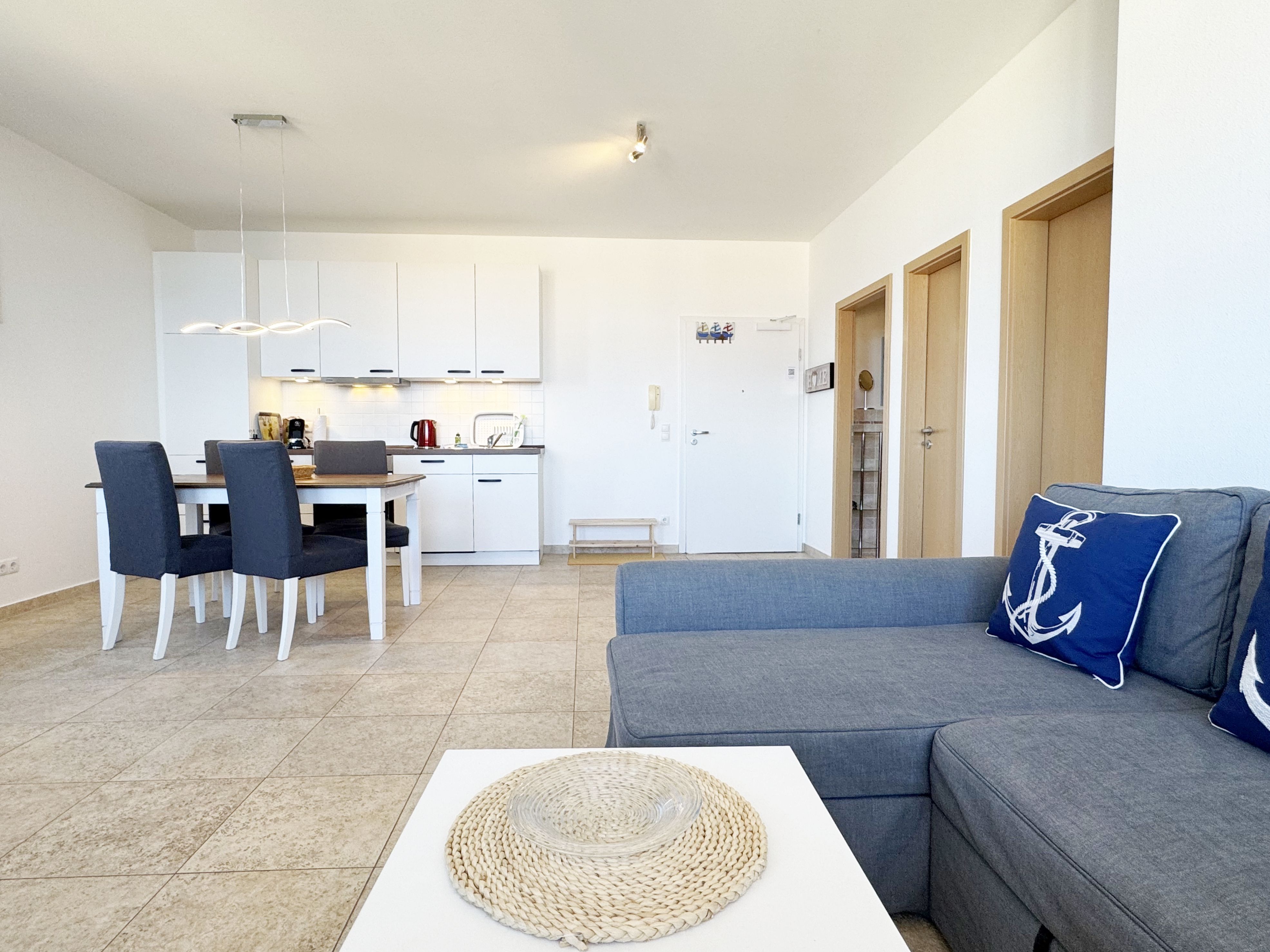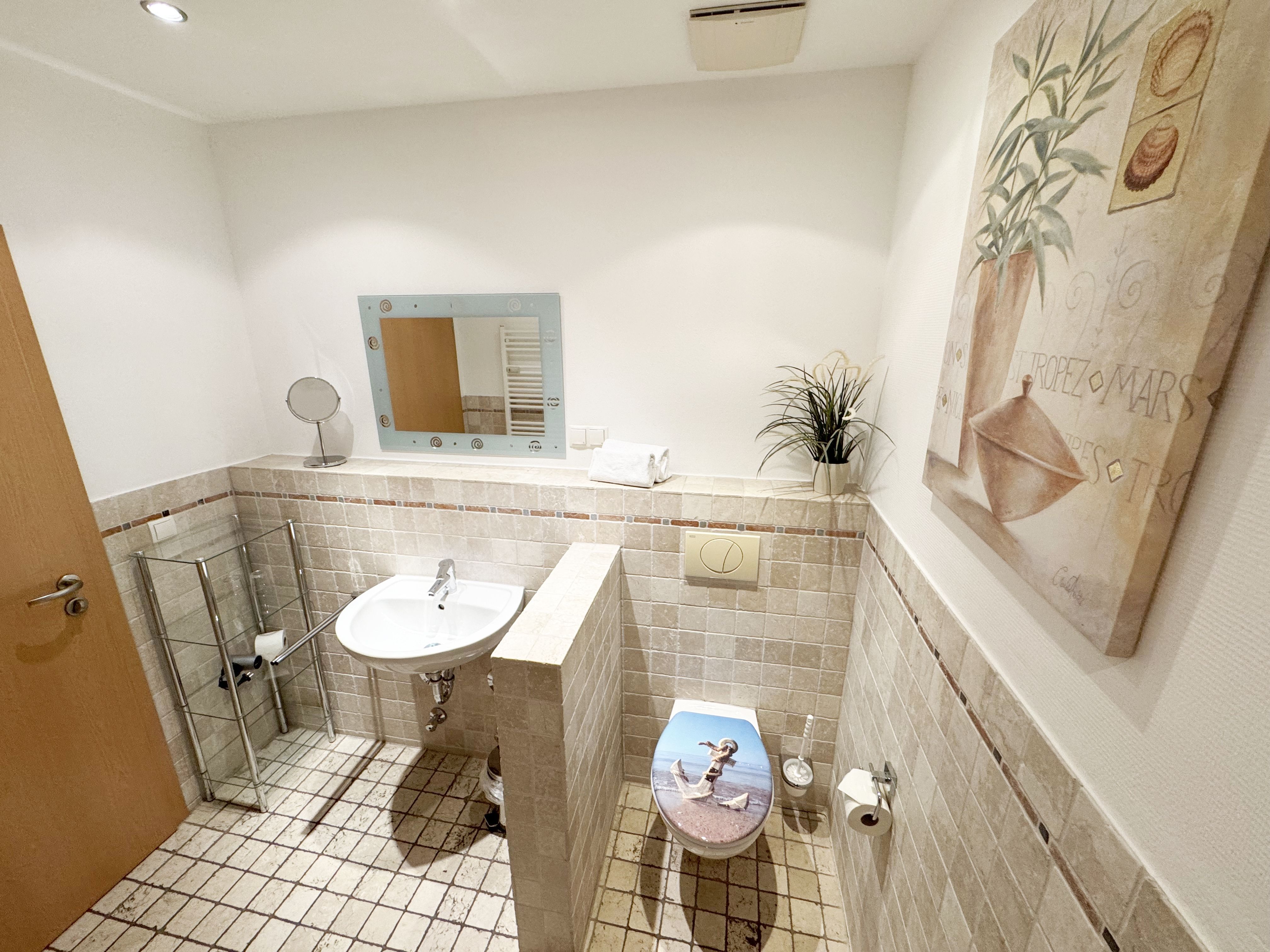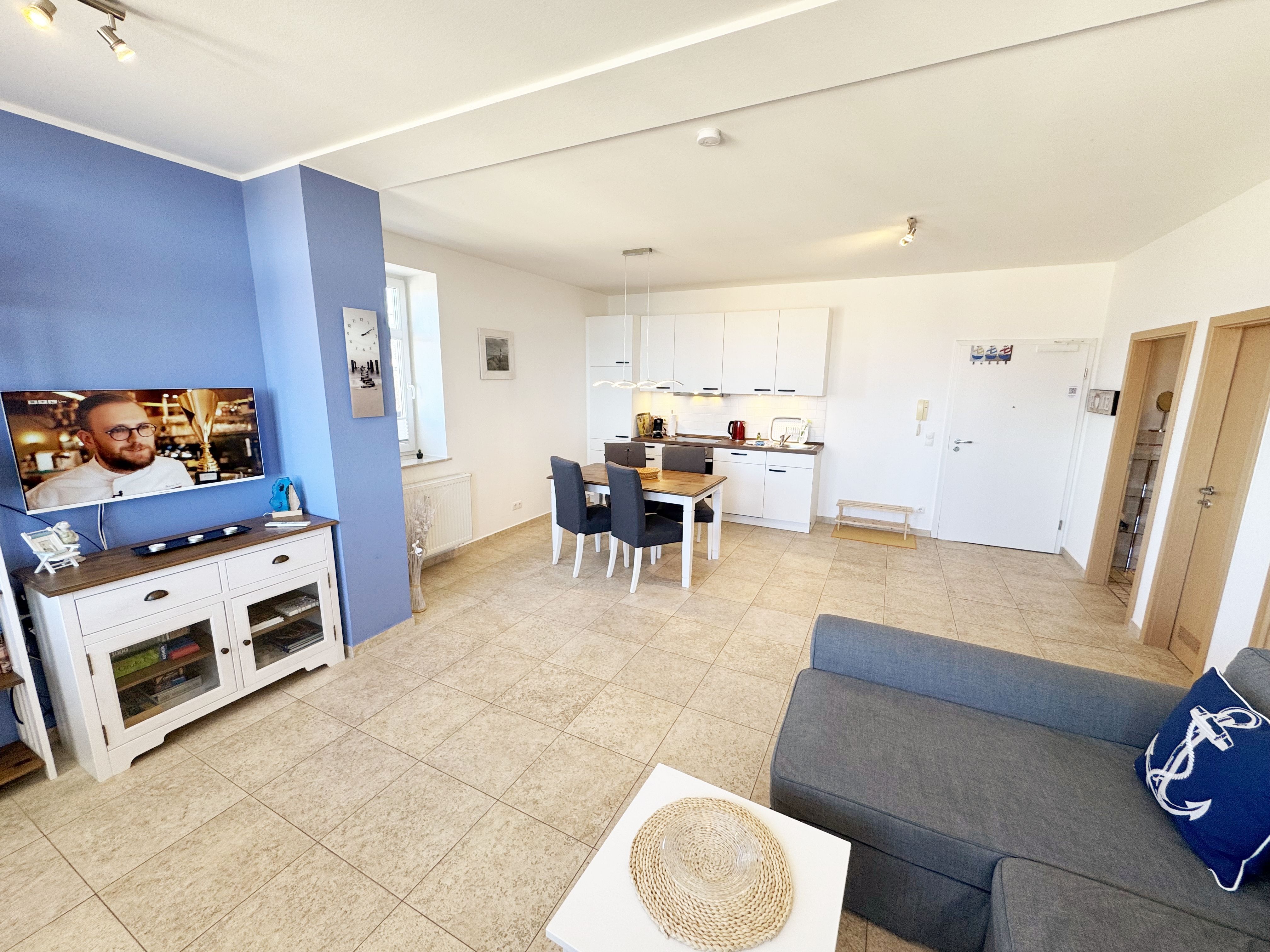 Die komfortable Nichtraucherferienwohnung in der Villa Bergfrieden bietet mit ca. 53 qm Platz für max. 2 bis 4 Personen. Die Wohnung befindet sich in der 1. Etage. Der Wohn- und Essbereich besteht aus einer gemütlichen, ausziehbaren Couchecke (Aufbettungsmöglichkeit für 3./4. Person, 1,40m x 2,00m), einem Couchtisch, einer Anrichte mit einem Smart-TV, einem DVD-Player, einem Radio mit CD-Player sowie einen WLAN-Zugang, welcher für Sie inklusive ist. Abgerundet wird der Bereich mit einer kleinen Auswahl an Gesellschaftsspielen und Urlaubslektüre. Am angrenzenden Essbereich befindet sich eine voll ausgestattete moderne Küchenzeile mit einem Geschirrspüler, einer Spüle, einem Kühlschrank mit Eisfach, einen Backofen mit 4-Zonen-Cerankochfeld, einen Wasserkocher, einer Kaffeemaschine, einen Toaster, einer Cafissimo Maschine sowie diverse Küchenutensilien. Ein Esstisch komplettiert den Bereich. Das helle Schlafzimmer besteht aus einem Doppelbett mit 2 einzelnen Matratzen (1,60m x 2,00m), verstellbare Lattenroste, Nachtischablagen mit Beleuchtung sowie einem Kleiderschrank. Vom Wohnbereich sowie auch vom Schlafzimmer können Sie den bestuhlten Balkon mit Sonnenschirm betreten. Hier haben Sie einen herrlichen Blick auf die Ostsee, wo Sie schon bei Ihrem Frühstück die Aussicht genießen können. Das innenliegende und geflieste Bad verfügt über eine Dusche, ein WC, einen Kosmetikspiegel und einen Fön. Im kleinen Abstellraum befindet sich ein Staubsauger, ein Wäscheständer, ein Bügelbrett und ein Bügeleisen sowie weitere Reinigungsutensilien. Bis zu 2 Haustiere können Sie gerne gegen eine Gebühr dazu buchen. Ihr PKW-Stellplatz Nr. 06 befindet sich direkt am Haus. Ihre geliehenen oder mitgebrachten Fahrräder können Sie in einem Fahrräderständer direkt vor dem Haus abstellen. Die Erstausstattung eines Wäschepaketes (komplette Bettwäsche, 1 Duschhandtuch, 2 kleine Handtücher) können Sie bis 14 Tage vor der Anreise gegen einen Aufpreis dazu buchen oder durch eigenes Ergänzen. Ab 2 gebuchten Paketen erhalten Sie einmalig 1 Geschirrtuch und einen Duschvorleger dazu.