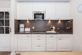 Die offene Küche ist mit einem 4-flammigen Induktionsherd, einem Geschirrspüler und allen notwendigen Geräten ausgestattet. Die vorhandene Mikrowelle dient gleichzeitig als Backofen und bietet vielseitige Kochmöglichkeiten.
