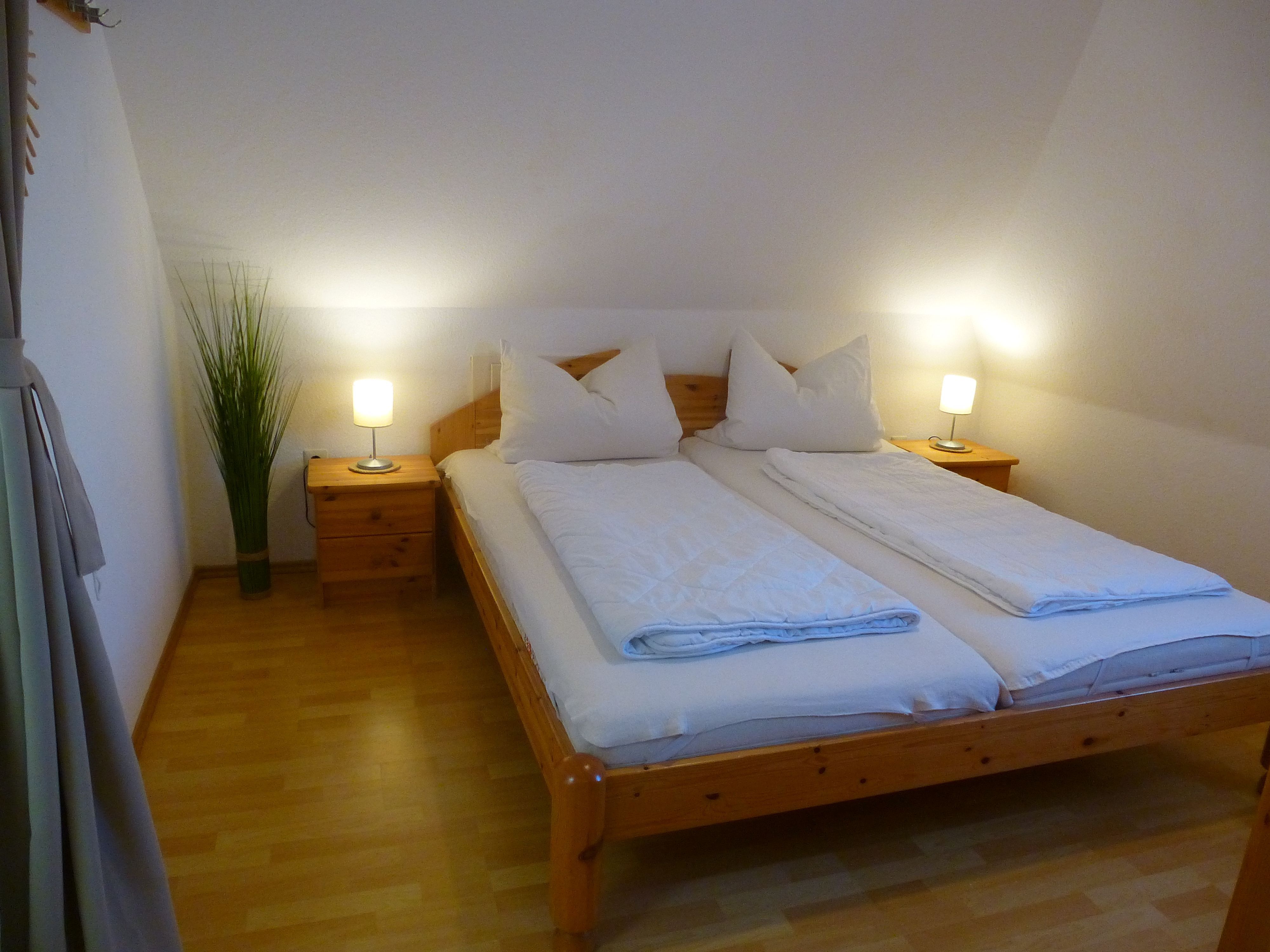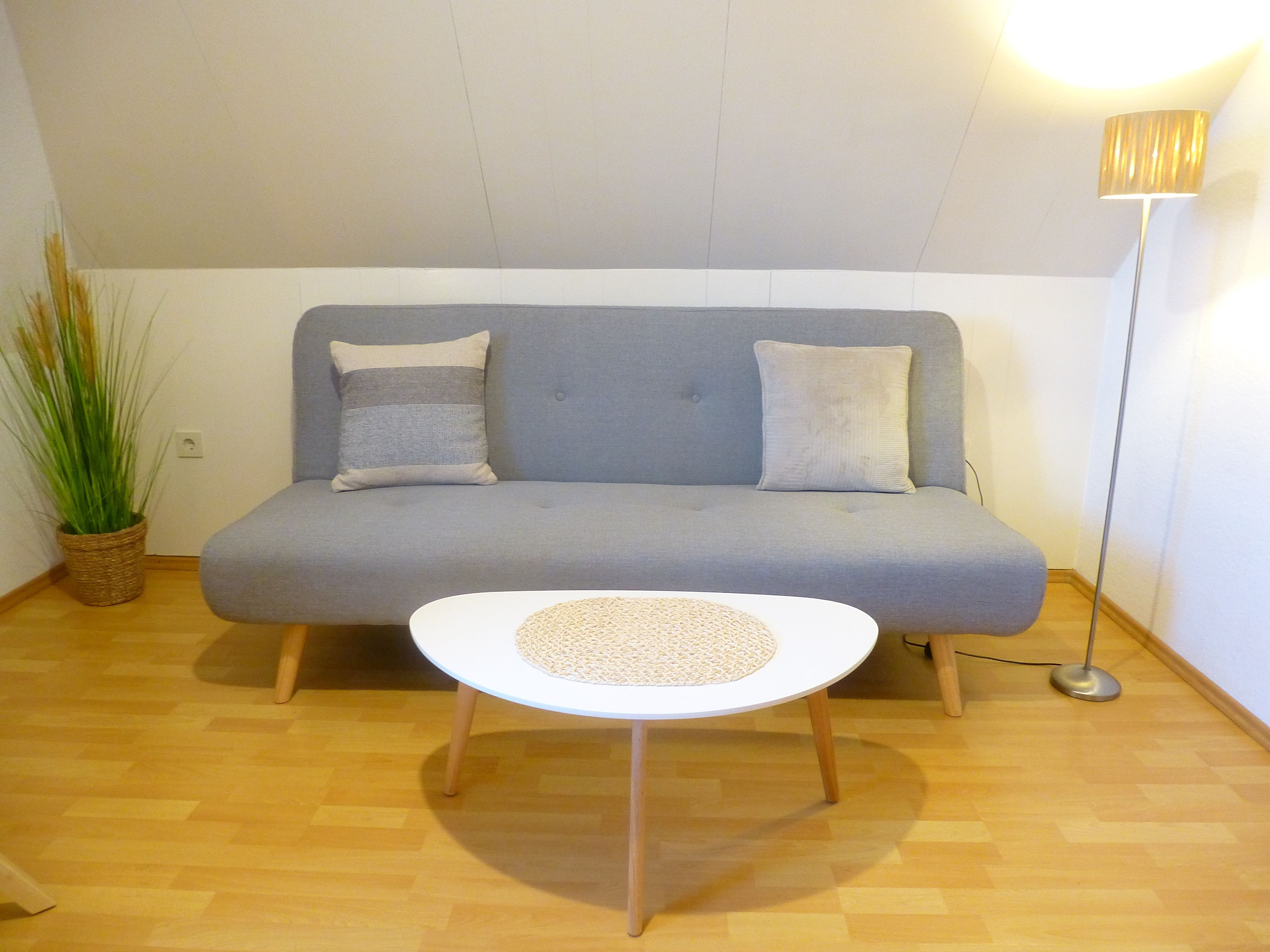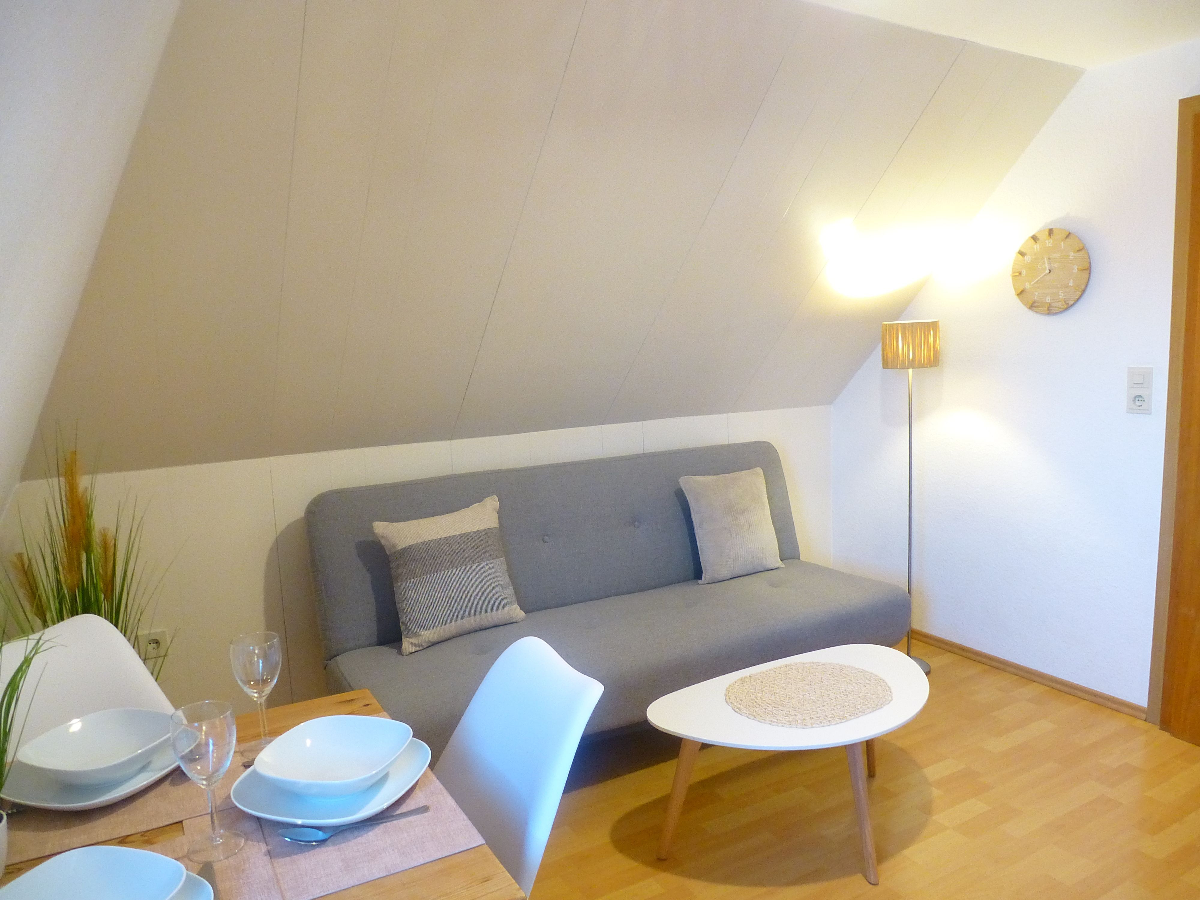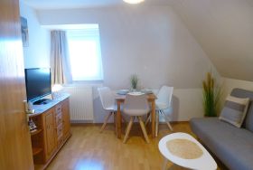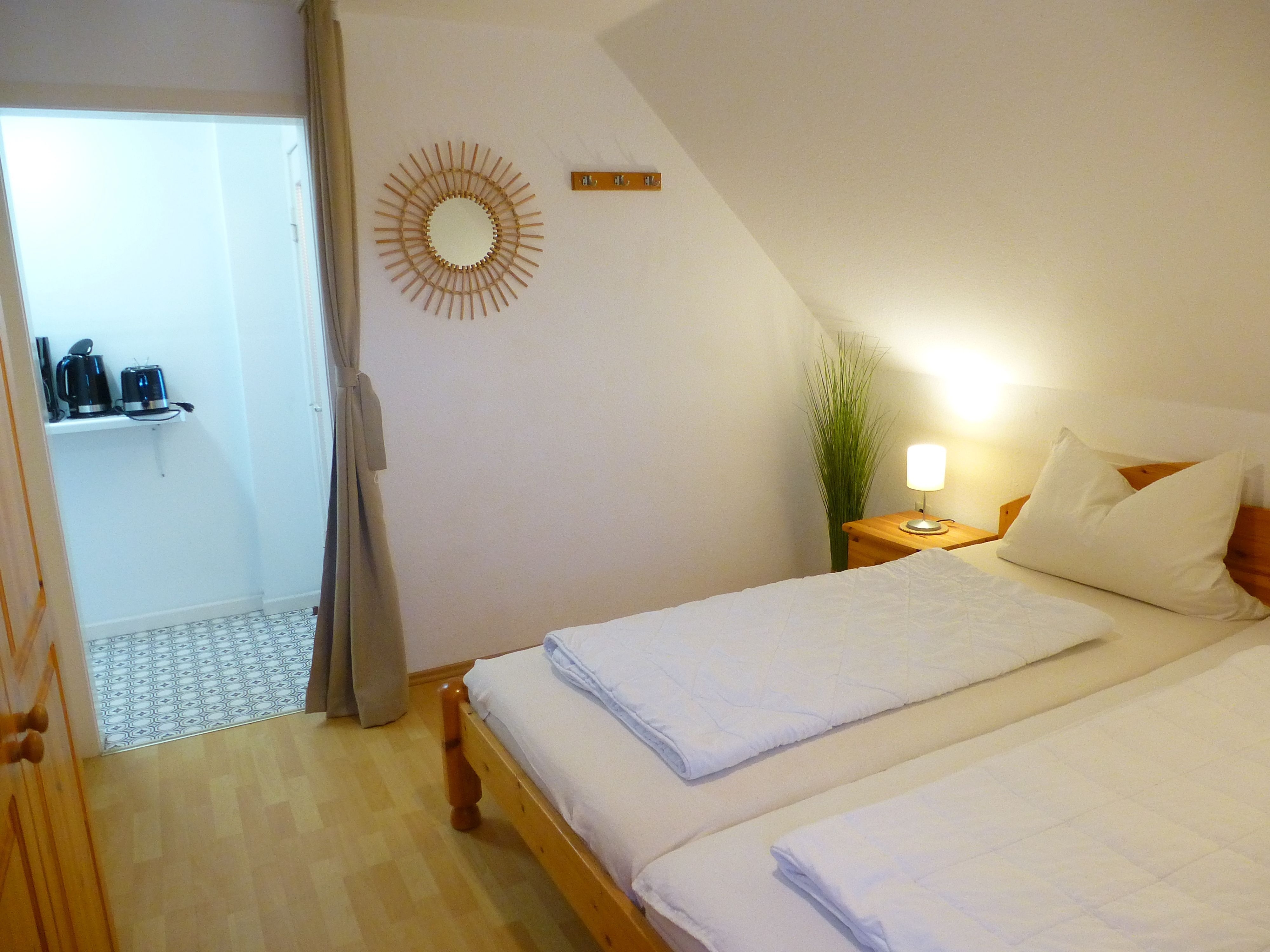 Die ca. 25 m² große Ferienwohnung befindet sich im Dachgeschoss und bietet Platz für 2-3 Personen. Sie ist klein und gemütlich. Es stehen ein Wohnzimmer, ein Schlafzimmer, eine Kochnische und ein kleines Duschbad zur Verfügung. Das Doppelbett im Schlafzimmer ist ca. 1,80 x 2,00 m groß. Im Wohnbereich ist zusätzlich ein Schlafsofa vorhanden. Die Dusche verfügt nur über eine geringe Stehhöhe bis max. 1,85. Ausstattung: WLAN, Fernseher, Kaffeemaschine, Wasserkocher, Eierkocher, Toaster. Kostenlose Parkplätze in der Nebenstraße (Nach Verfügbarkeit). Wäschepaket mit Bettwäsche, Handtüchern und Geschirrtuch bei Bedarf gegen Gebühr. Verbrauchsmaterialien (Seife, WC-Papier, Müllbeutel, etc.) sind nicht inklusive. Im Wäscheraum stehen Waschmaschine und Trockner zur Verfügung (gegen Gebühr). Die Wohnung verfügt über eine einfache Ausstattung.