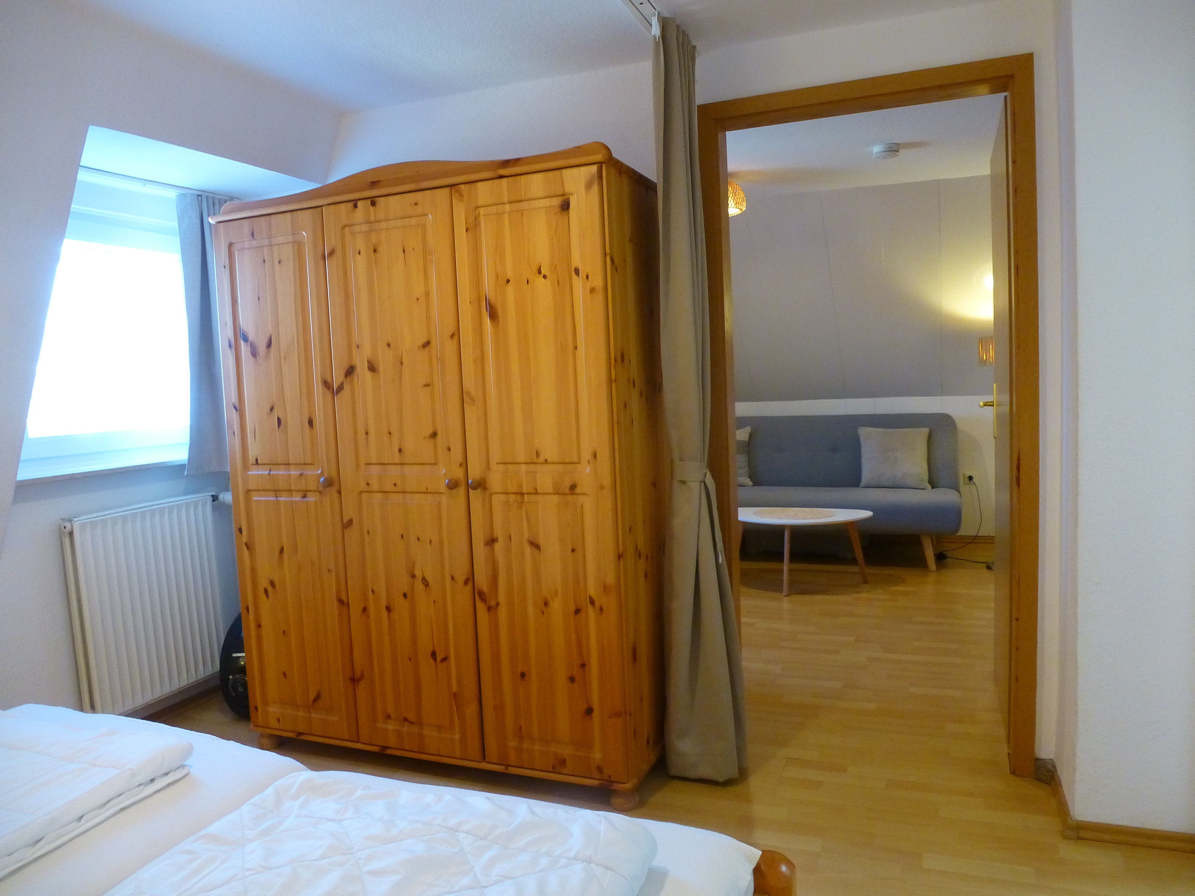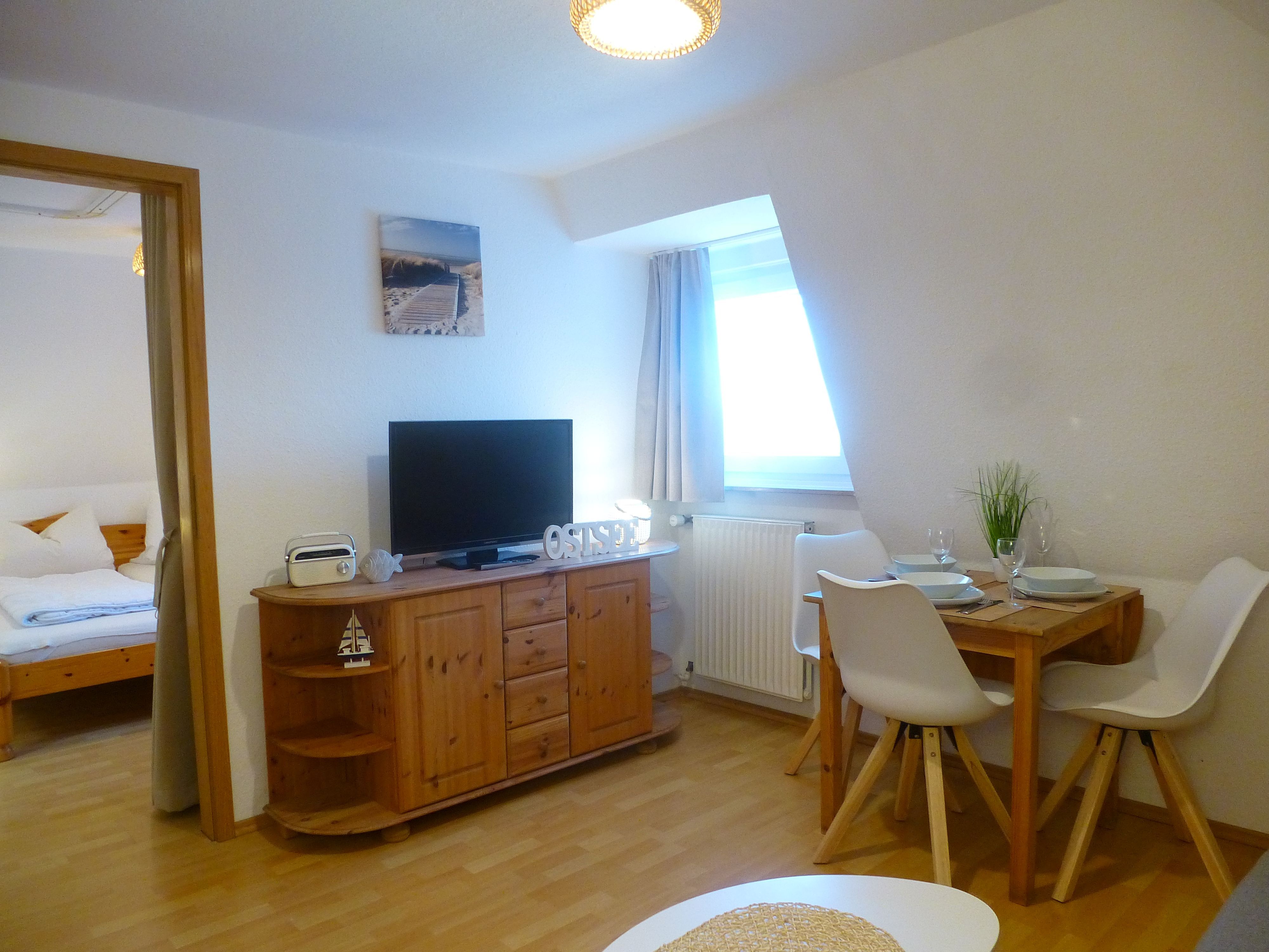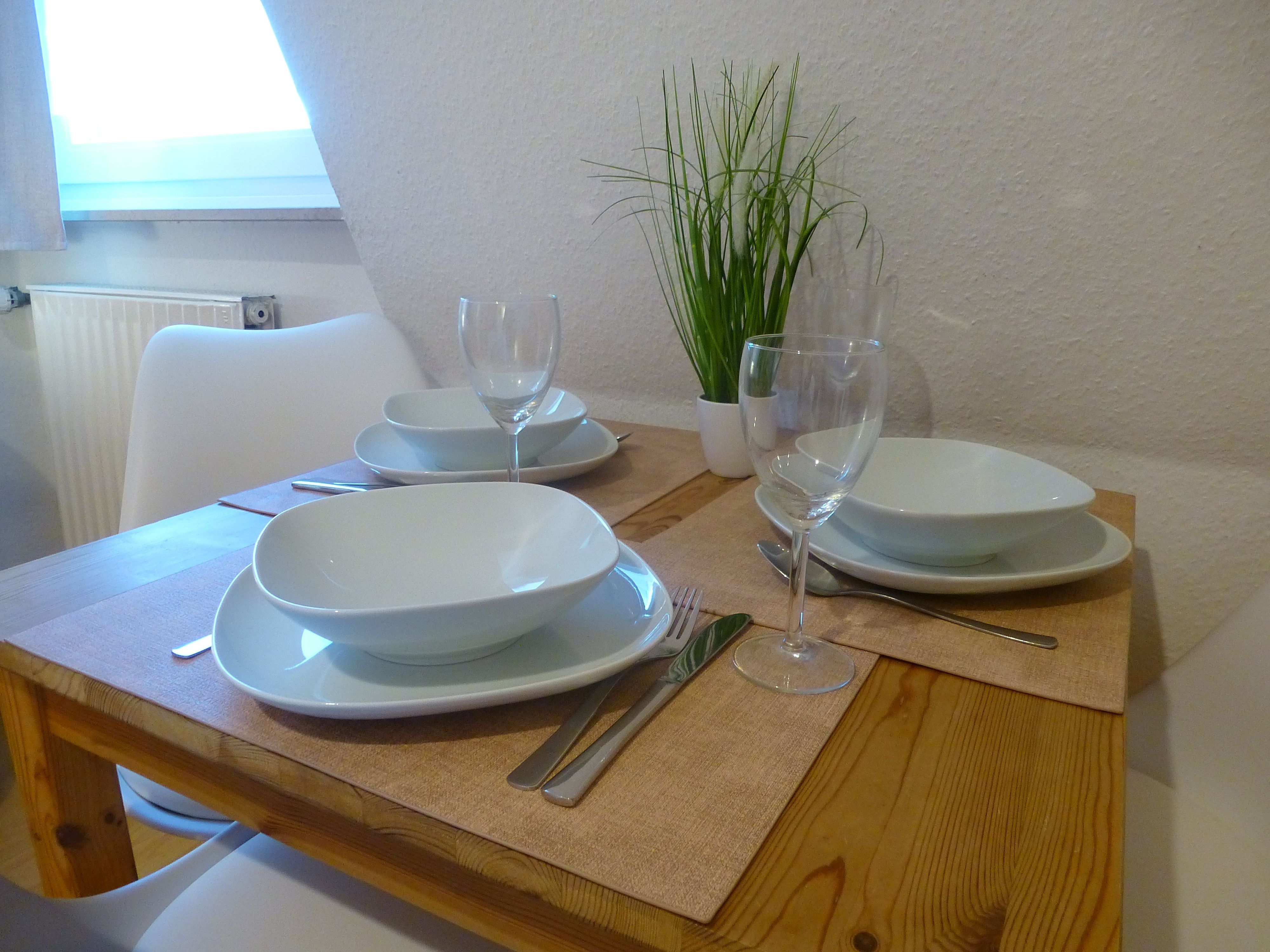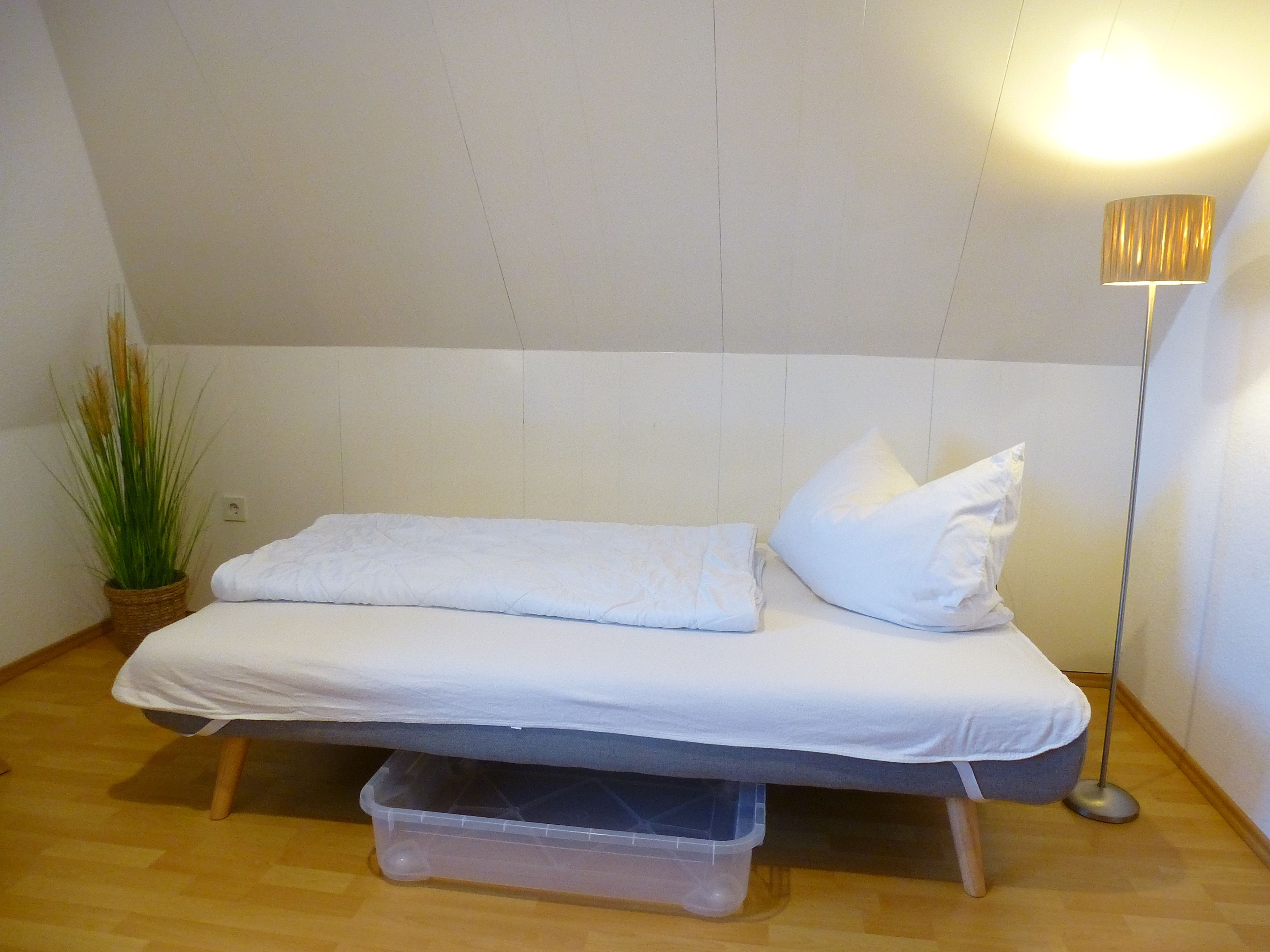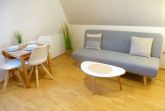 Die ca. 25 m² große Ferienwohnung befindet sich im Dachgeschoss und bietet Platz für 2-3 Personen. Sie ist klein und gemütlich. Es stehen ein Wohnzimmer, ein Schlafzimmer, eine Kochnische und ein kleines Duschbad zur Verfügung. Das Doppelbett im Schlafzimmer ist ca. 1,80 x 2,00 m groß. Im Wohnbereich ist zusätzlich ein Schlafsofa vorhanden. Die Dusche verfügt nur über eine geringe Stehhöhe bis max. 1,85. Ausstattung: WLAN, Fernseher, Kaffeemaschine, Wasserkocher, Eierkocher, Toaster. Kostenlose Parkplätze in der Nebenstraße (Nach Verfügbarkeit). Wäschepaket mit Bettwäsche, Handtüchern und Geschirrtuch bei Bedarf gegen Gebühr. Verbrauchsmaterialien (Seife, WC-Papier, Müllbeutel, etc.) sind nicht inklusive. Im Wäscheraum stehen Waschmaschine und Trockner zur Verfügung (gegen Gebühr). Die Wohnung verfügt über eine einfache Ausstattung.