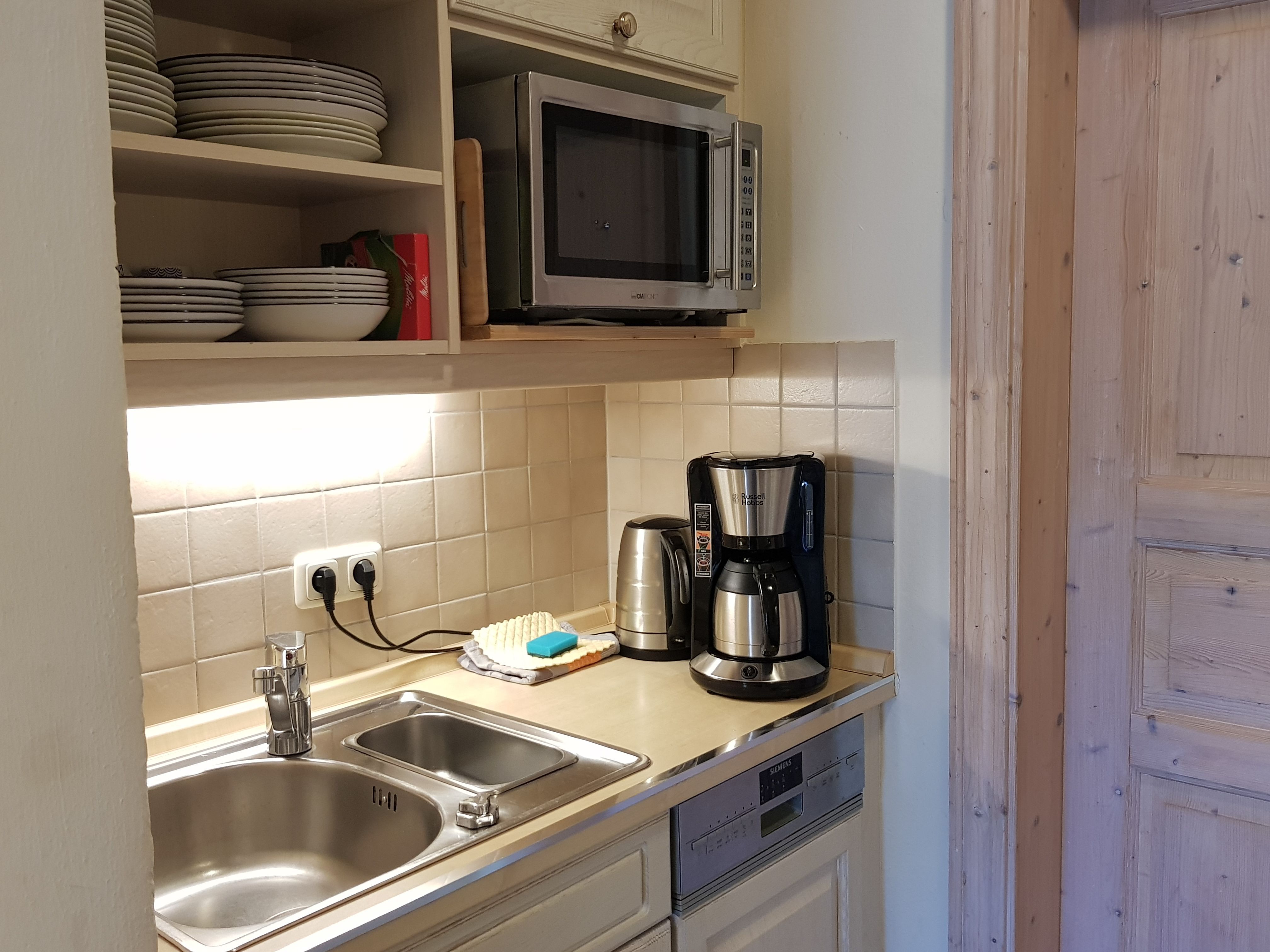 Die Küche in einem separaten Bereich bietet Ihnen jeglichen Komfort: Umfangreiche Ausstattung mit Geschirrspüler, Kühlschrank mit Gefrierfach, Kaffeemaschine, Wasserkocher, Toaster, Mikrowelle u.a.
