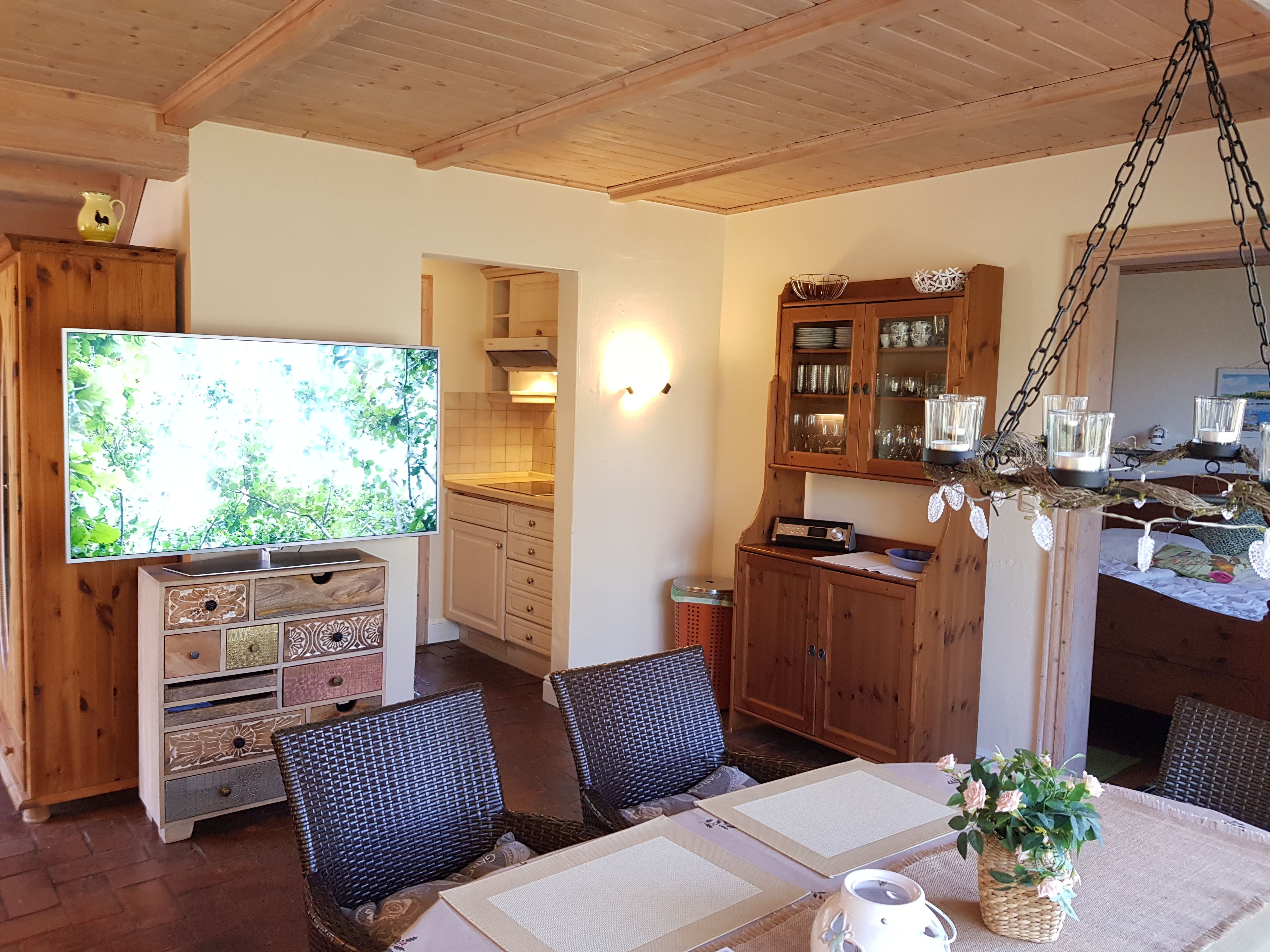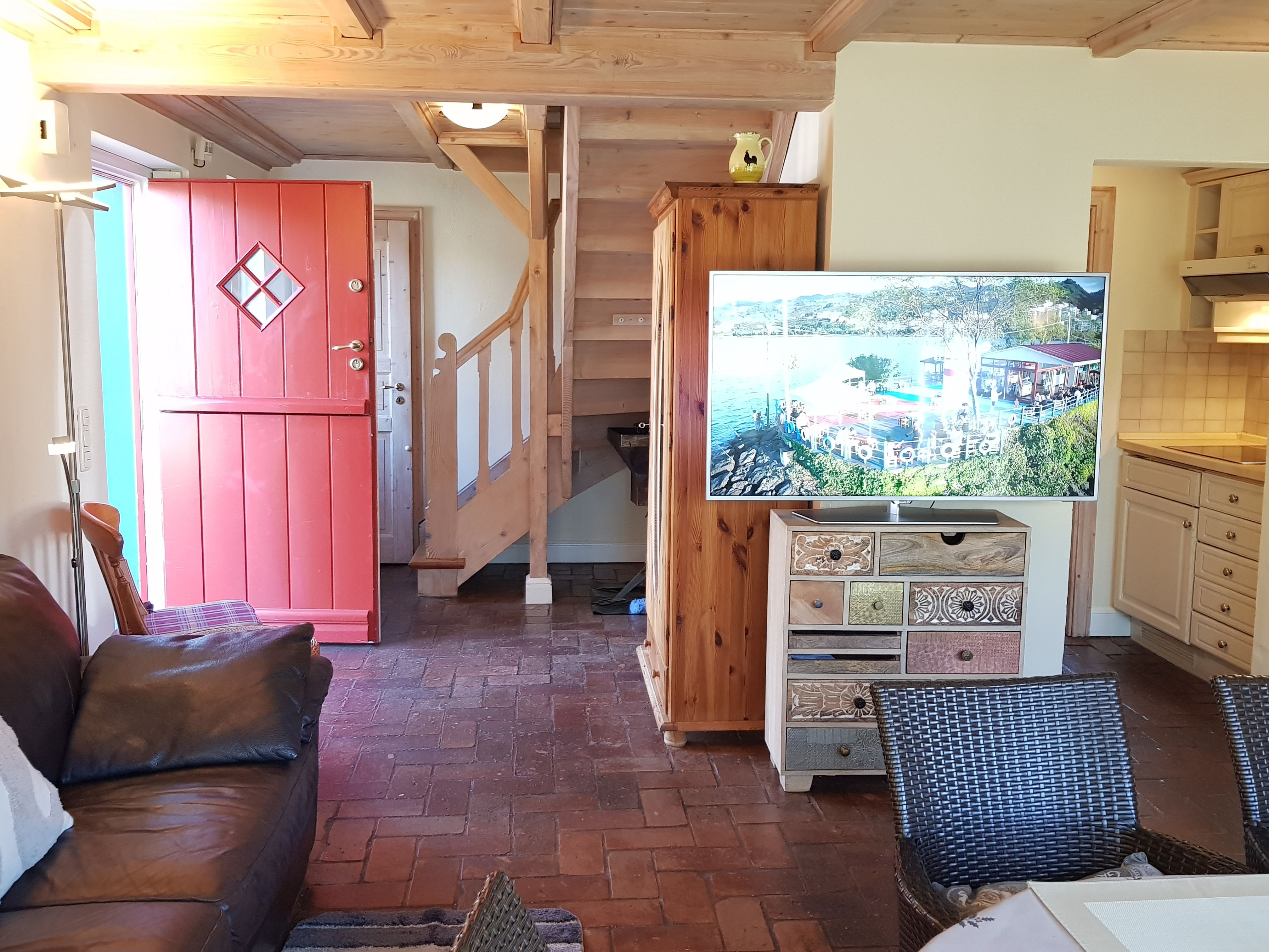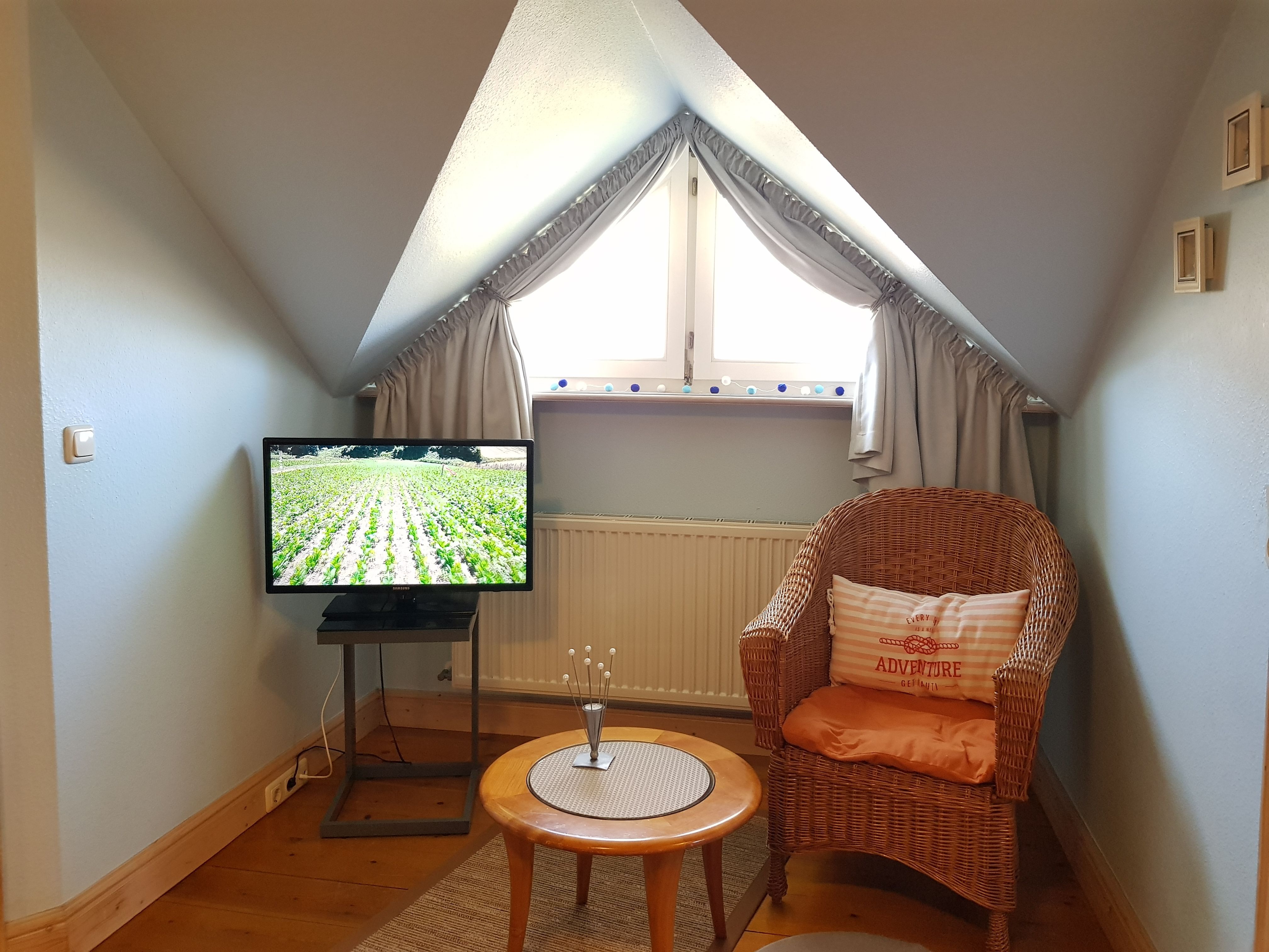 2 Schlafzimmer im Erdgeschoss (mit Doppelbett bzw. mit 2 Einzelbetten), 2 Schlafzimmer im Obergeschoss (mit Doppelbett bzw. mit Einzelbett), 2. Fernseher im Obergeschoss bei dem Schlafzimmer mit Doppelbett.
