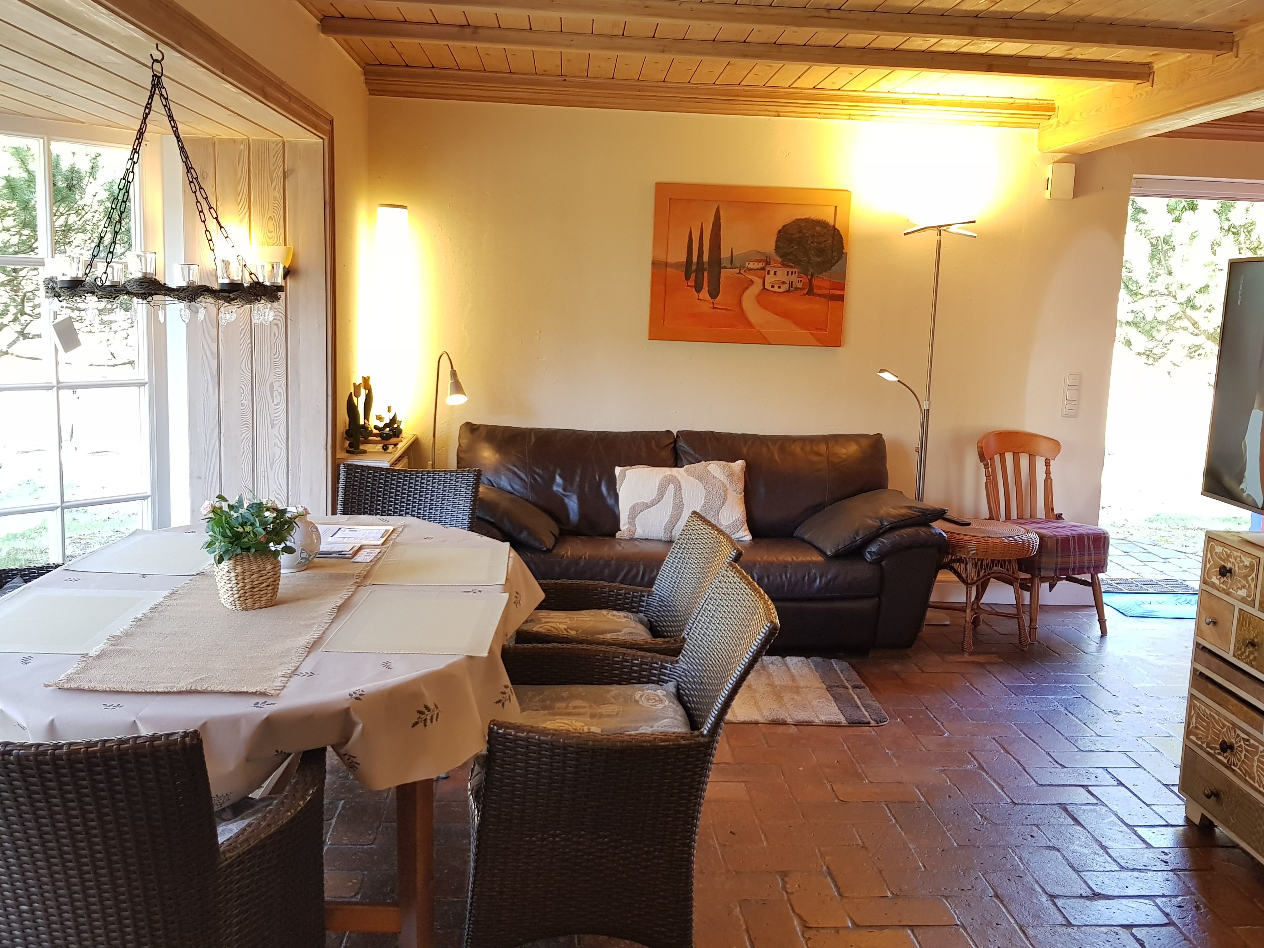 Das exklusive Strandhaus hinter der Düne ist in einem wohnlichen maritimen Stil eingerichtet mit Holzböden in den Schlafzimmern und chicen, hellen Holzdecken im Erdgeschoss. Das Strandhaus teilt sich auf in: großes Wohnzimmer, 4 Schlafzimmer (mit 7 Betten), 2 Bäder und Küche auf ca. 68 m² Wohnfläche. Am Esstisch im Wohnzimmer sitzen Sie direkt am großen, verglasten Panorama-Fenster und ein bequemes Ledersofa steht bereit. Ein großer 55 Flachbildfernseher mit Ambilight LED-Hintergrundbeleuchtung sorgt für ein tolles Bilderlebnis. Da der Fernseher mit Smart-TV Funktion über das Internet ausgestattet ist, genießen Sie immer beste Unterhaltung nach Ihren Wünschen. Ein Internetradio und kostenloser WLAN-Internetzugang ergänzen die Ausstattung.