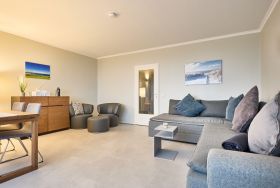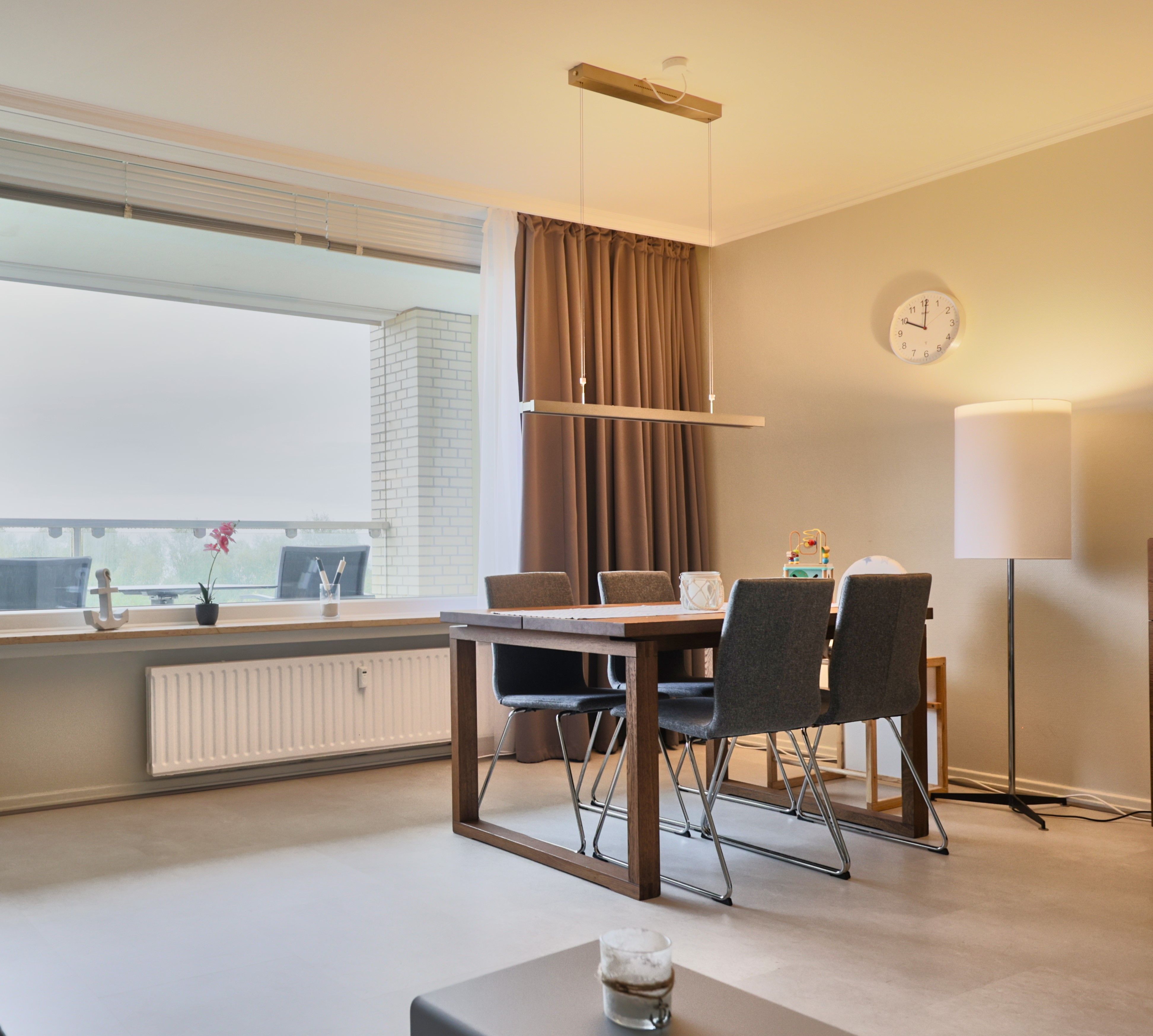Die Wohnung ist liebevoll eingerichtet und bietet Ihnen alles, was Sie für einen angenehmen Aufenthalt benötigen. Die separate, gut ausgestattete Küche ermöglicht Ihnen die Zubereitung Ihrer Lieblingsgerichte. Das moderne Duschbad mit WC sorgt für den nötigen Komfort. Im Schlafzimmer erwarten Sie zwei gemütliche Einzelbetten, ein geräumiger Kleiderschrank und ein Schreibtisch, der Ihnen auch im Urlaub einen ruhigen Arbeitsplatz bietet. Der großzügige Wohn- und Essbereich lädt mit einer bequemen Couch zum Entspannen ein, während der Esstisch am Fenster mit Blick auf die Nordsee perfekt für gemütliche Mahlzeiten oder einen Spieleabend ist. Der TV lässt sich schwenken und Sie von verschiedenen Plätzen gut sehen.