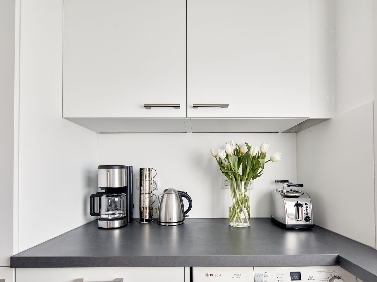 Das Schlafzimmer bietet ein komfortables Boxspringbett, TV und verdunkelbare Gardinen. Die moderne Küche mit Geschirrspüler und Waschmaschine ist stilvoll und praktisch eingerichtet. Ein kleines, komfortables Bad mit ebenerdiger Dusche und WC ergänzt diese Etage.