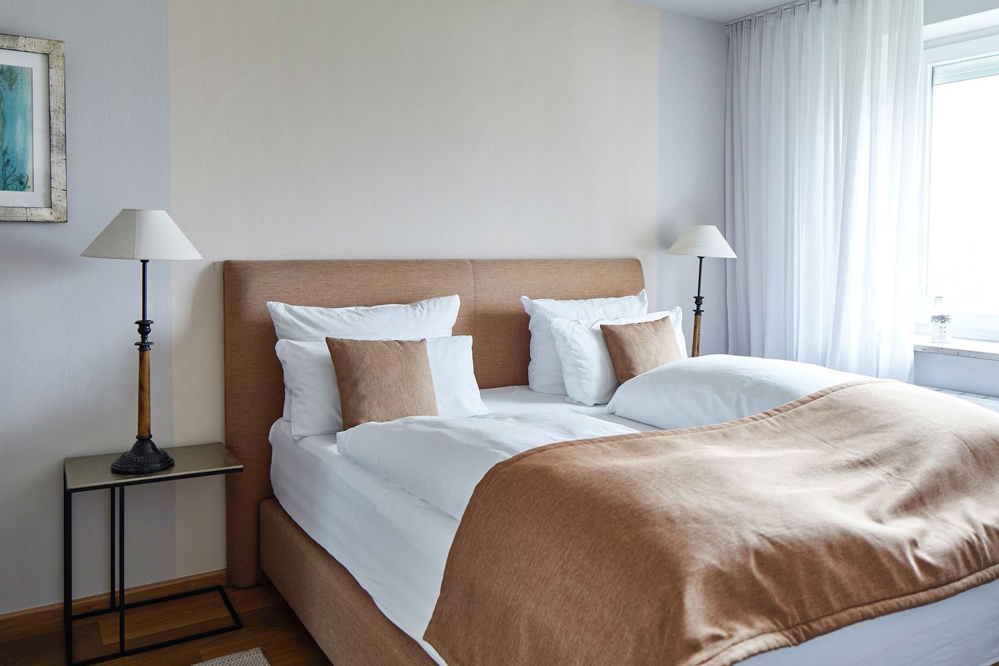 Das ruhige Schlafzimmer mit hochwertigem Boxspringbett und zweitem TV sorgt für erholsamen Schlaf und angenehme Rückzugsmomente.