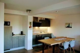 offene Küche mit Vollausstattung (Herd, Kühlschrank, Mikrowelle, Kaffeemaschine, Wasserkocher, Toaster sowie Geschirr und Besteck)