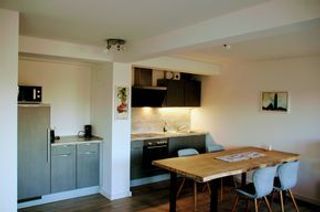 Die integrierte moderne Küchenzeile verfügt über einen Backofen und ein Ceran-Kochfeld mit 4 Flächen, Kühlschrank, Mikrowelle mit Grillfunktion, Geschirrspüler, Kaffeemaschine, Wasserkocher, Toaster sowie Geschirr und Besteck.