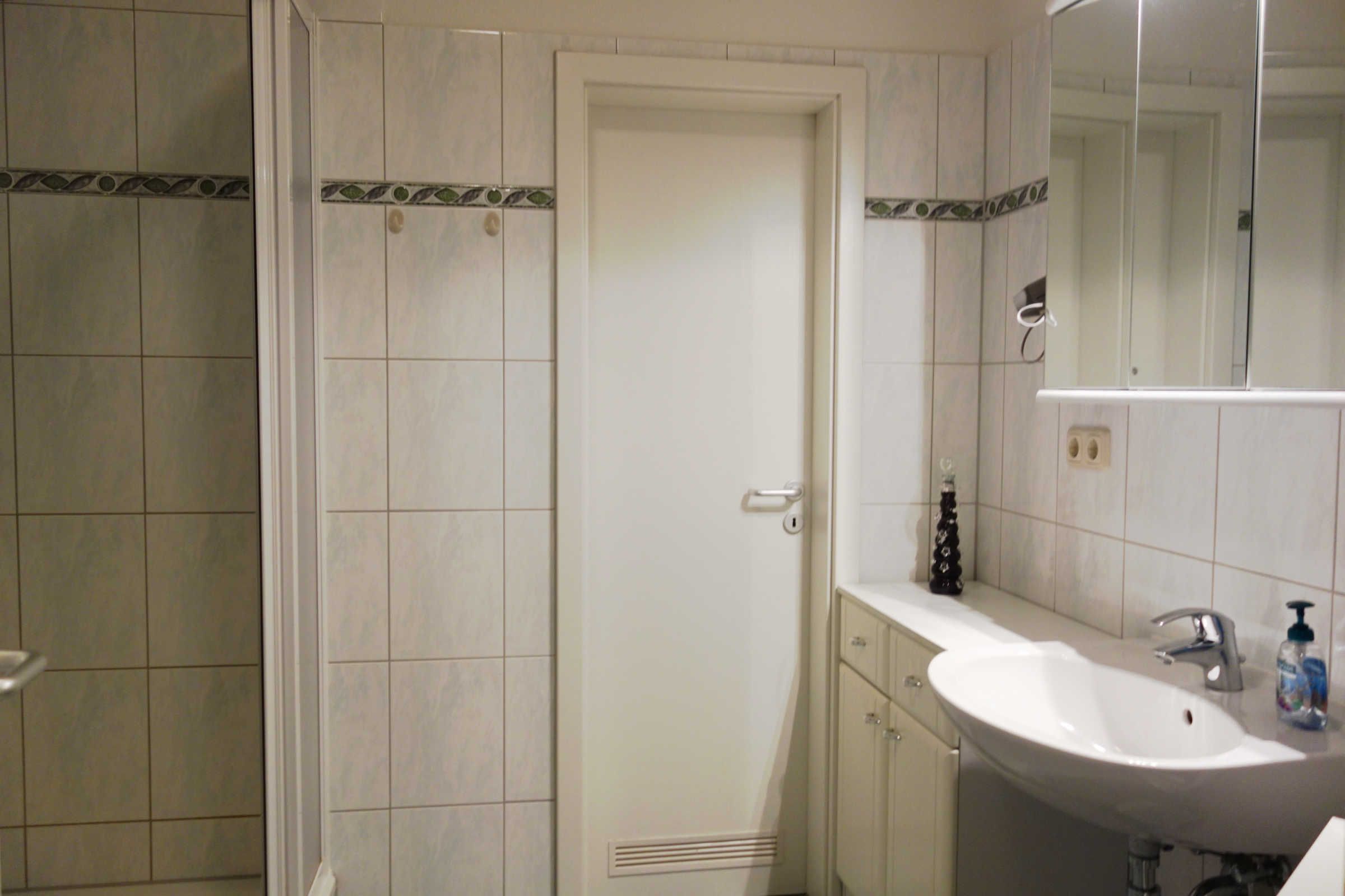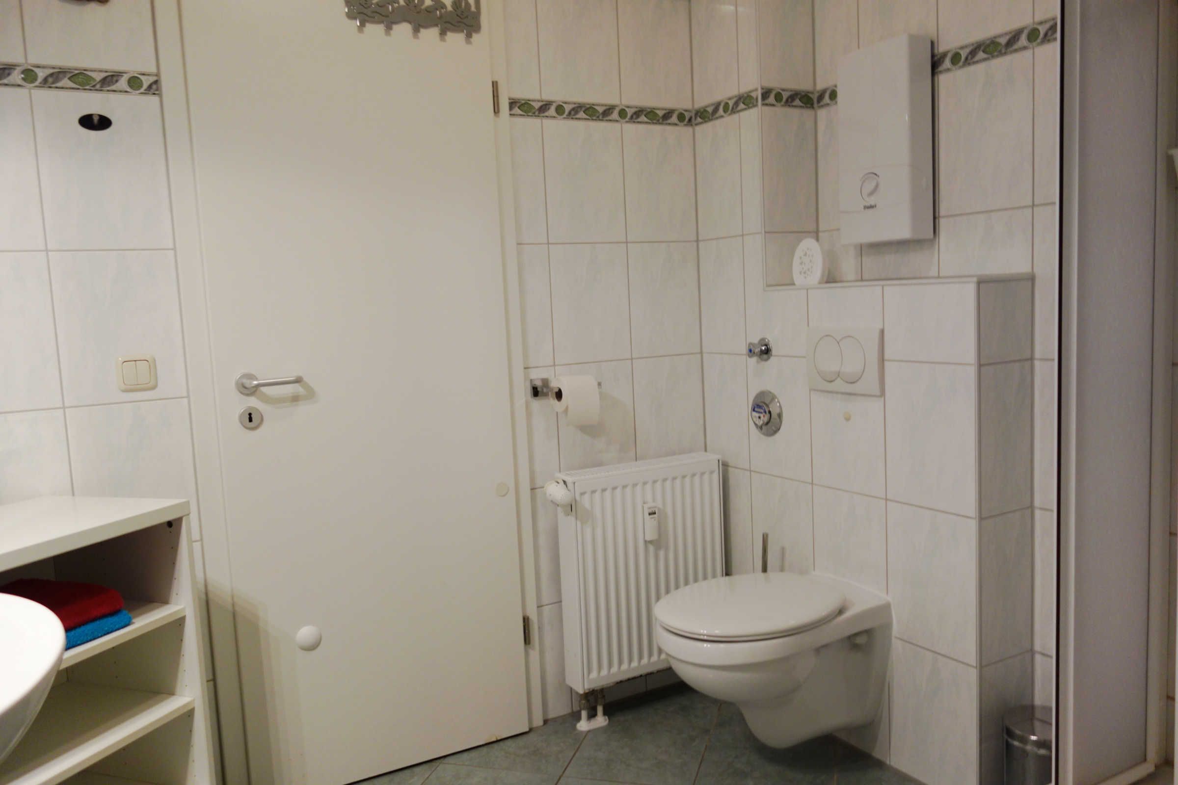 Das Bad verfügt über eine Dusche, einen Waschtisch und ein WC.