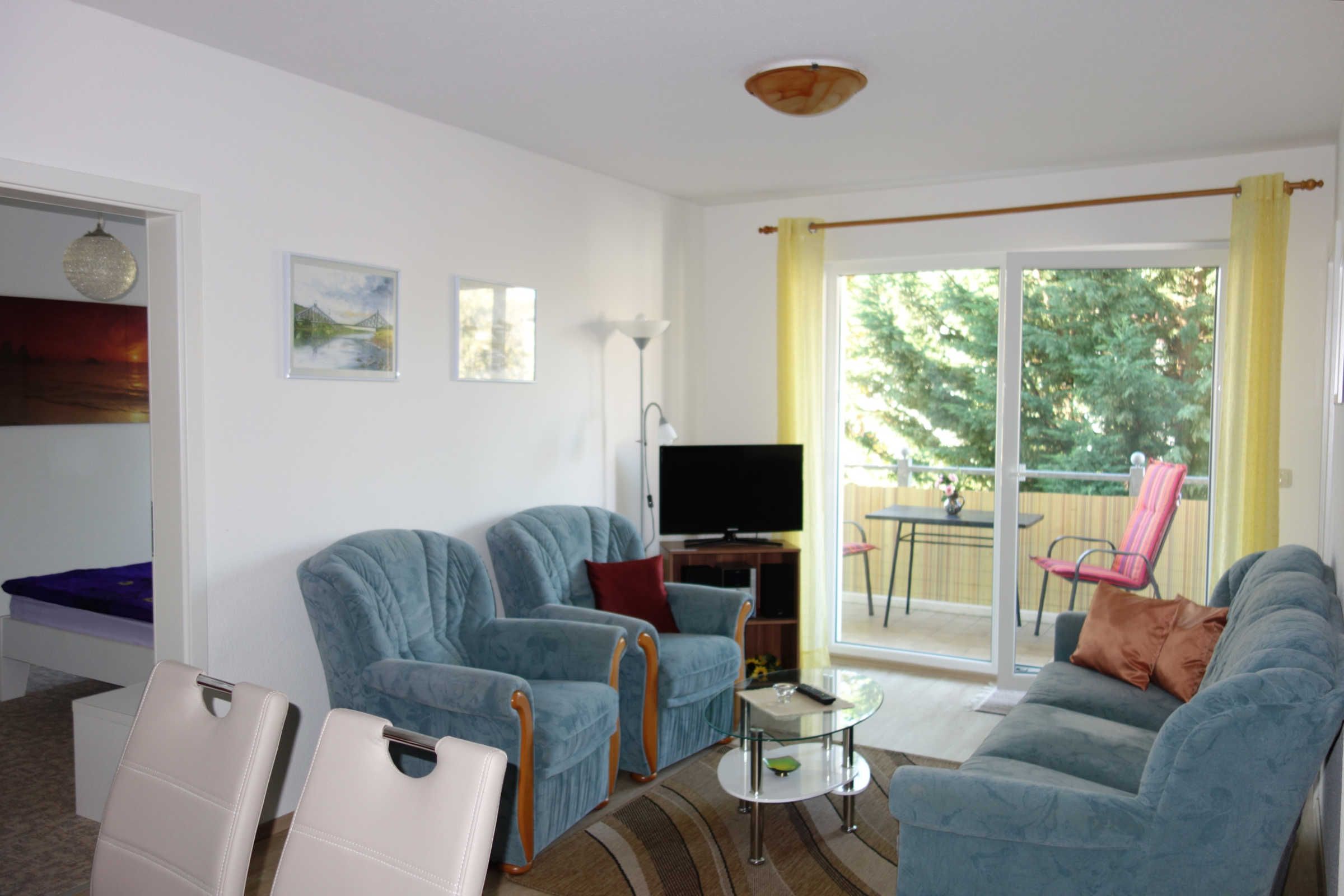 Im Wohnzimmer stehen eine Couch, 2 Sessel sowie ein Flachbildfernseher und ein Radio mit CD-Player.