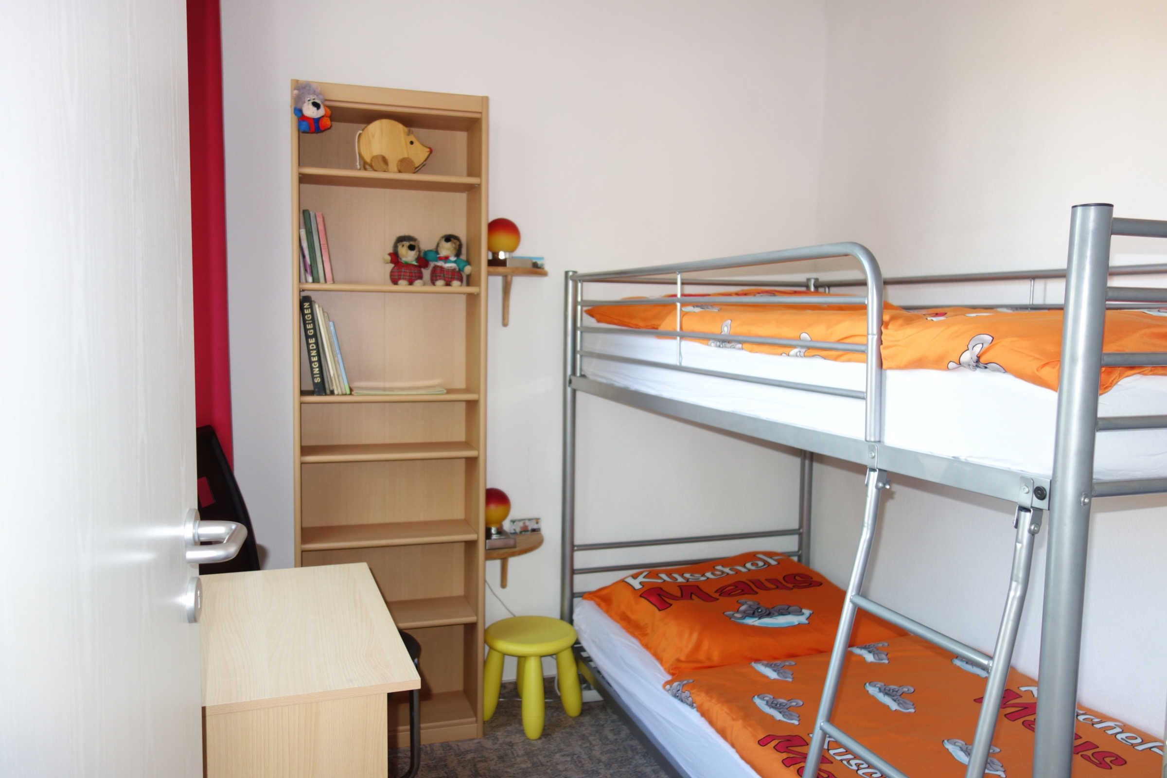 Das kleinere Schlafzimmer hat ein Etagenbett, einen kleinen Schreibtisch und ein Regal.
