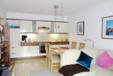 Die offene Küche verfügt über ein Cerankochfeld (4 Kochfelder), Backofen, Kühlschrank mit Gefrierfach, Geschirrspüler, Wasserkocher und Kaffeemaschine sowie über einen Esstisch mit 4 Stühlen.