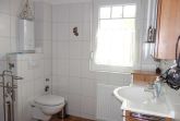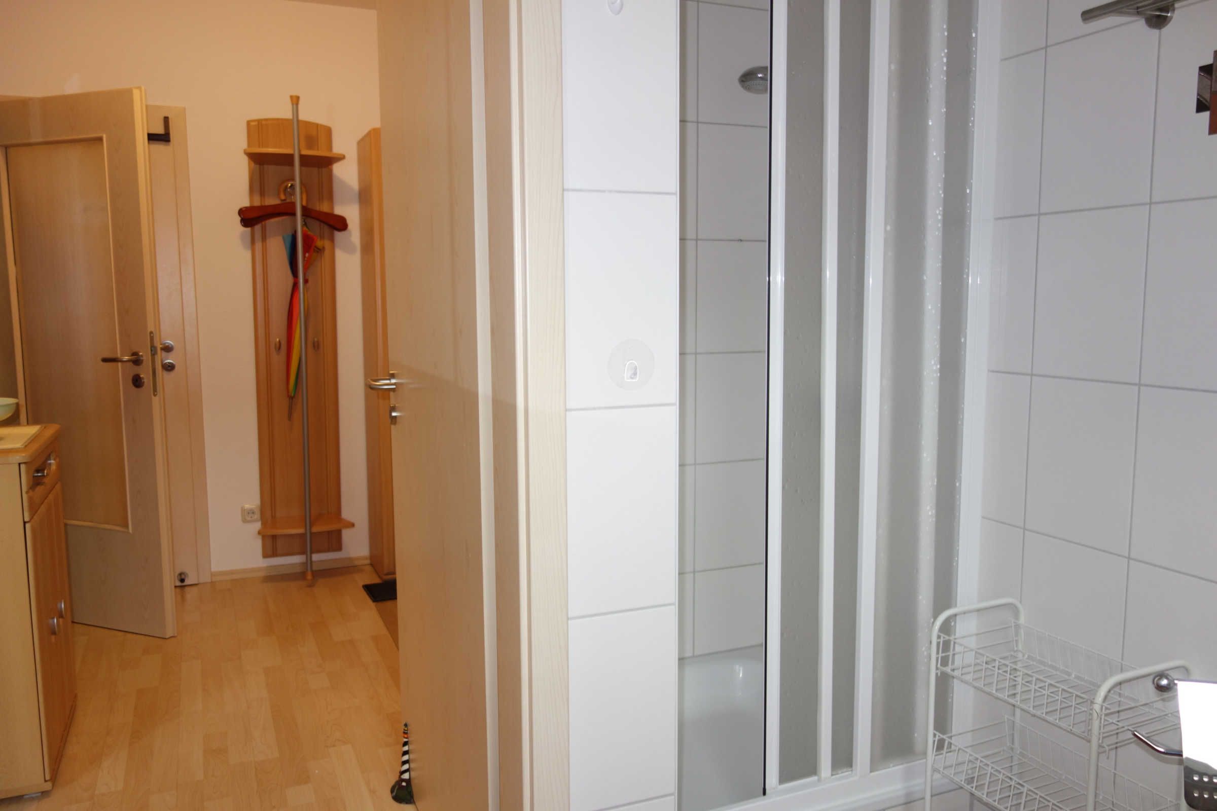 Das helle Bad mit Fenster ist mit Dusche, Waschtisch, Fön und einem WC ausgestattet.