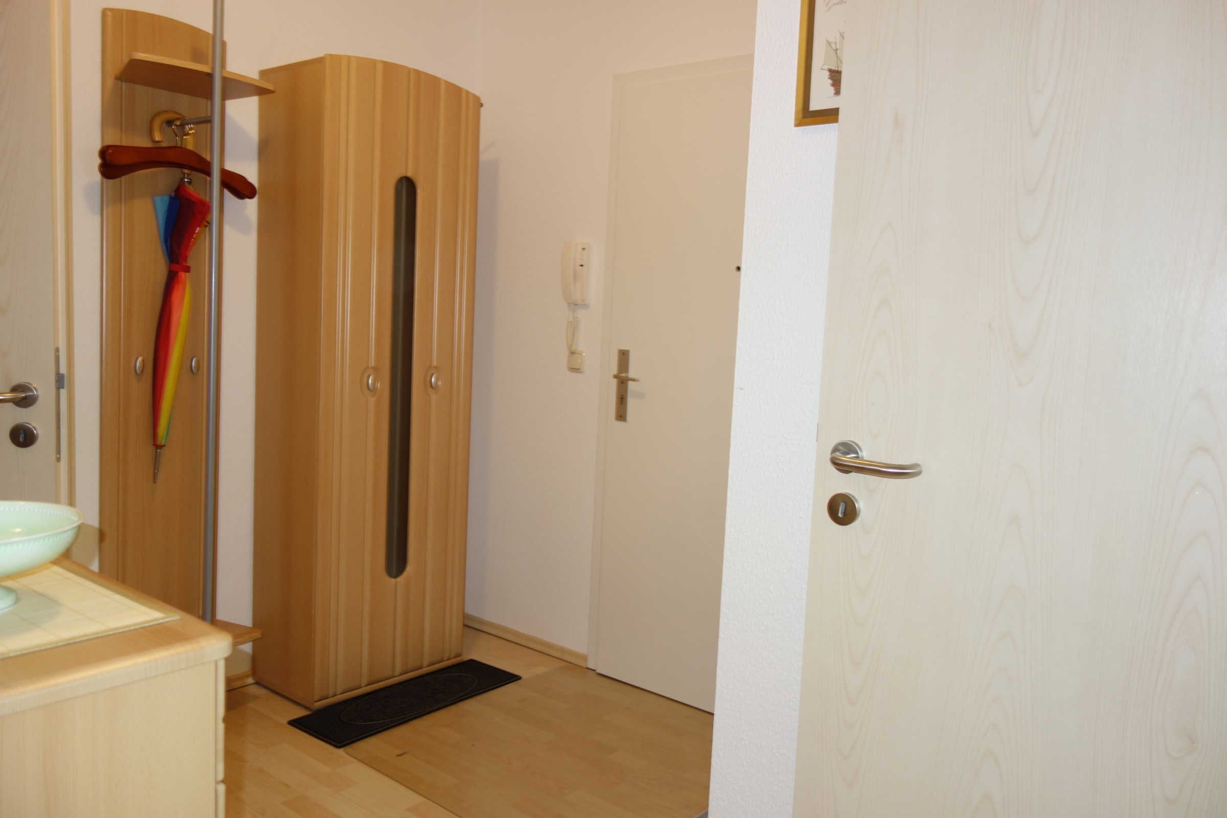 Im Flur stehen Garderobe, Schrank, Spiegel und Schuhschrank.