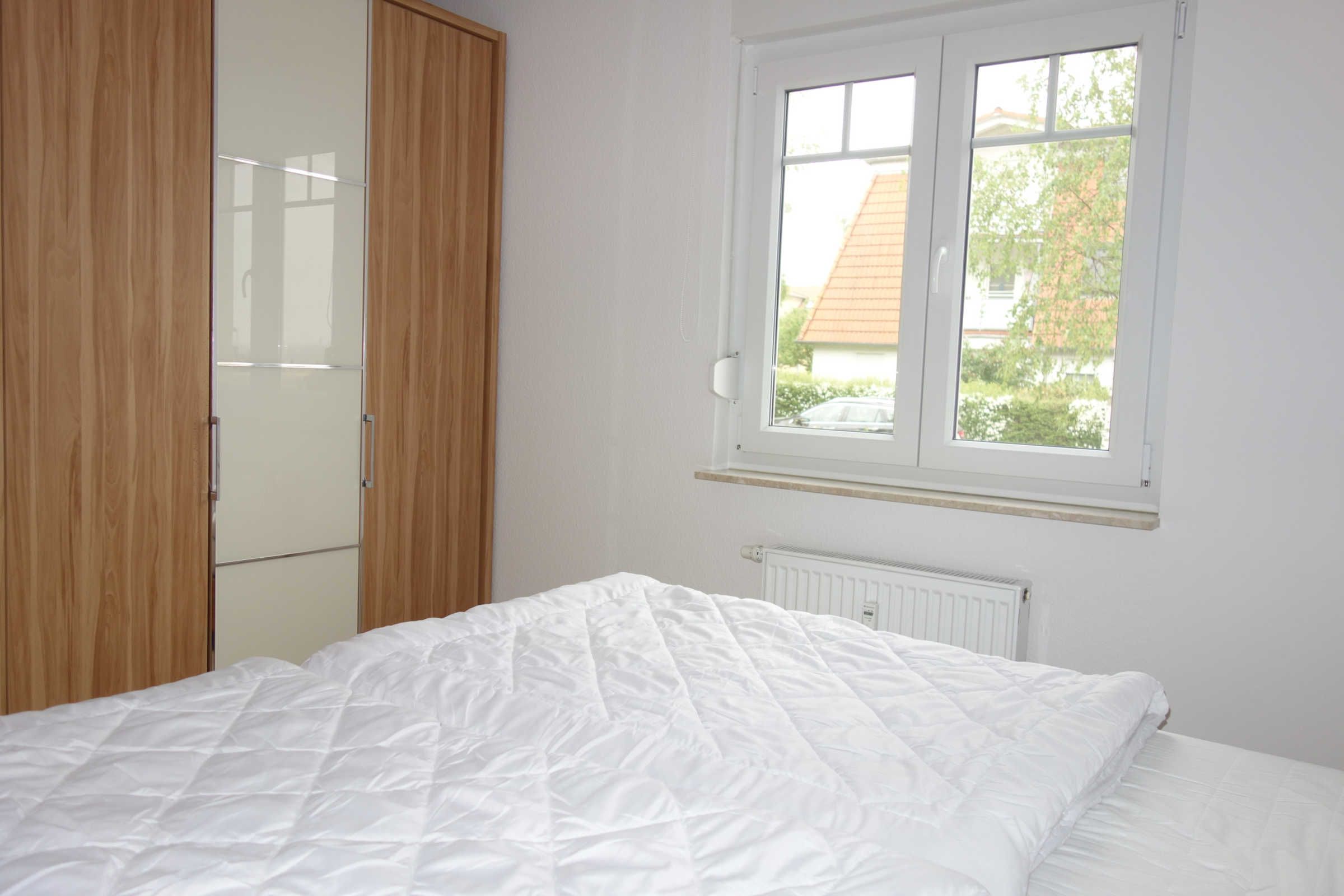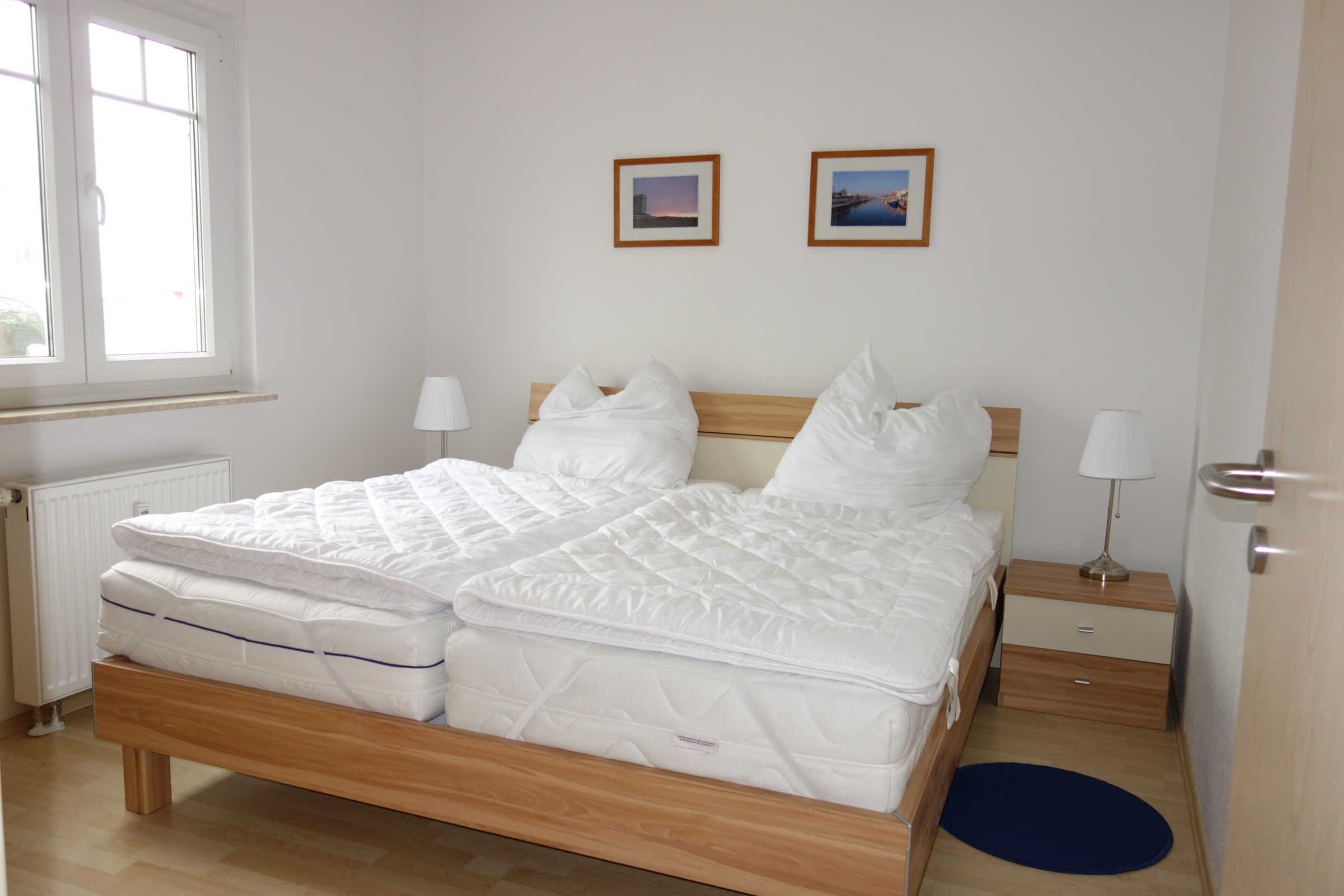 Im Schlafzimmer stehen ein Doppelbett (2 Matratzen mit 90 x 200 cm) und ein Kleiderschrank.