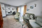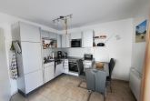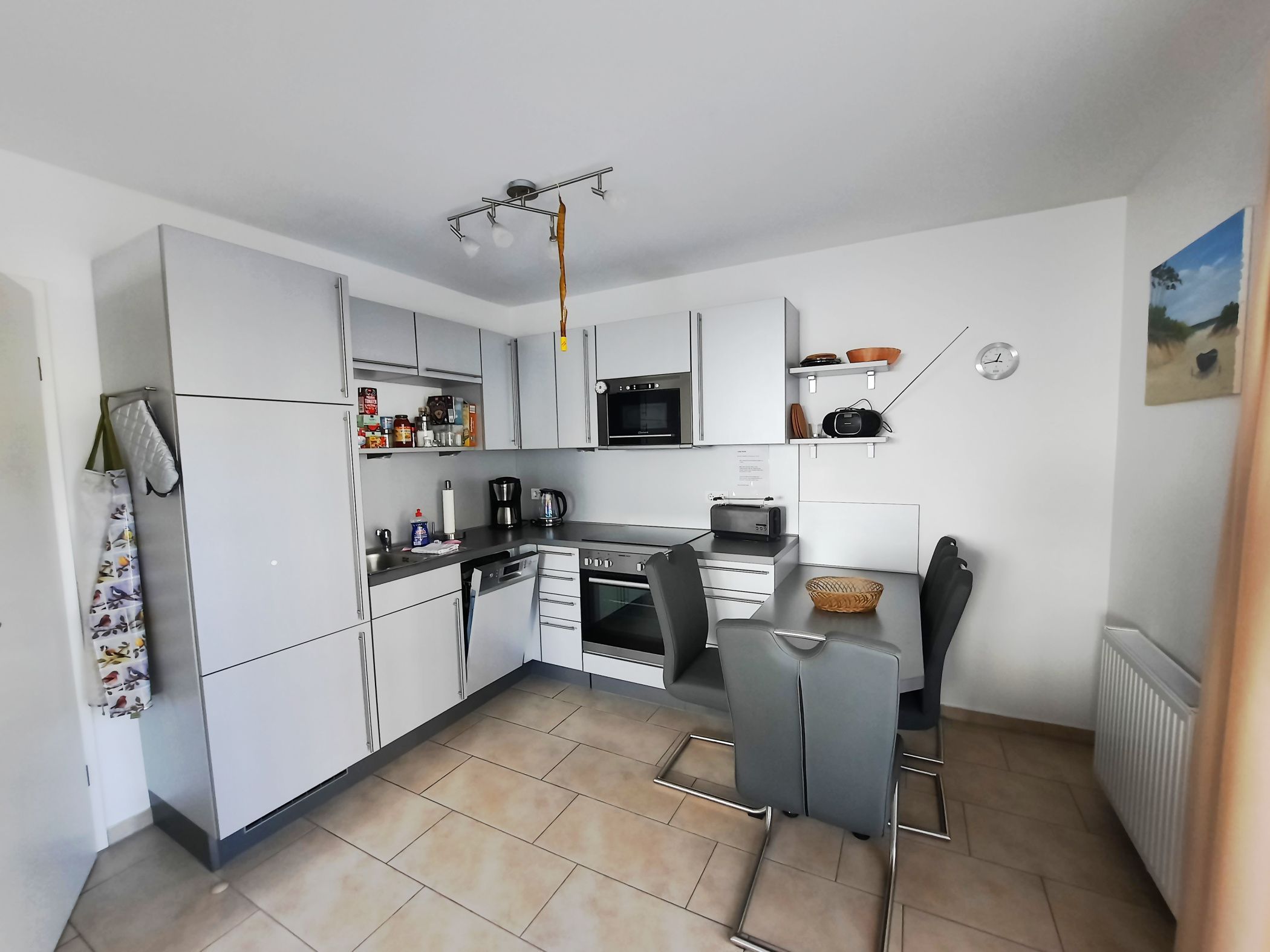 Die in das Wohnzimmer integrierte Küche ist komplett ausgestattet u.a. mit Ceranherd mit 4 Kochfeldern und Backofen , einem Geschirrspüler, einem Kühlschrank mit einem Gefrierfach, einer Mikrowelle, einer Kaffeemaschine und einem Wasserkocher. Zusätzlich sind noch ein Rührgerät mit Pürierstab und eine Küchenmaschine (zum raspeln) vorhanden.