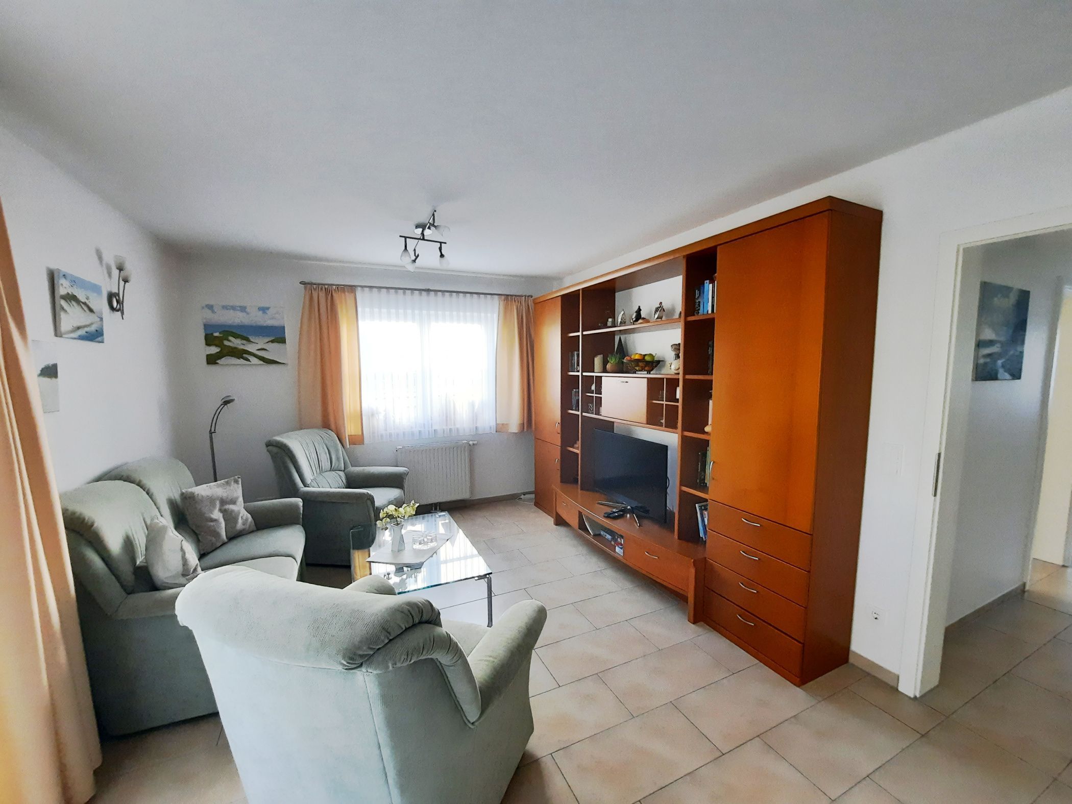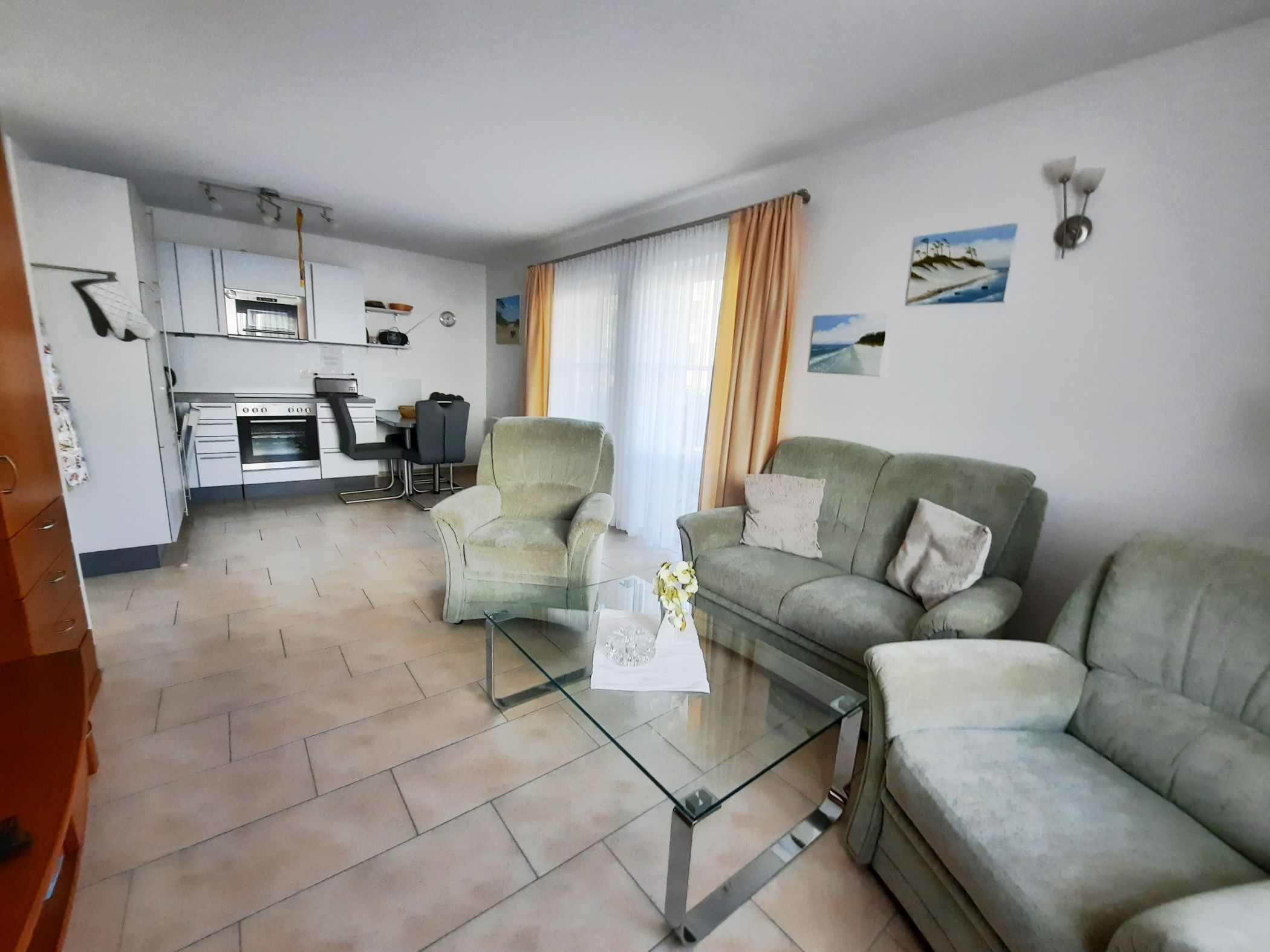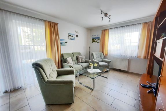Ihre helle Ferienwohnung verfügt über ein Wohn- und zwei Schlafzimmer. Im schönem Wohnbereich befindet sich eine Couch, 2 Sessel sowie ein Flachbildfernseher, ein DVD-Player und ein Radio.