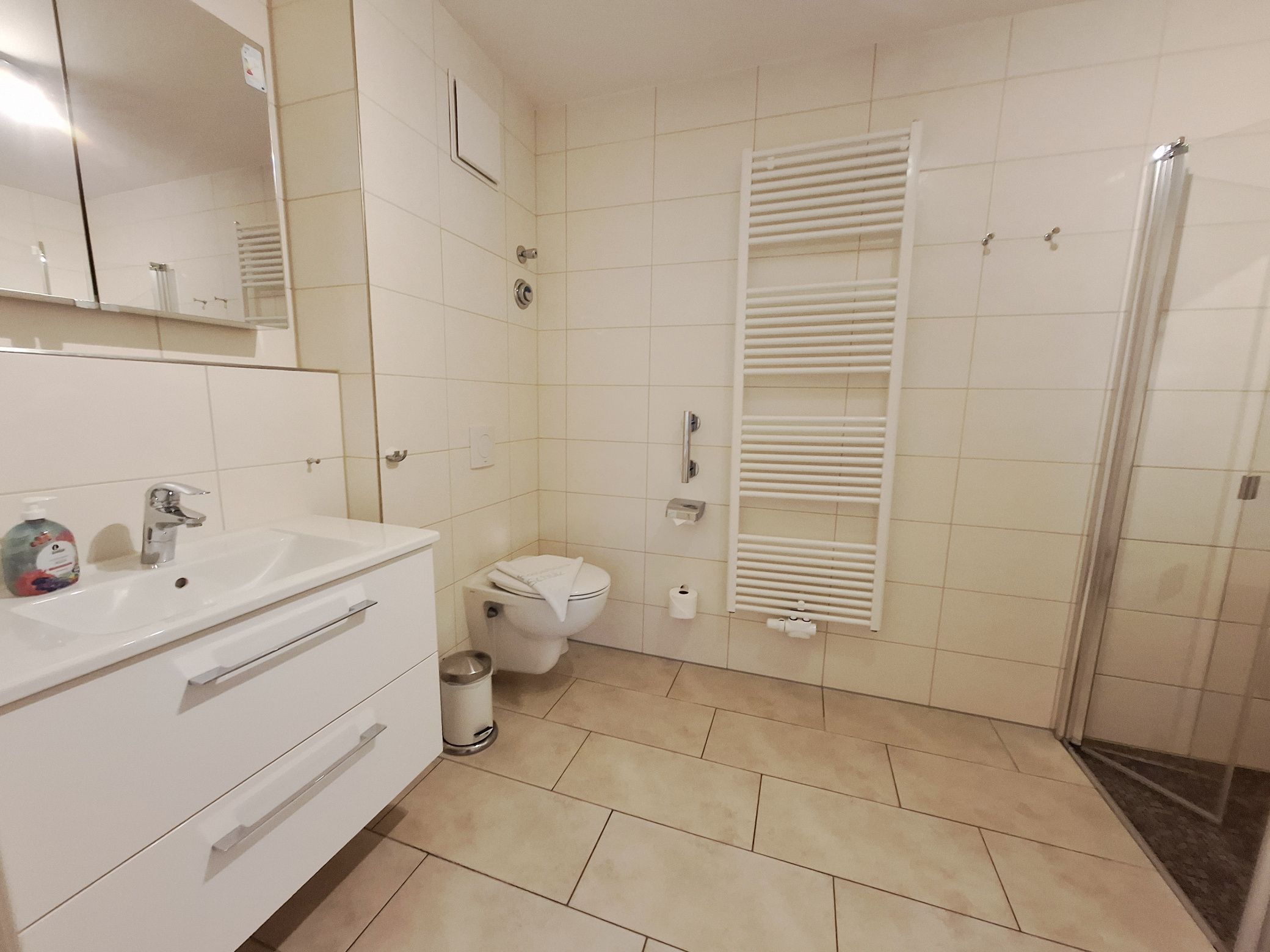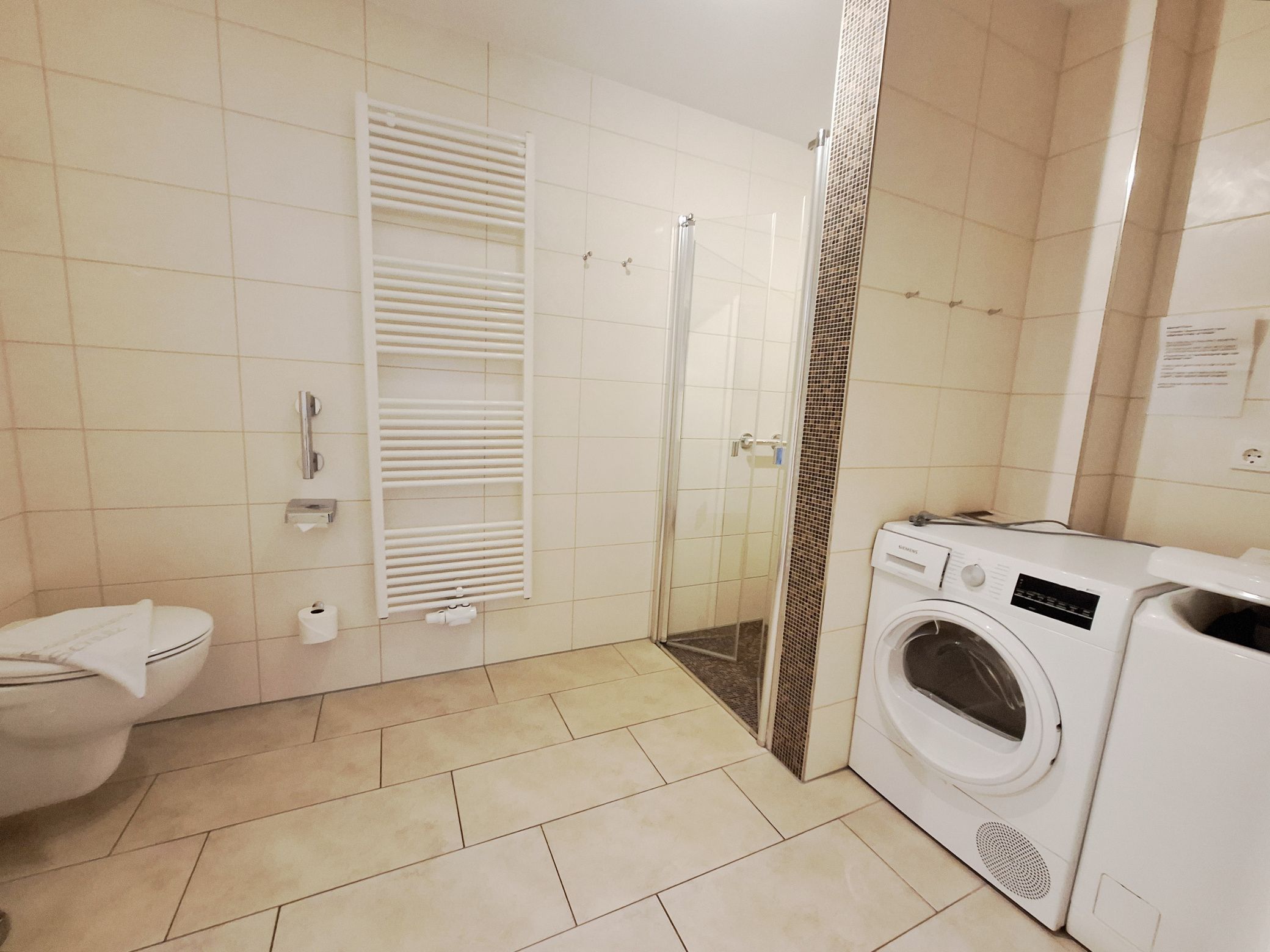 Das große Bad hat eine ebenerdige Dusche, eine Waschmaschine, einen Trockner, einen Waschtisch, einen Föhn und ein WC.