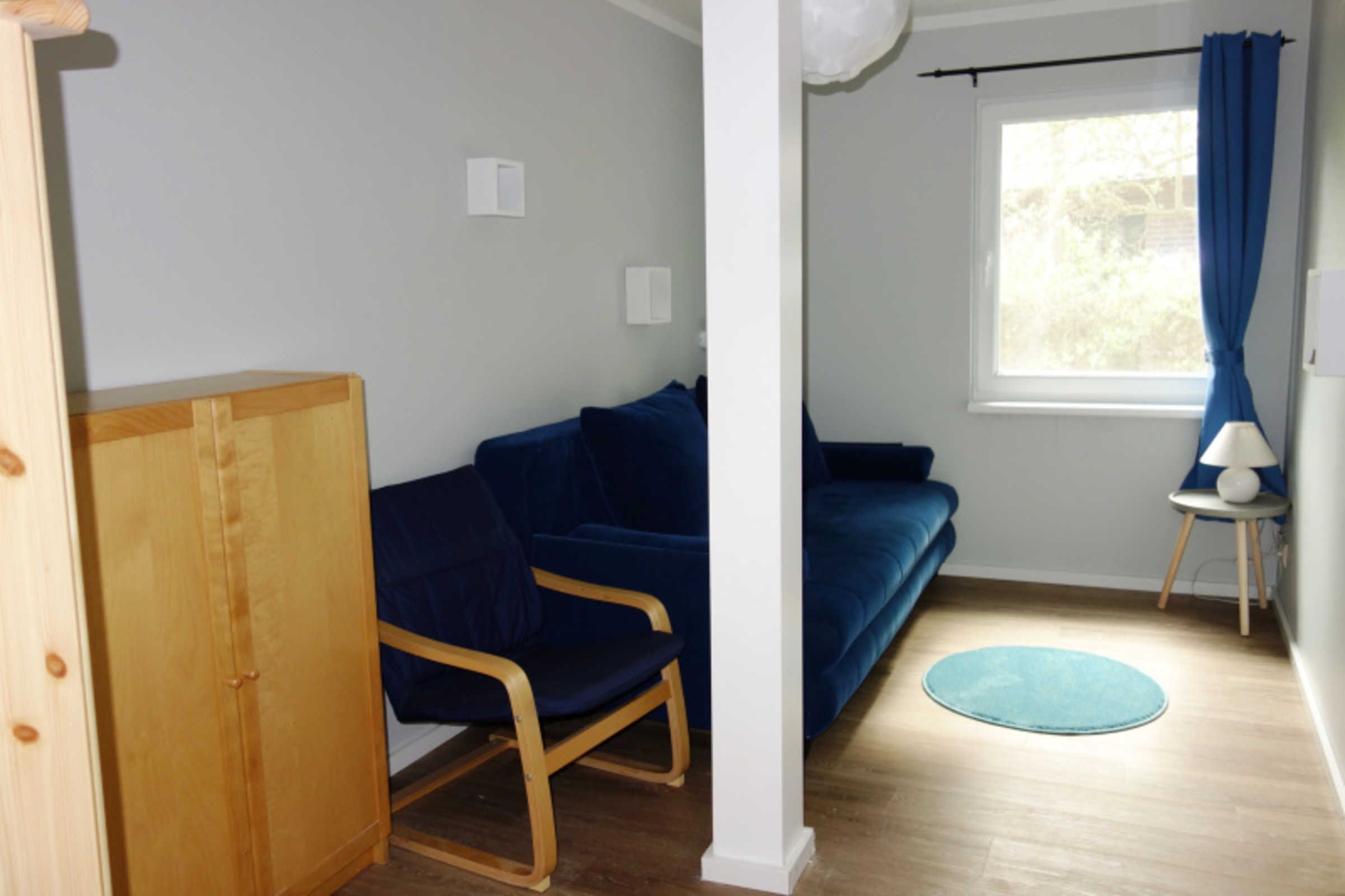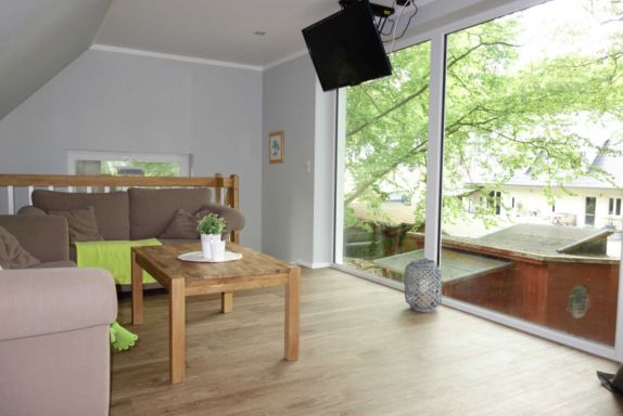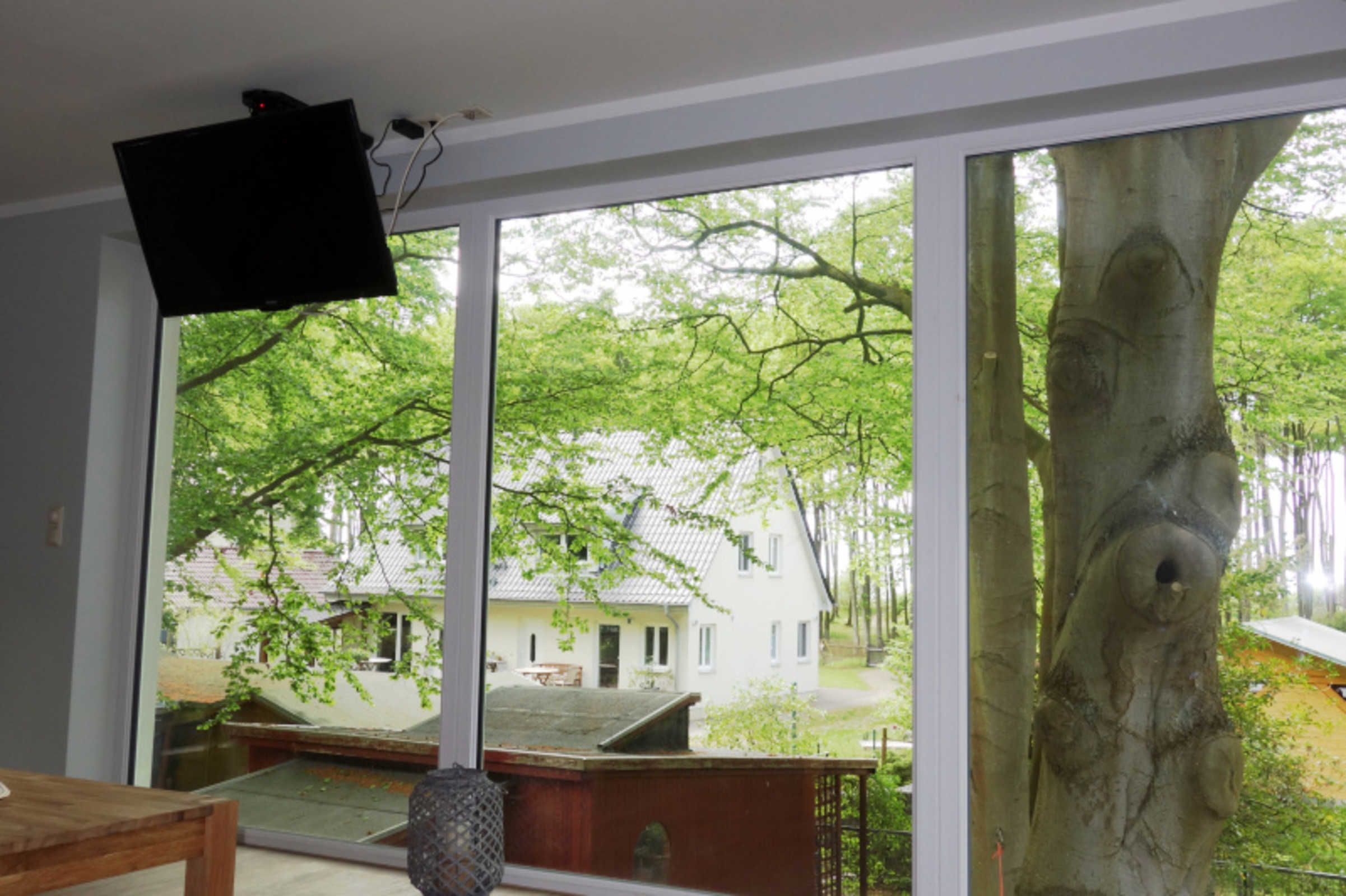 Im Wohnzimmer ist ein großes Panoramafenster durch welches man die Ostsee ein wenig sehen kann.