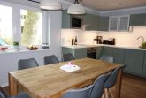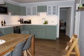 Die moderne Küche ist ausgestattet mit Side-by-Side-Kühlschrank, Induktionskochfeld, Backofen, Mikrowelle, Geschirrspüler und Kaffee- sowie einem Wasserkocher.