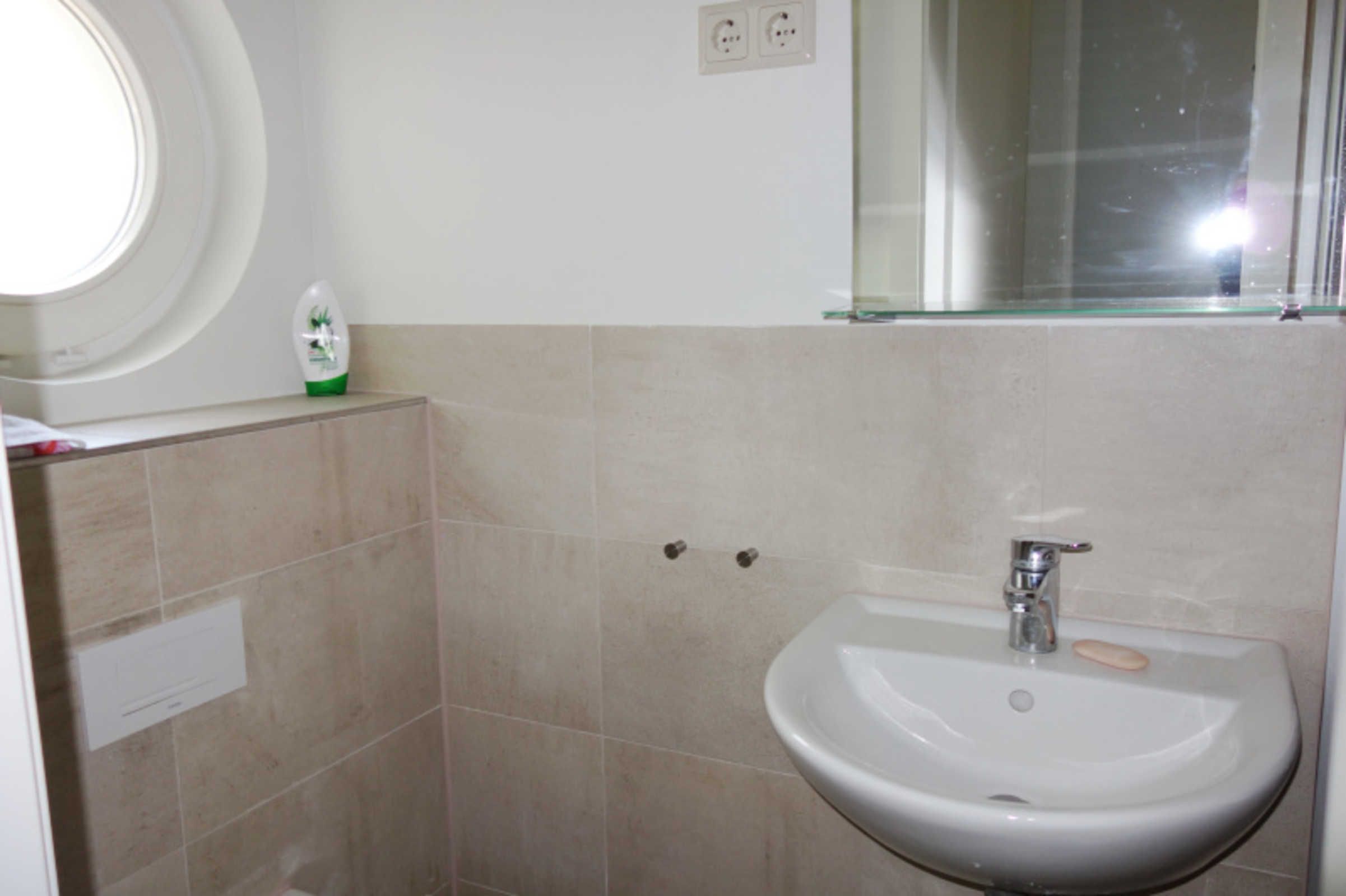 In den beiden modern ausgestatteten Bädern befindet sich je eine Dusche, eine Toilette und ein Waschbecken bzw. im größeren Bad ein Doppel- Waschtisch.