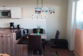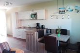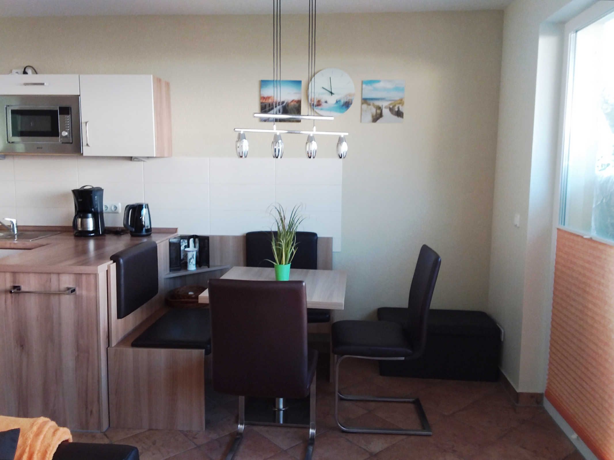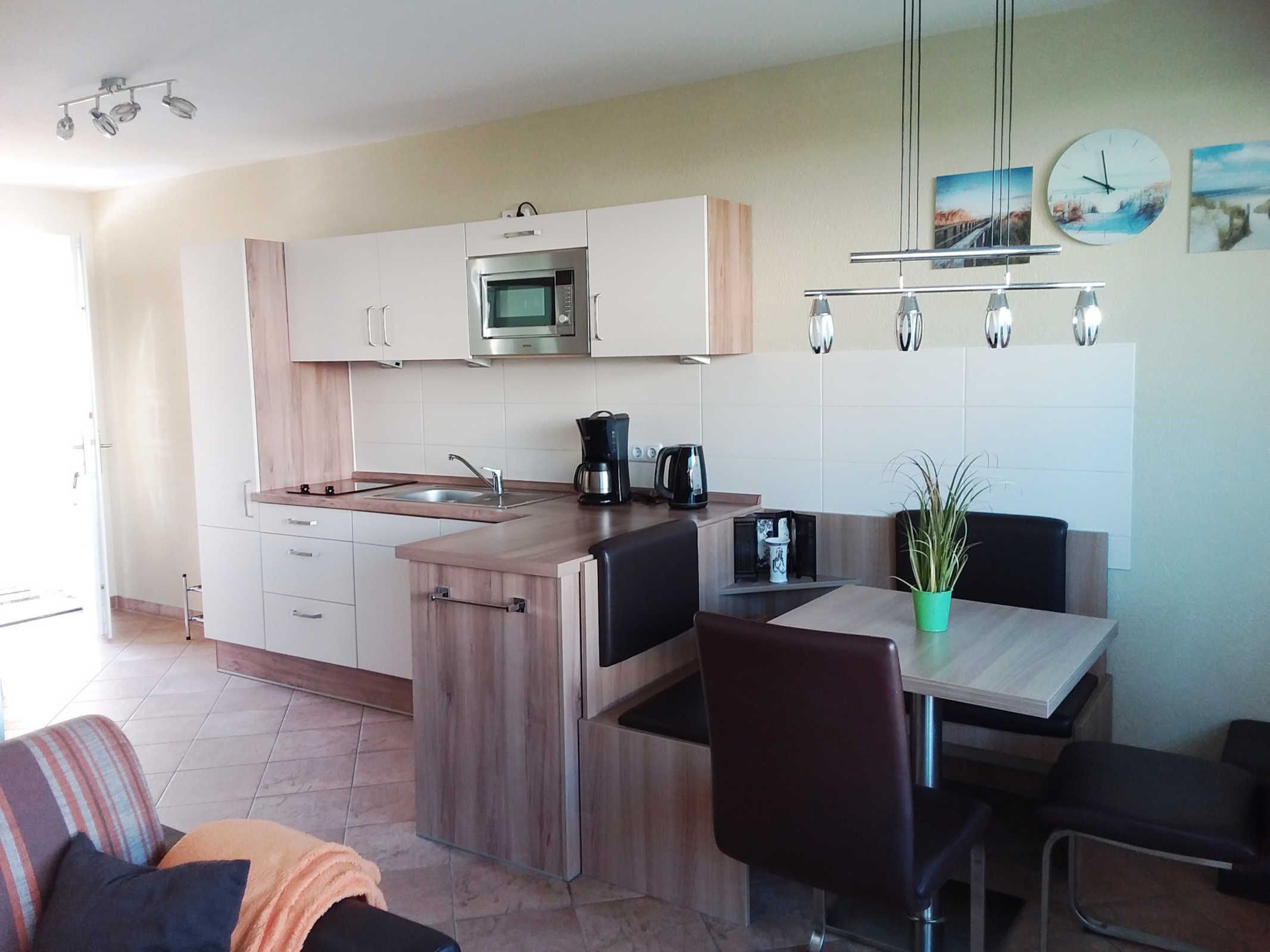 Die in das Wohnzimmer integrierte Küchenzeile ist u.a. mit einem Kühlschrank mit Gefrierfach, einem Ceranfeld mit 2 Kochfeldern, einer Mikrowelle, einem Wasserkocher und einer Kaffeemaschine sowie einem Esstisch, einer Essbank und 2 Stühlen ausgestattet.