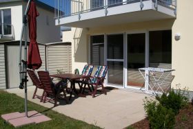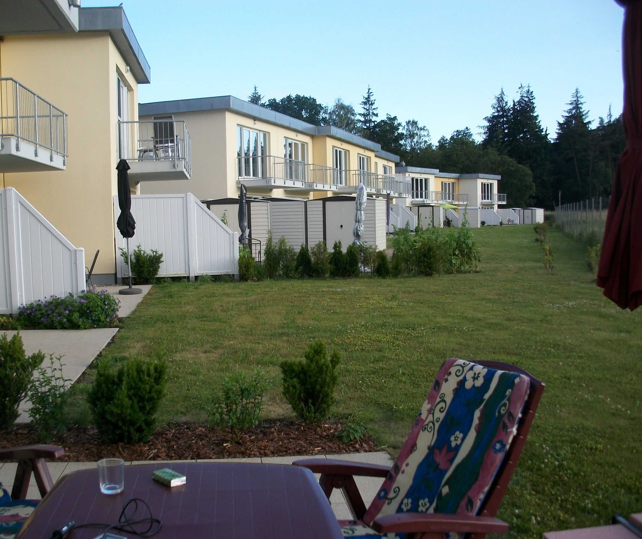 Zu der Ferienwohnung gehören eine große Terrasse mit Gartenmöbeln, Strandkorb und Sonnenschirm.sowie eine Fahrradbox zum Unterstellen von Fahrrädern.